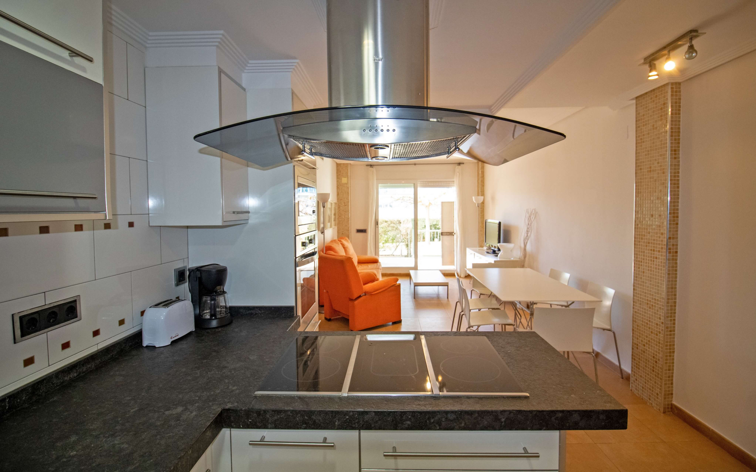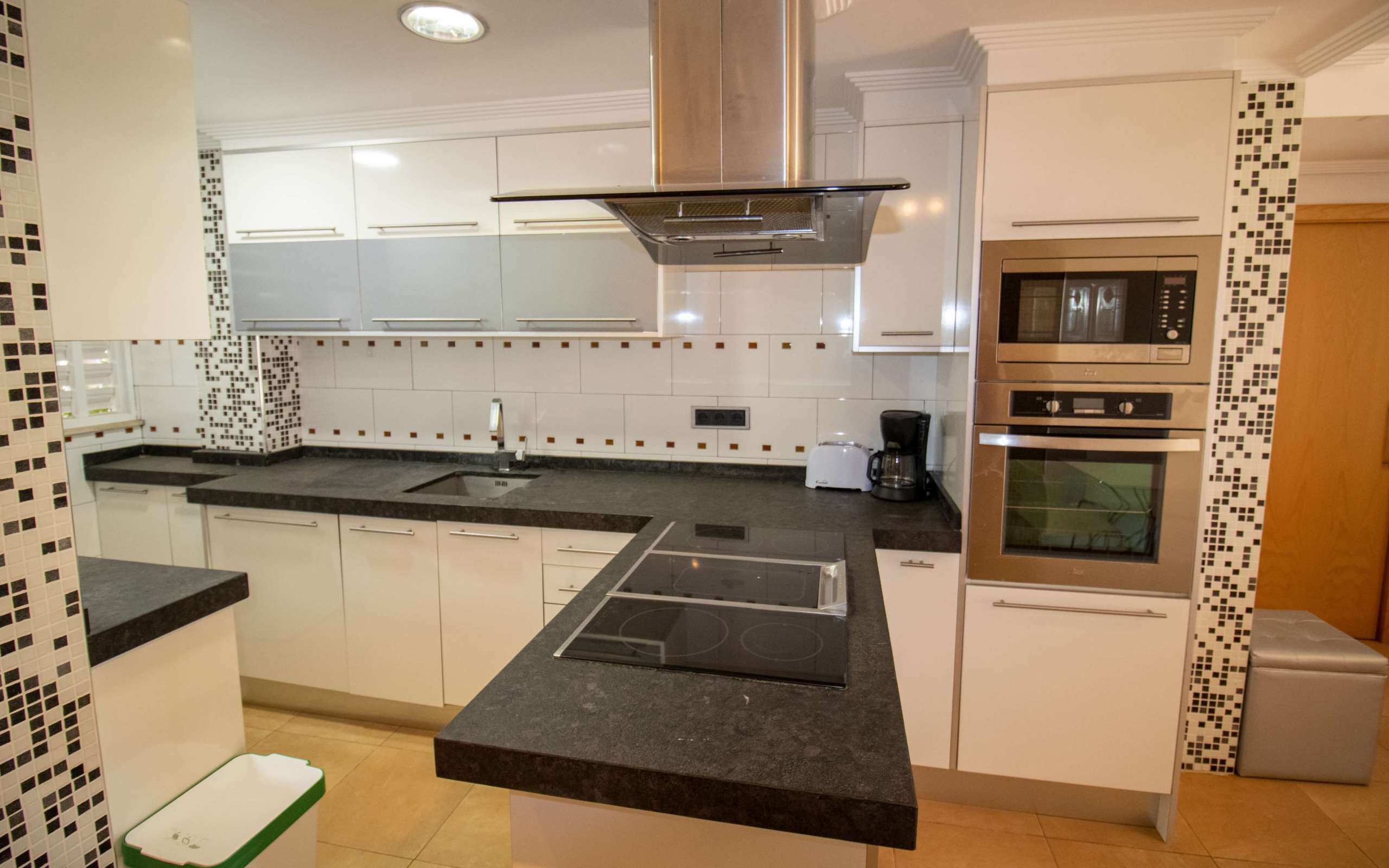 La cocina americana, de vitrocerámica, está equipada con nevera, microondas, horno, congelador, lavadora, utensilios/cocina, cafetera y tostadora.