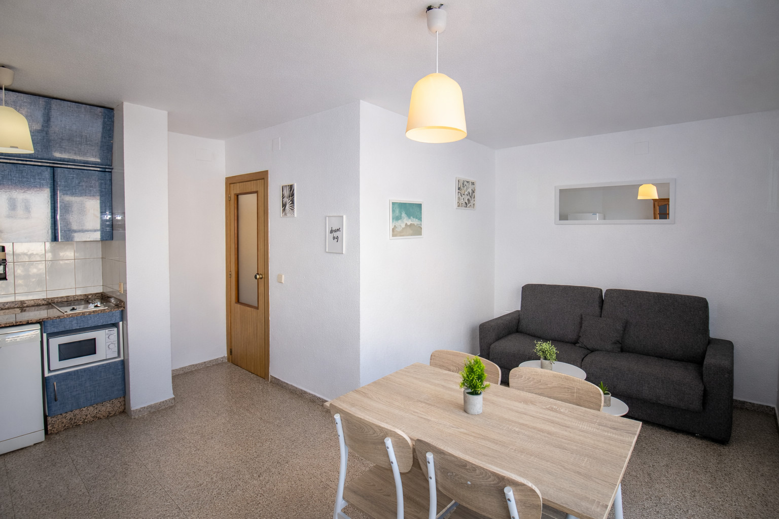 Cocina equipada para el día a día y zona de estar para descansar tras la playa. Incluye aire acondicionado y wifi, ideales tanto para vacaciones como para estancias más largas.