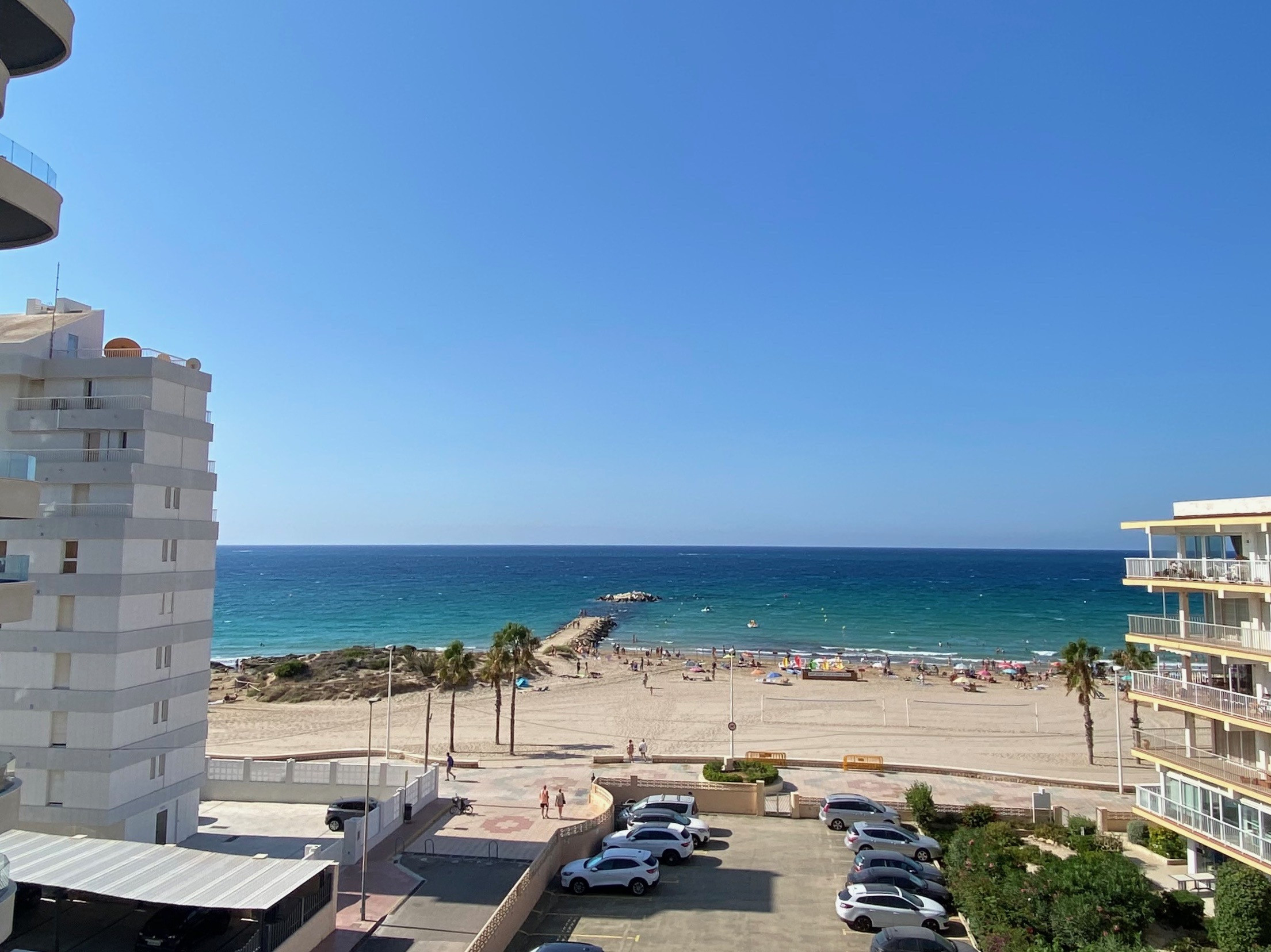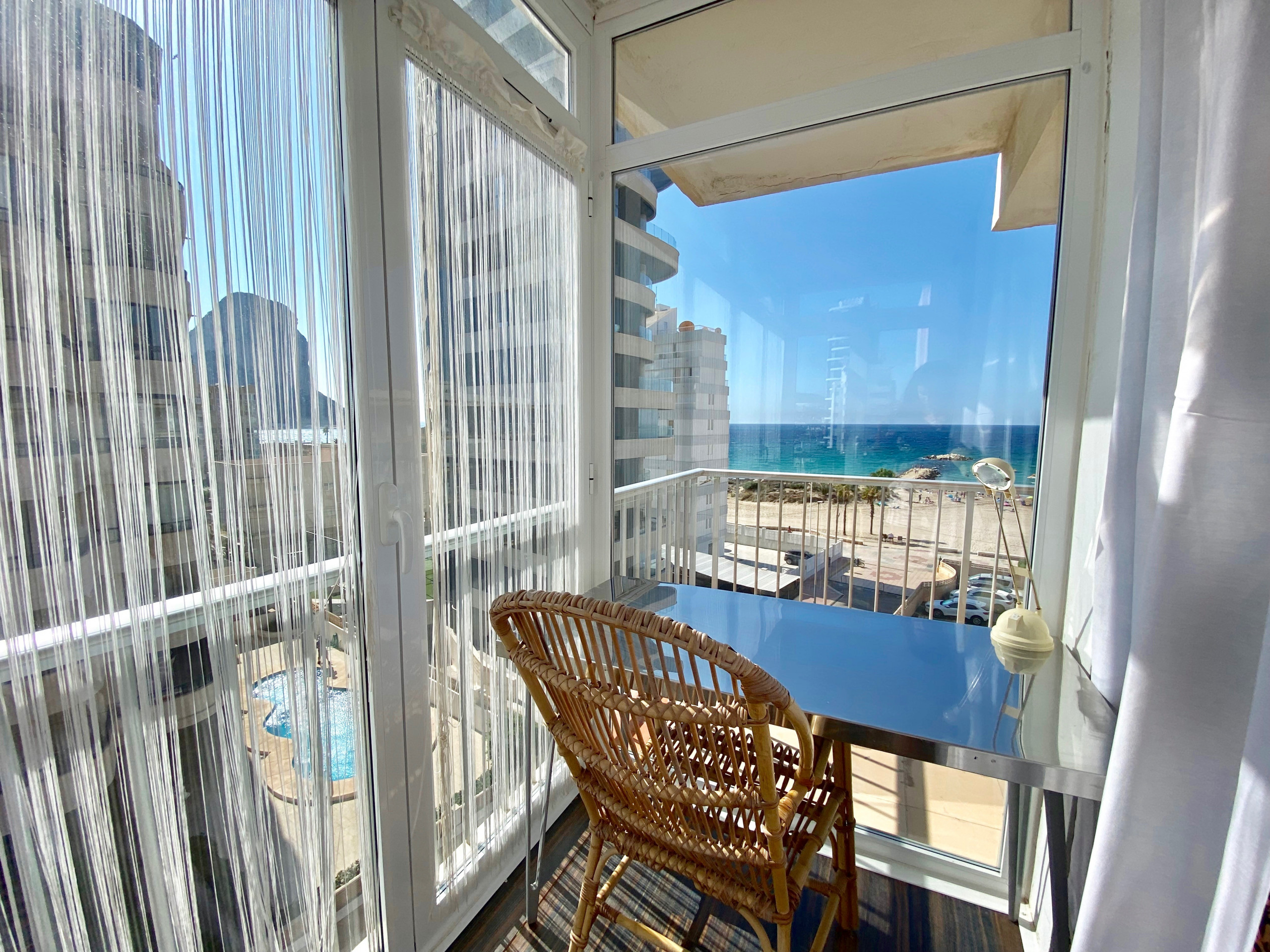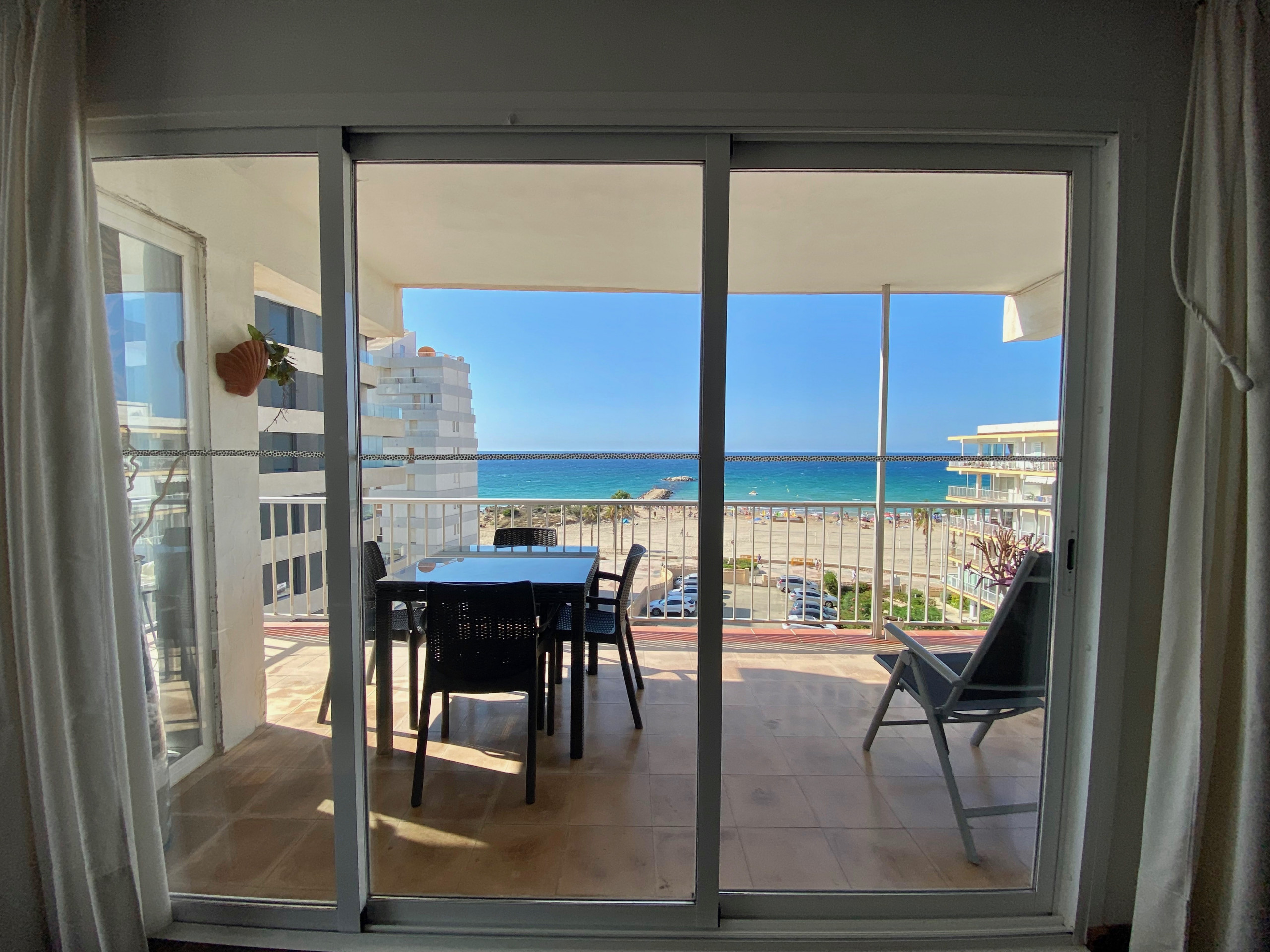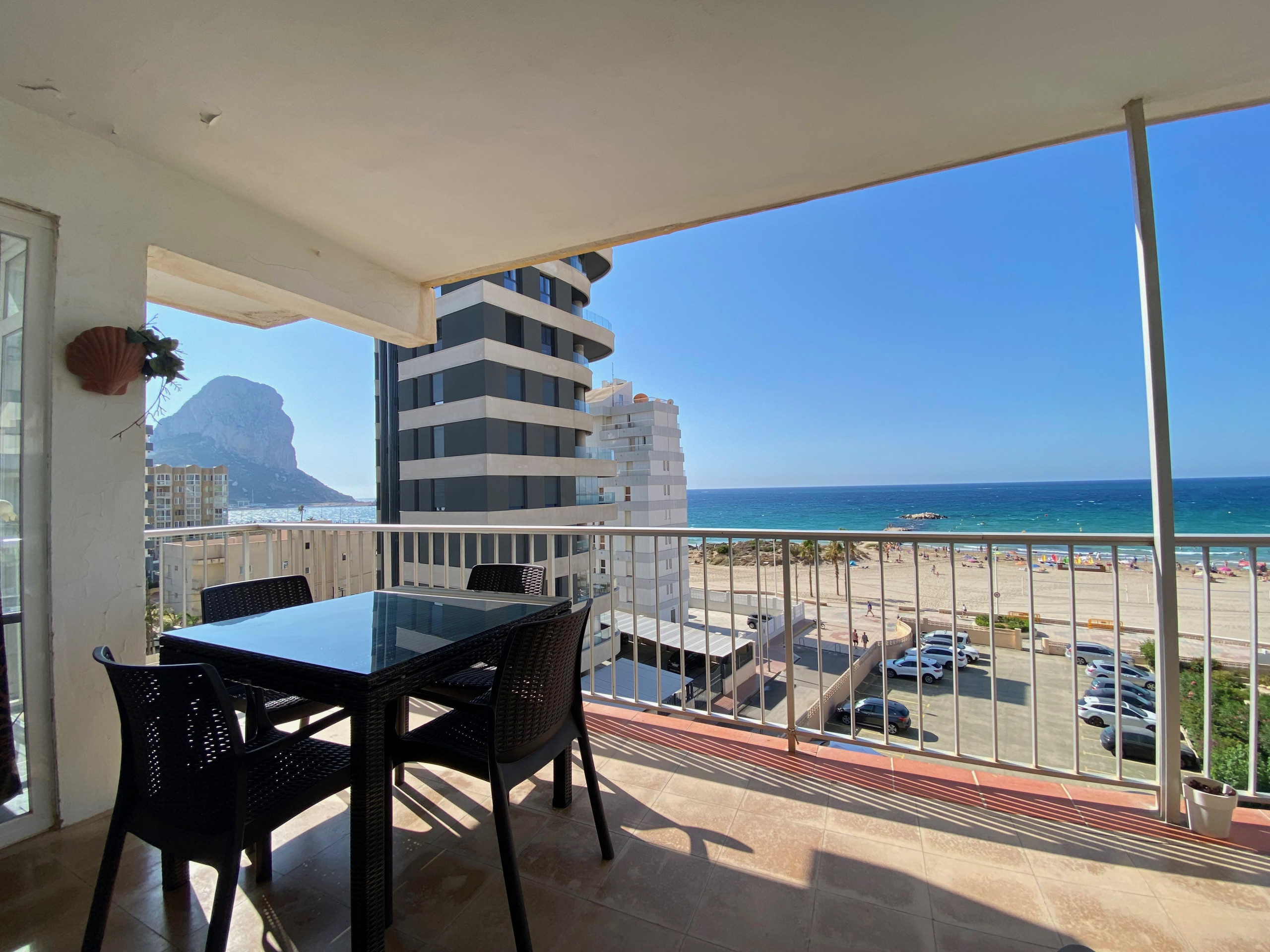 Apartamento en primera línea de playa, con dos dormitorios y dos cuartos de baño, situado en la 5ª planta del edificio Apartamentos Peñon de Ifach con excelentes vistas al mar, totalmente equipado, cuenta con aire acondicionado en el salón-comedor, televisión, lavadora, lavavajillas, microondas, cafetera. Plaza de aparcamiento en el mismo edificio. WIFI incluido. Esta situado a 5 minutos andando hasta el centro de Calpe, tiendas, bares y supermercados.