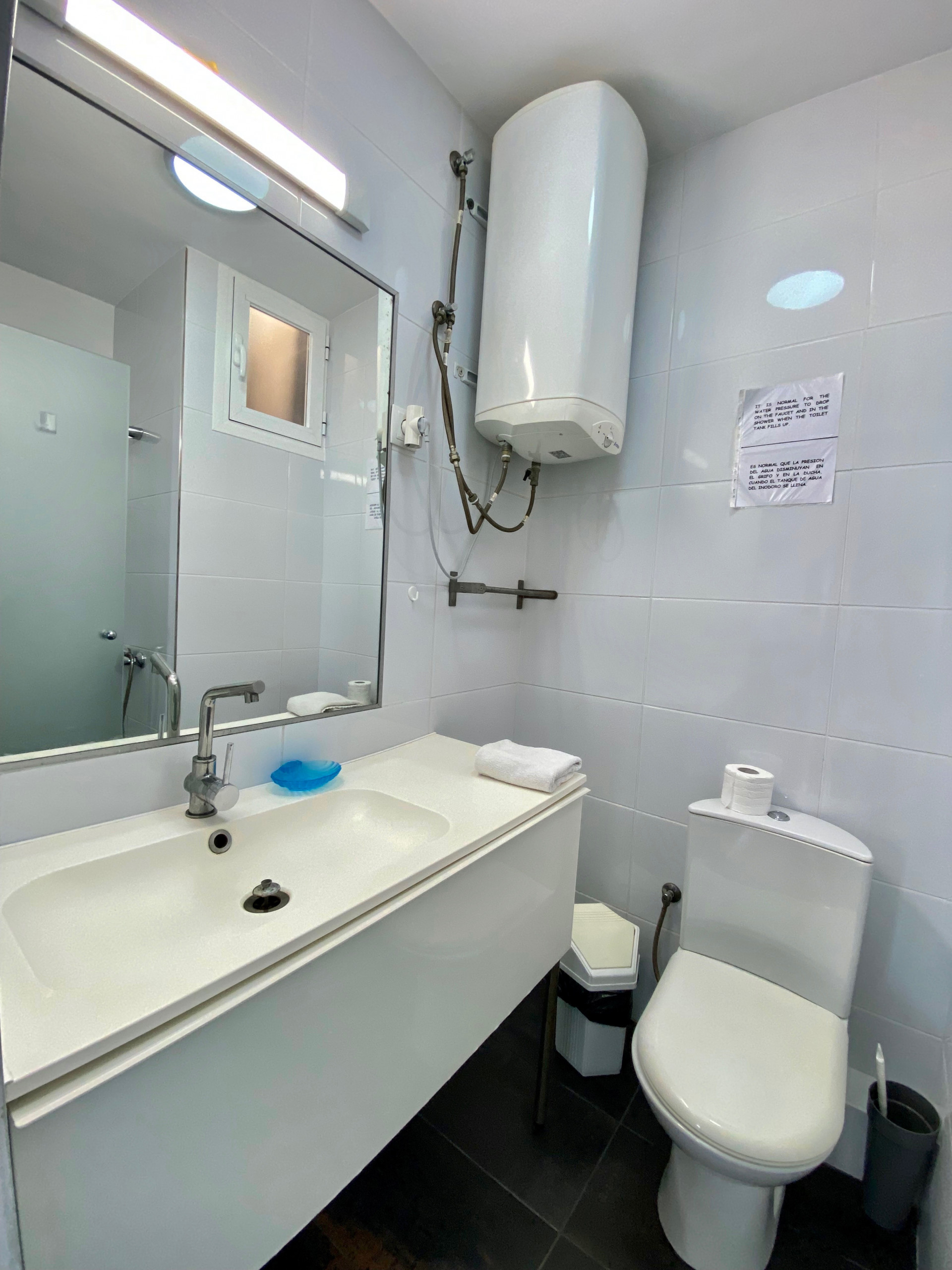 El apartamento cuenta con un dormitorio con una cama doble y dos camas individuales, ideal para descansar después de un día de aventuras. Dispone de aire acondicionado y calefacción por bomba de calor para garantizar tu confort en cualquier época del año. La cocina americana está completamente equipada con electrodomésticos como nevera, lavadora, horno, microondas, cafetera, tostadora, y todo lo necesario para preparar deliciosas comidas.