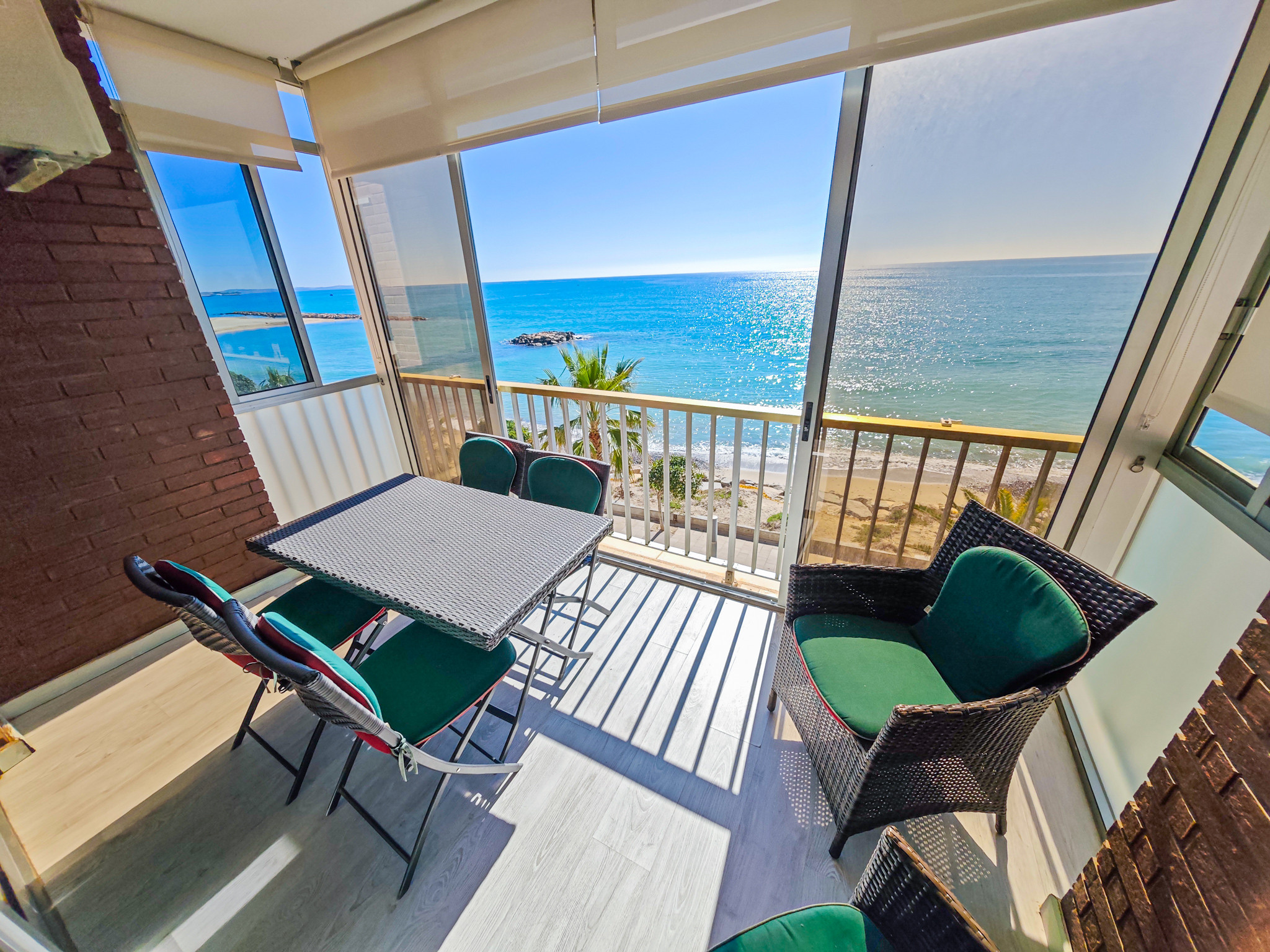 El apartamento tiene una terraza con vistas laterales al mar y muebles de jardín que permiten disfrutar de momentos al aire libre.