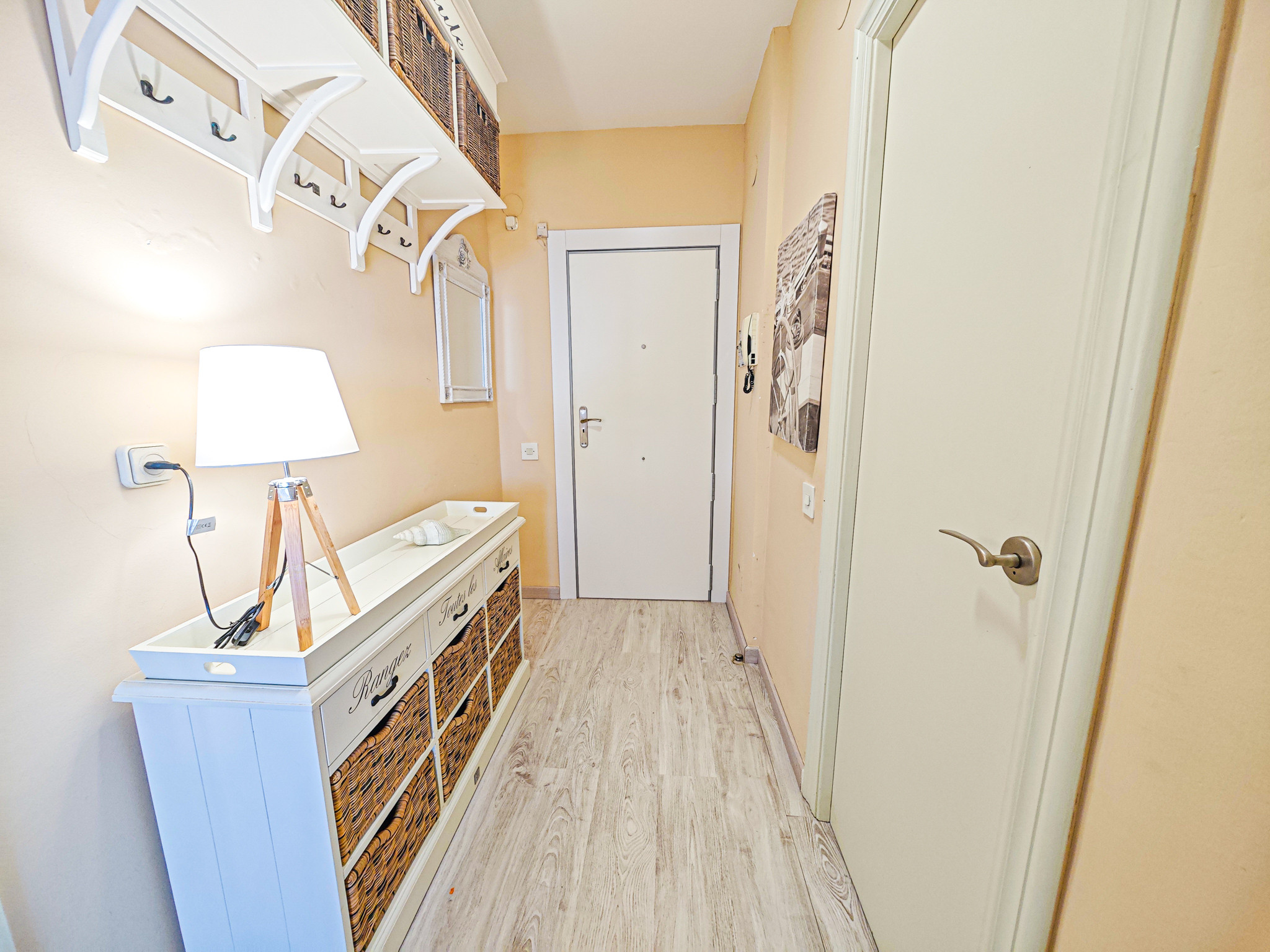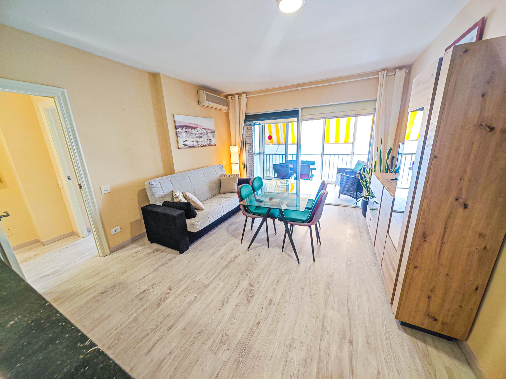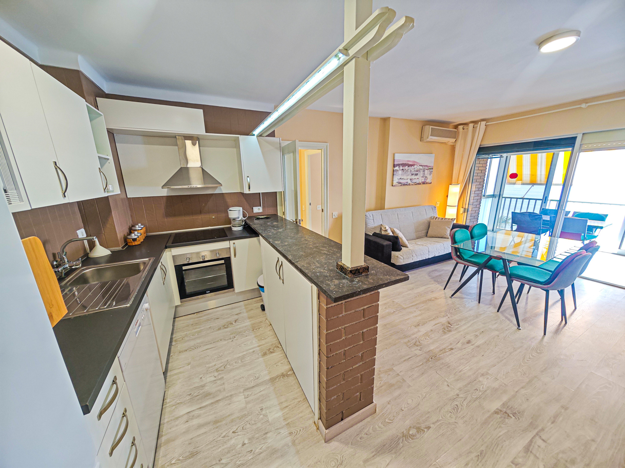 El apartamento cuenta con una habitación con una cama doble y dos camas individuales, permitiendo alojar cómodamente hasta 4 personas. Dispone de un baño completo con bañera, perfecto para relajarse después de un día de playa. La cocina americana está totalmente equipada con electrodomésticos modernos como nevera, congelador, lavadora, horno, microondas, cafetera y una amplia variedad de menaje.