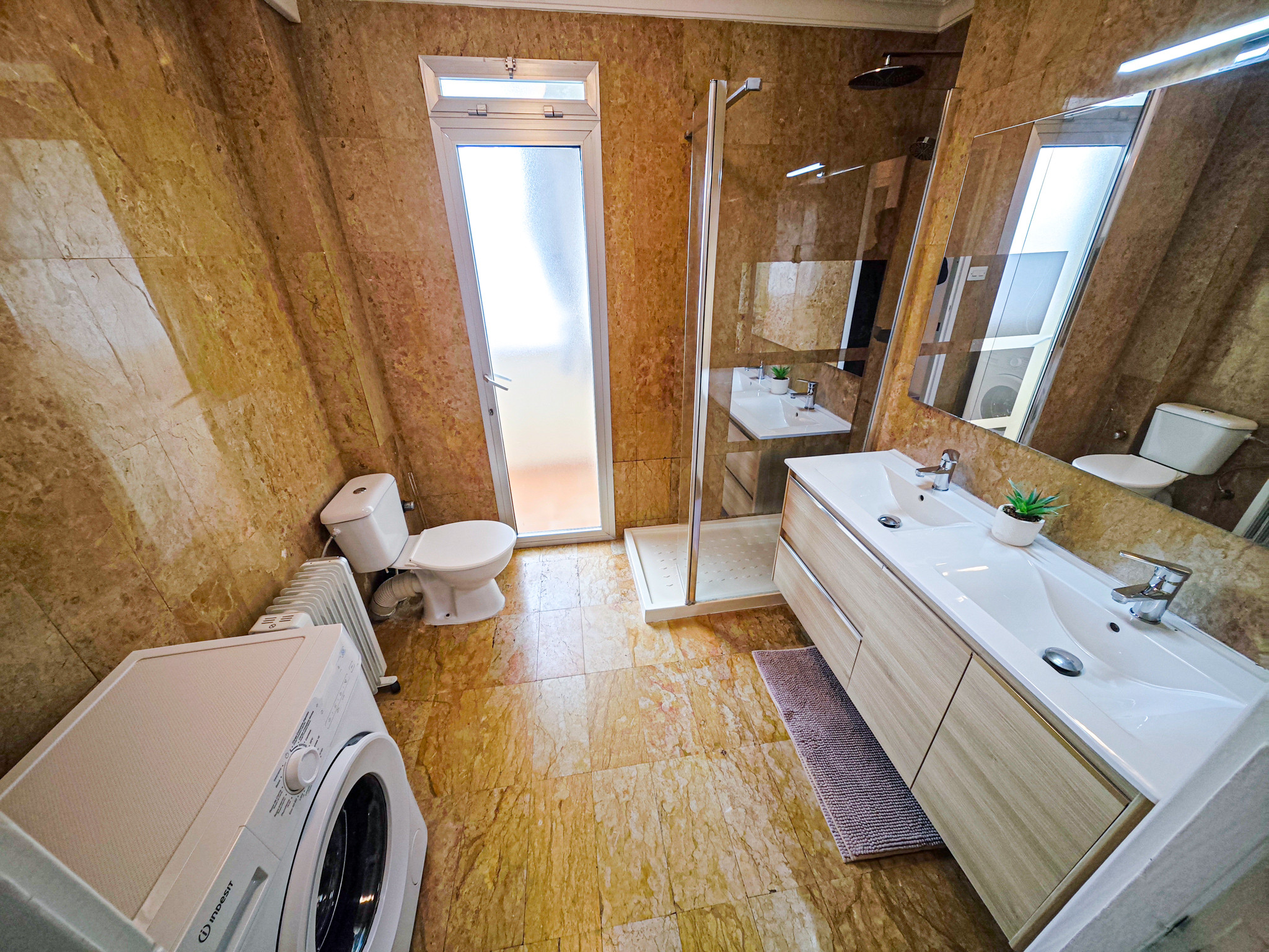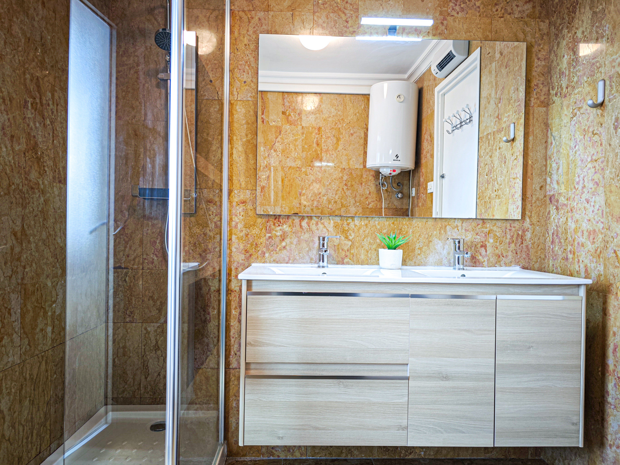 El apartamento tiene un tamaño amplio de 90 m², lo que lo hace perfecto para familias o grupos de amigos que buscan espacio y confort. Además, cuenta con aire acondicionado para refrescar las cálidas noches de verano.