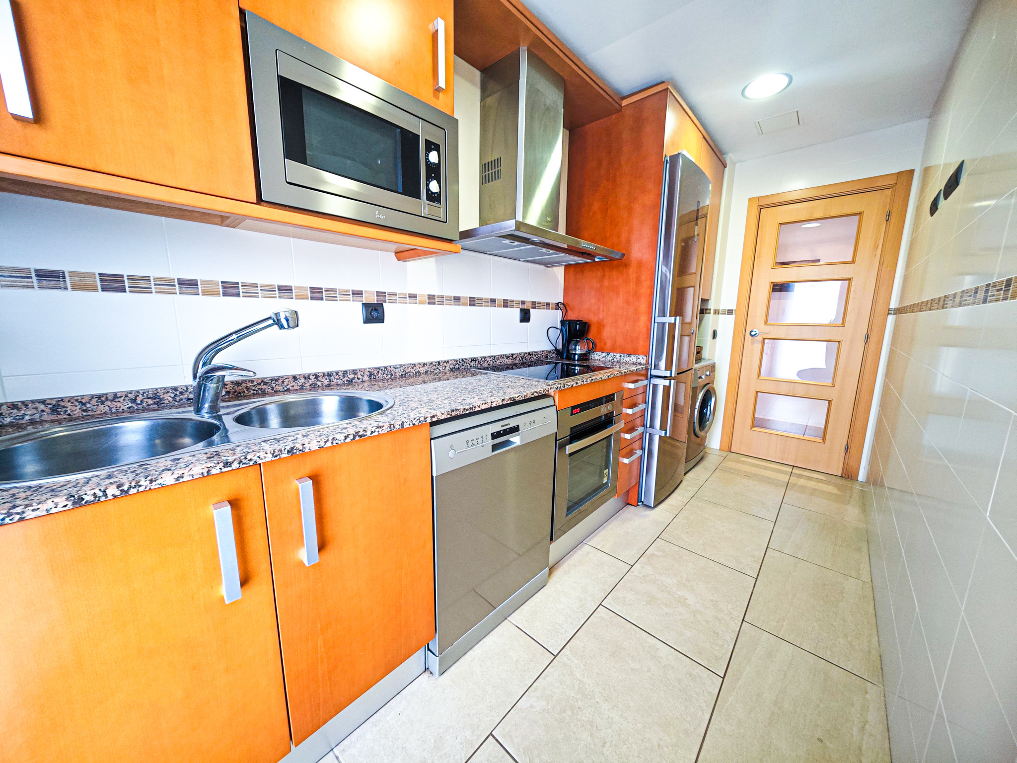 La cocina americana está totalmente equipada con electrodomésticos modernos como nevera, congelador, lavadora, microondas, cafetera, tostadora y hervidor. Dispondrás de todos los utensilios de cocina necesarios para preparar deliciosas comidas en familia.