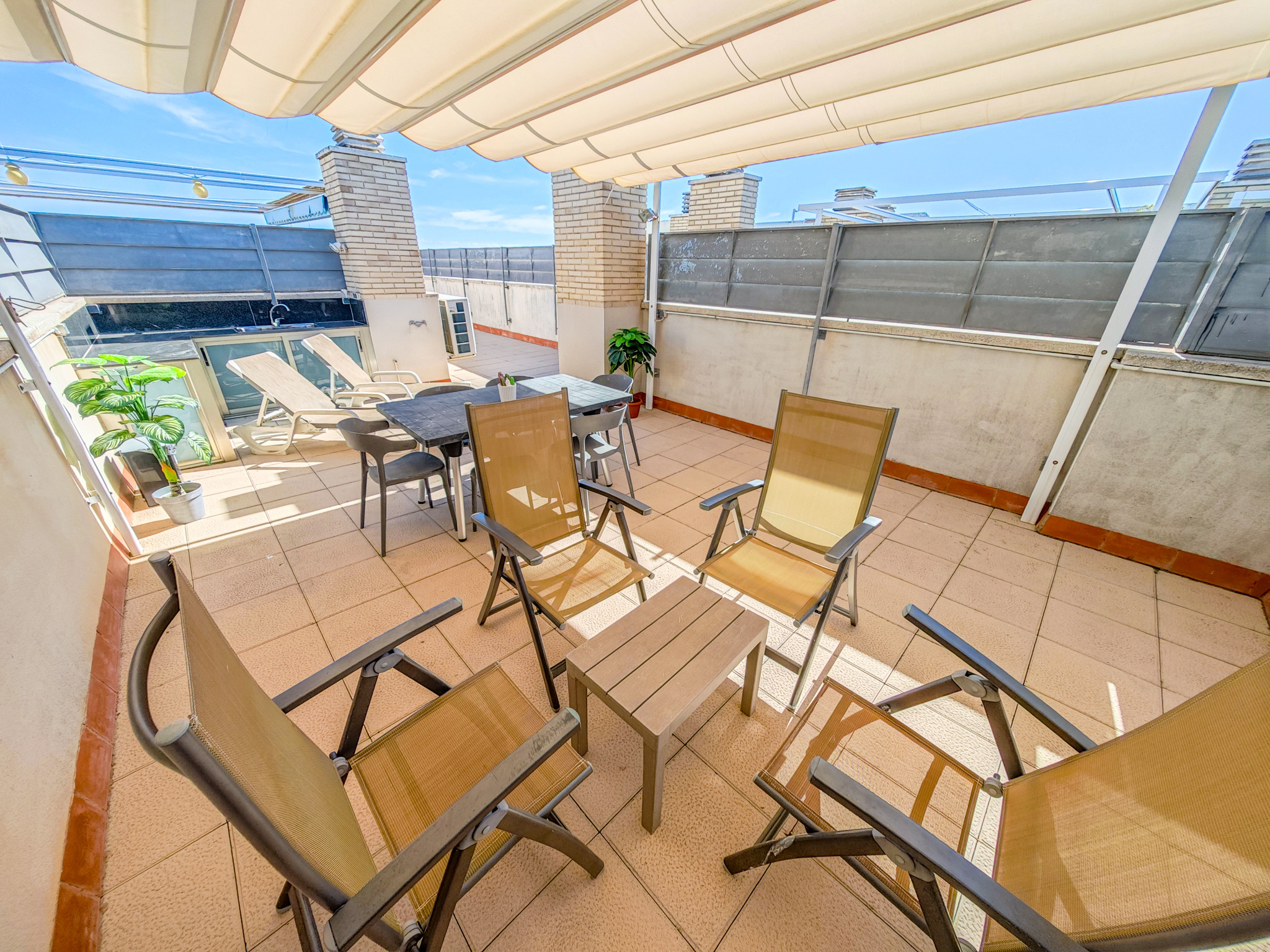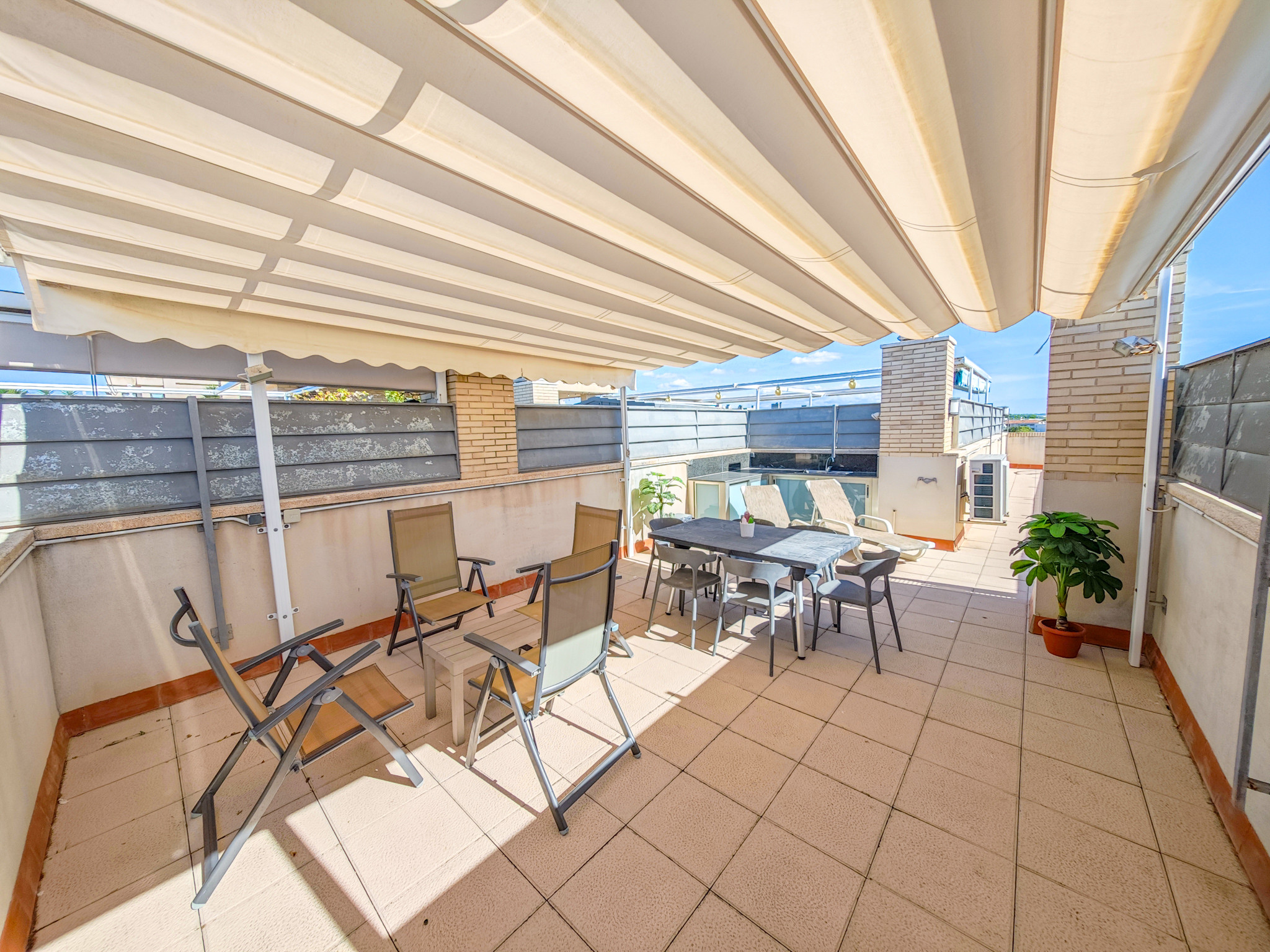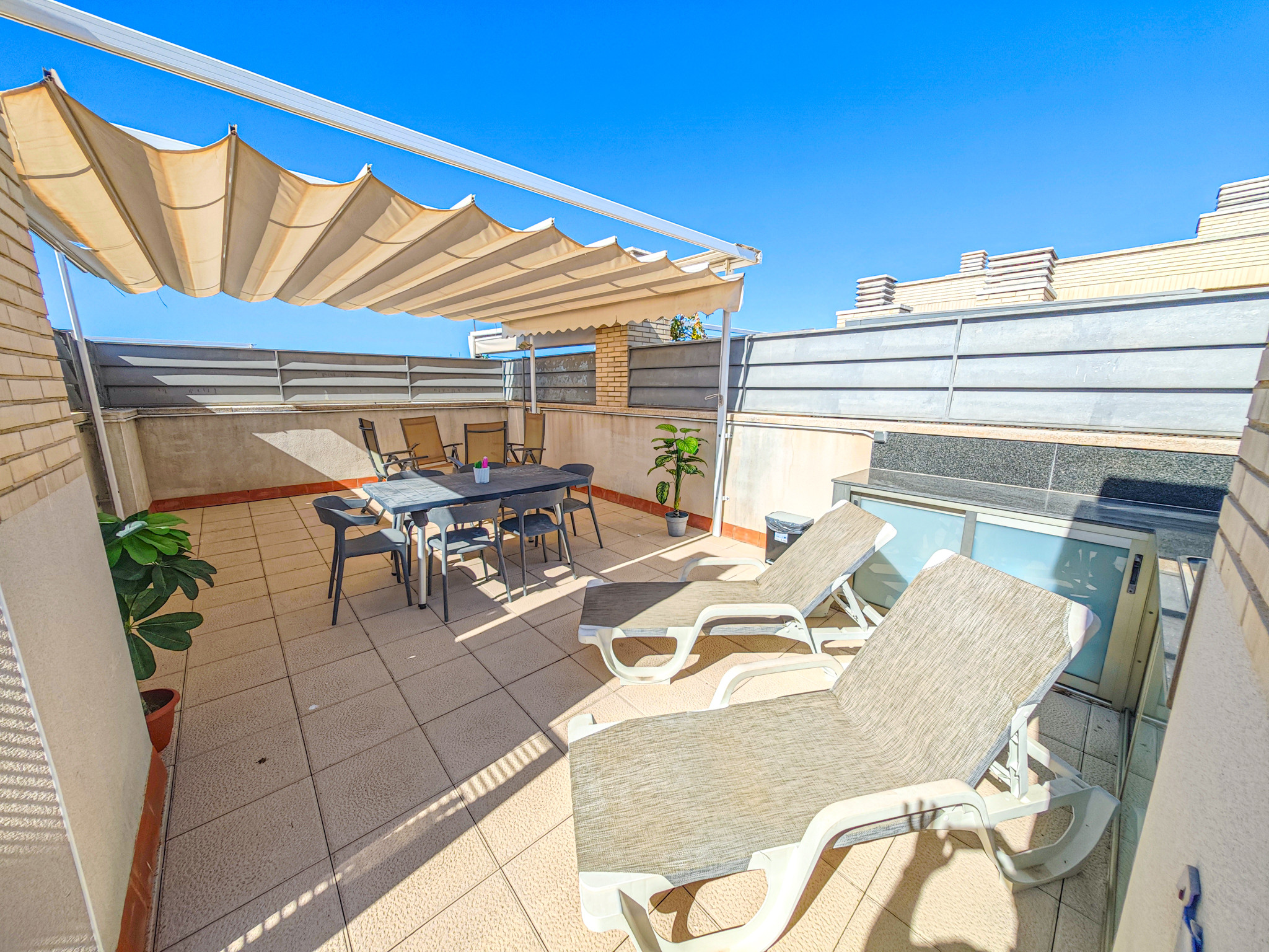 La zona exterior cuenta con terraza con vistas al mar y un bonito solarium con acceso desde la terraza con toldo, sillas, mesa y tumbonas, perfectos para disfrutar de momentos de tranquilidad y contemplar las vistas al mar.