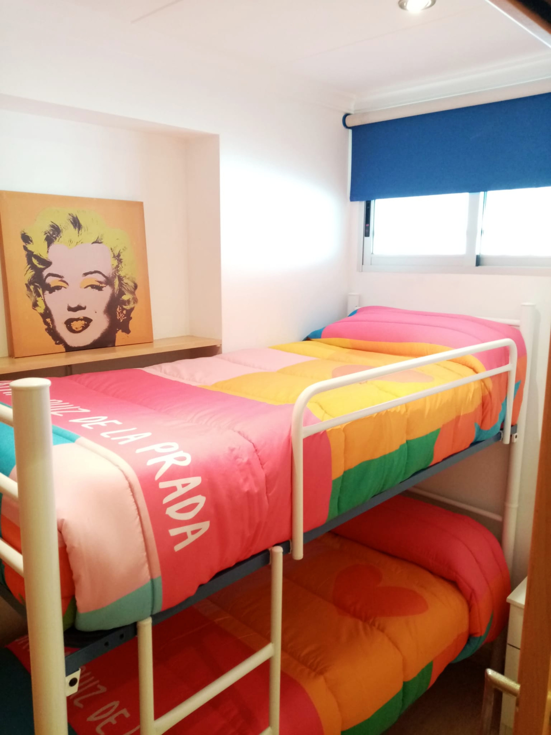 El apartamento cuenta con dos dormitorios: uno con cama doble y otro con litera, ideal para familias con niños o amigos. La zona de estar está equipada con aire acondicionado para mantener un ambiente fresco y confortable durante los días más calurosos. Además, dispone de calefacción por bomba de calor para los días más frescos.