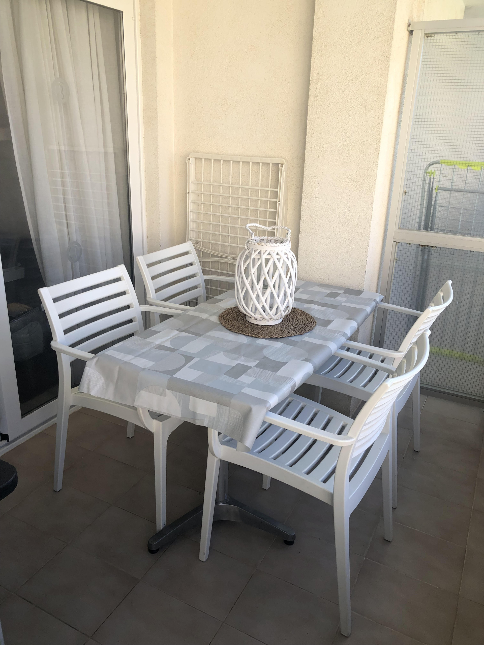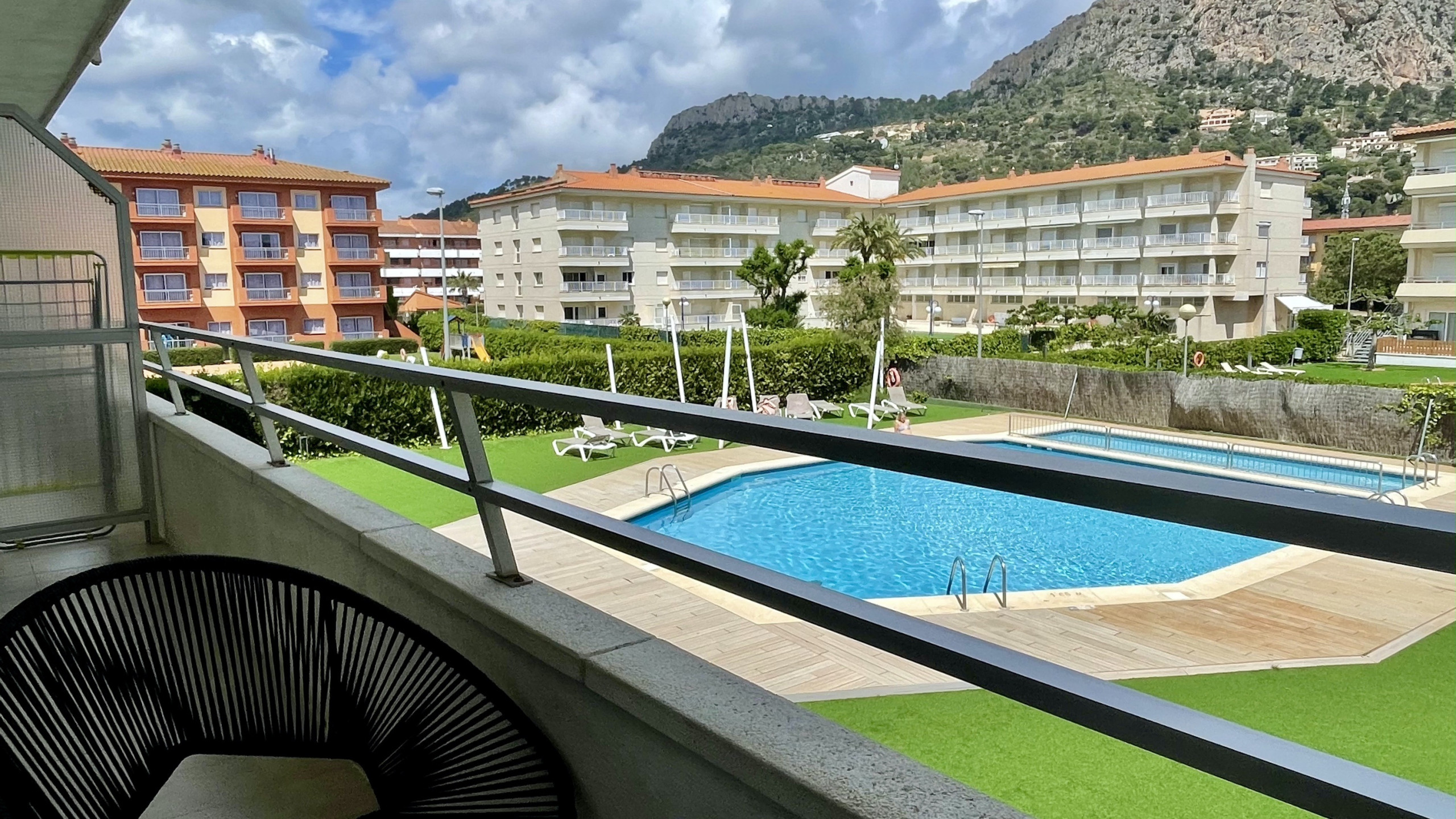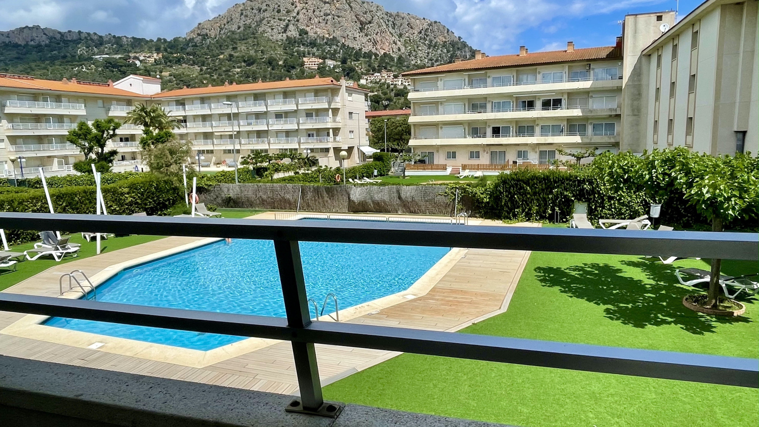 El apartamento tiene una gran terraza con una inmejorable vista del todo el complejo Rocamaura, con la piscina a tus pies y las Islas Medes de fondo.