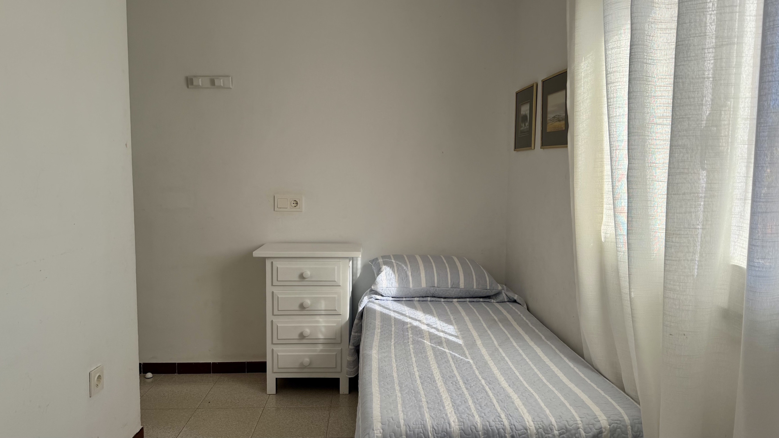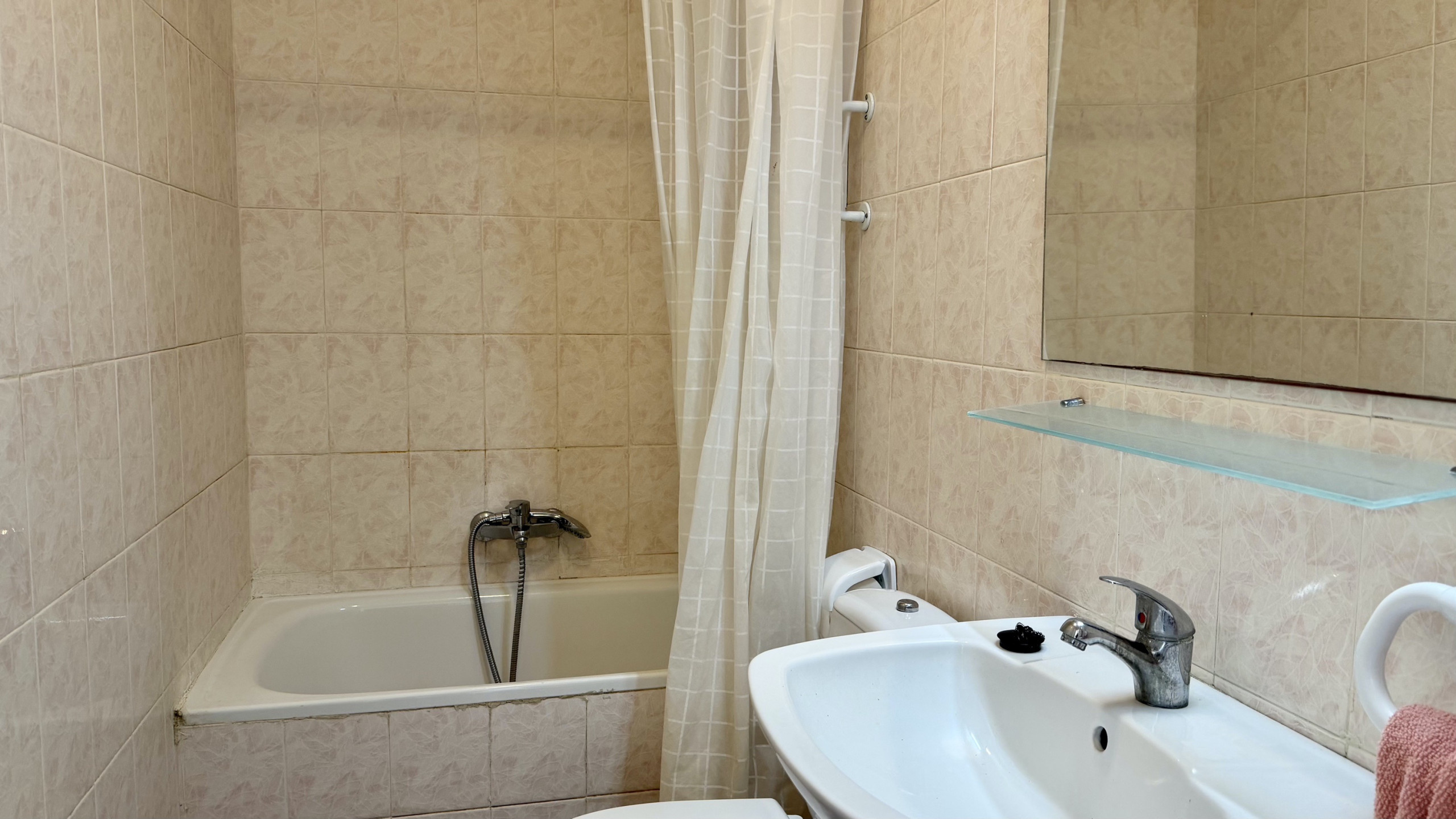 El apartamento cuenta con 3 dormitorios bien distribuidos: un dormitorio con cama matrimonial y dos dormitorios con camas individuales, garantizando un descanso cómodo para todos los huéspedes. Dispone de un completo baño con bañera, perfecto para relajarse después de un día de playa.