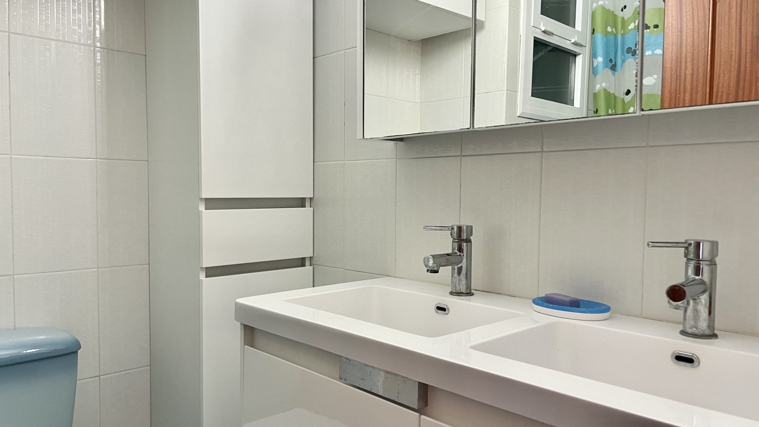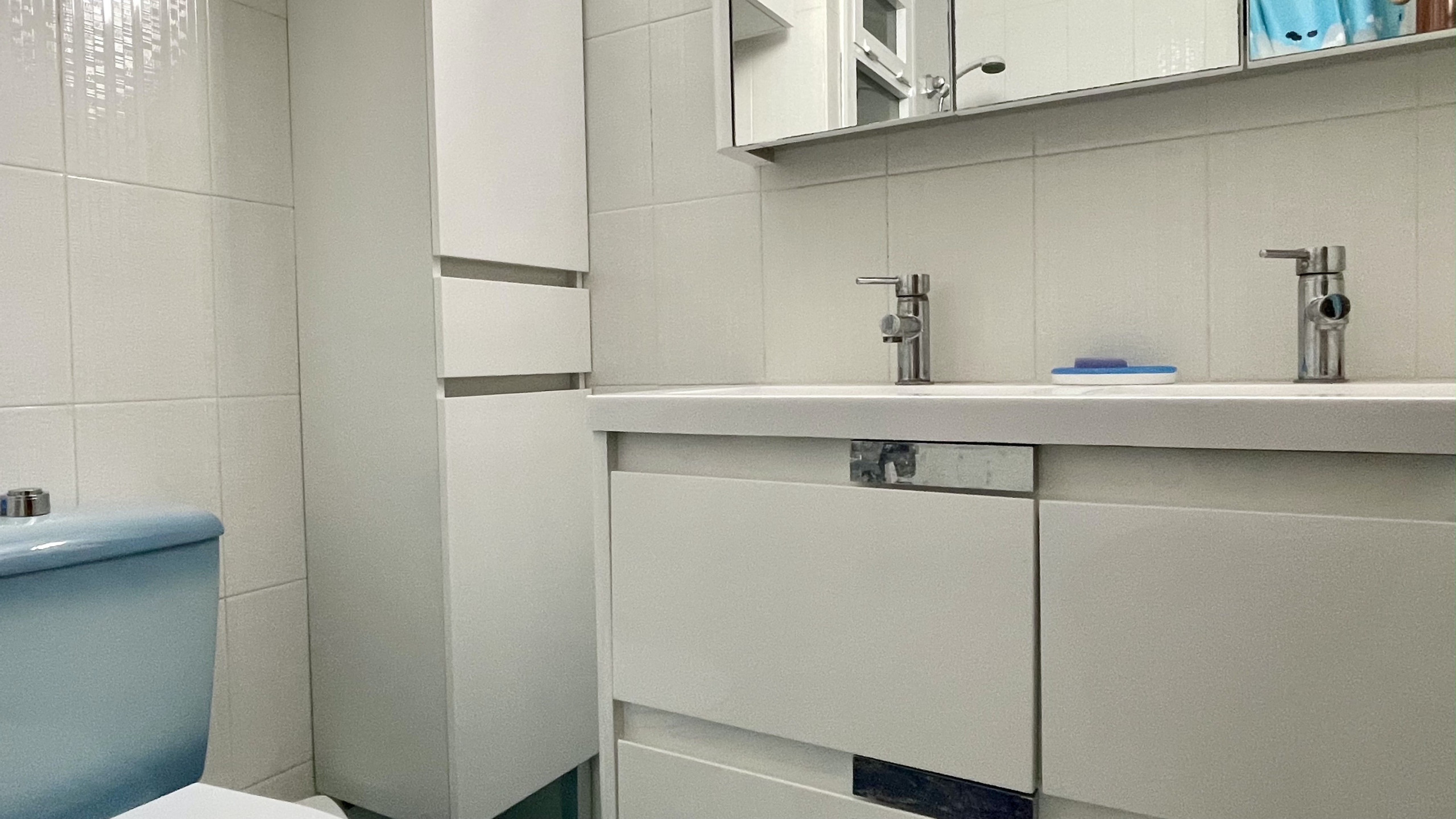 La salle de bain fonctionnelle. Meuble du séjour très pratique.  |