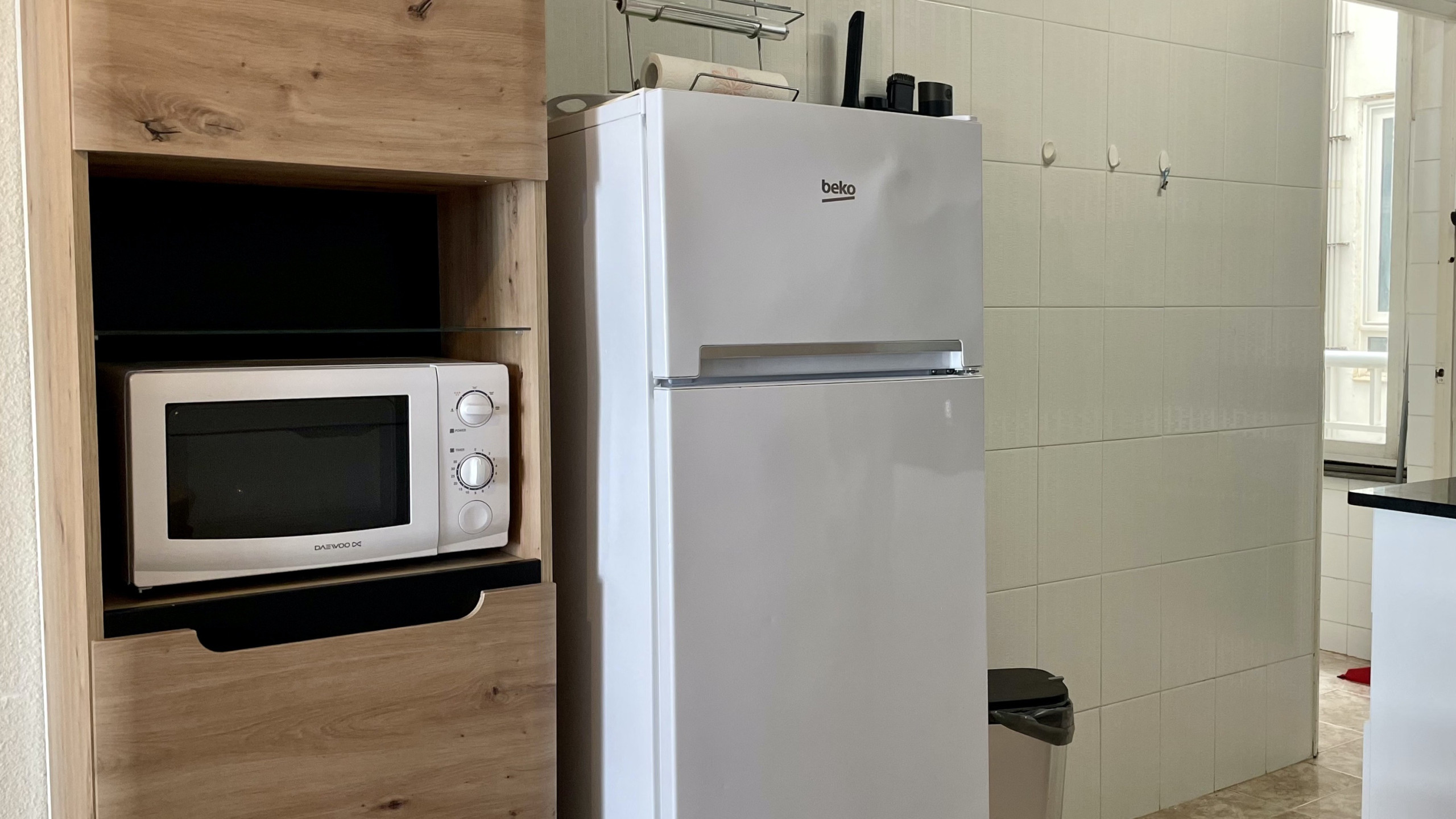 La cocina americana de gas está equipada con los electrodomésticos básicos, como frigorífico, microondas, horno, congelador, lavadora, cafetera y tostadora.
