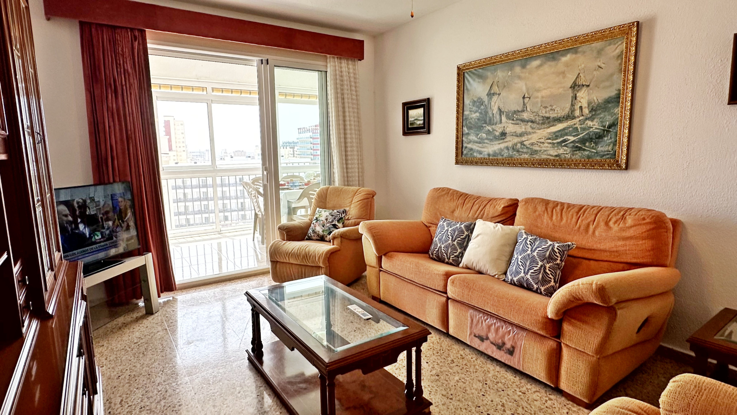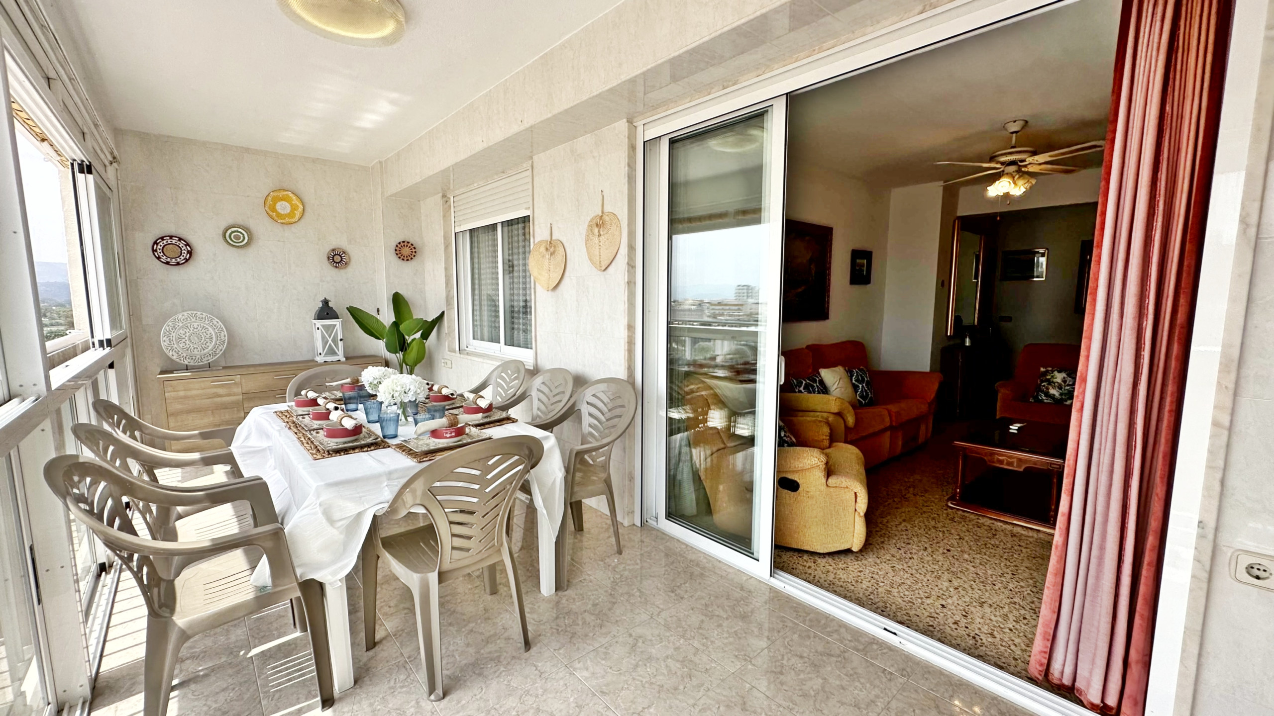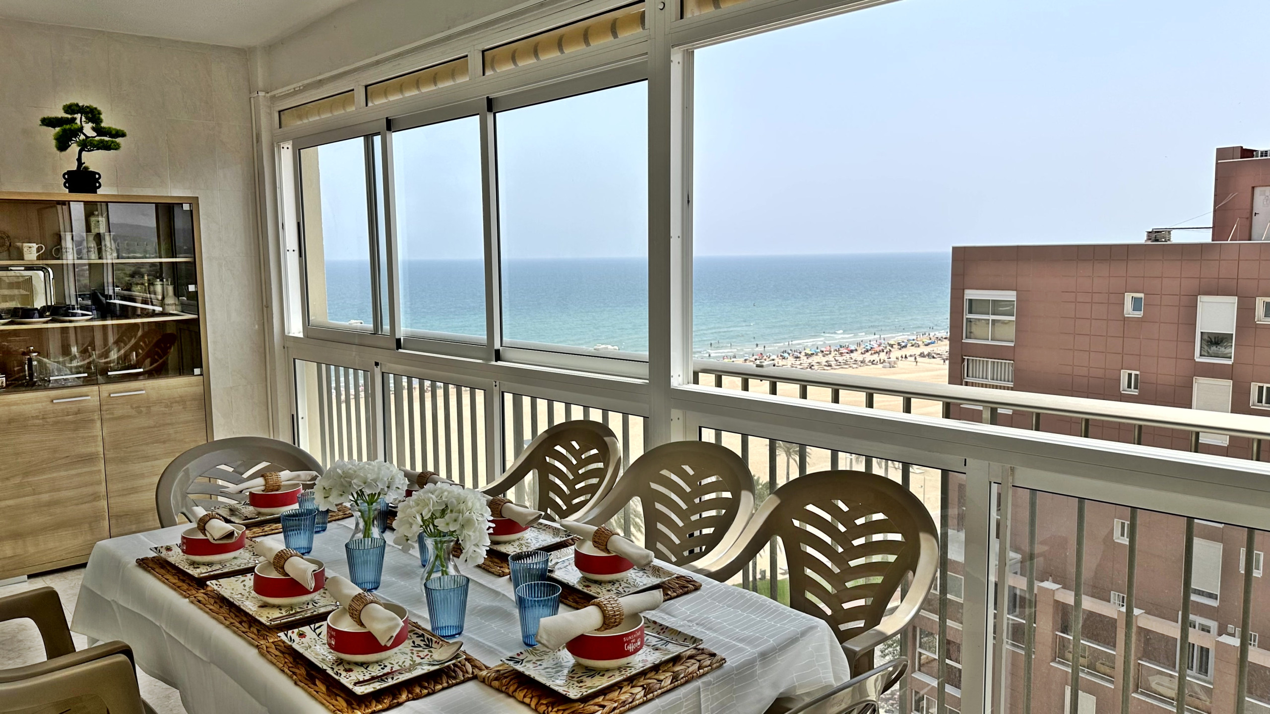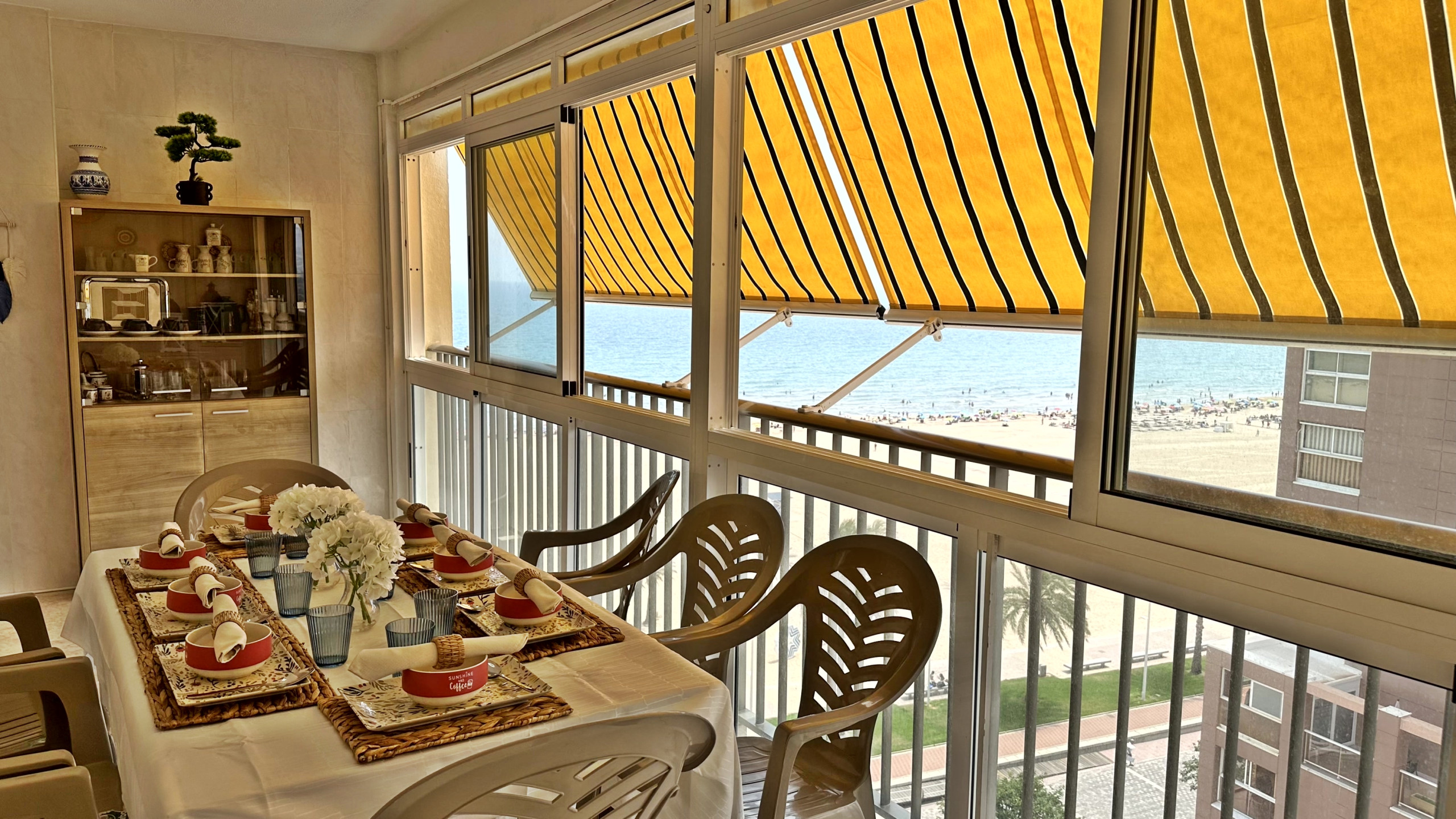 CONSTA DE: de 4 dormitorios, (2 dormitorios con cama matrimonio, 1 dormitorio con dos camas, y otro dormitorio anejo a la cocina con una cama individual ), salón con sofá cama, cocina con vitro totalmente equipada, 1 cuarto de balo con bañera, 1 cuarto de baño con ducha . TERRAZA ACRISTALADA con vistas frontales al mar. La terraza cuenta con un toldo tipo cortina.