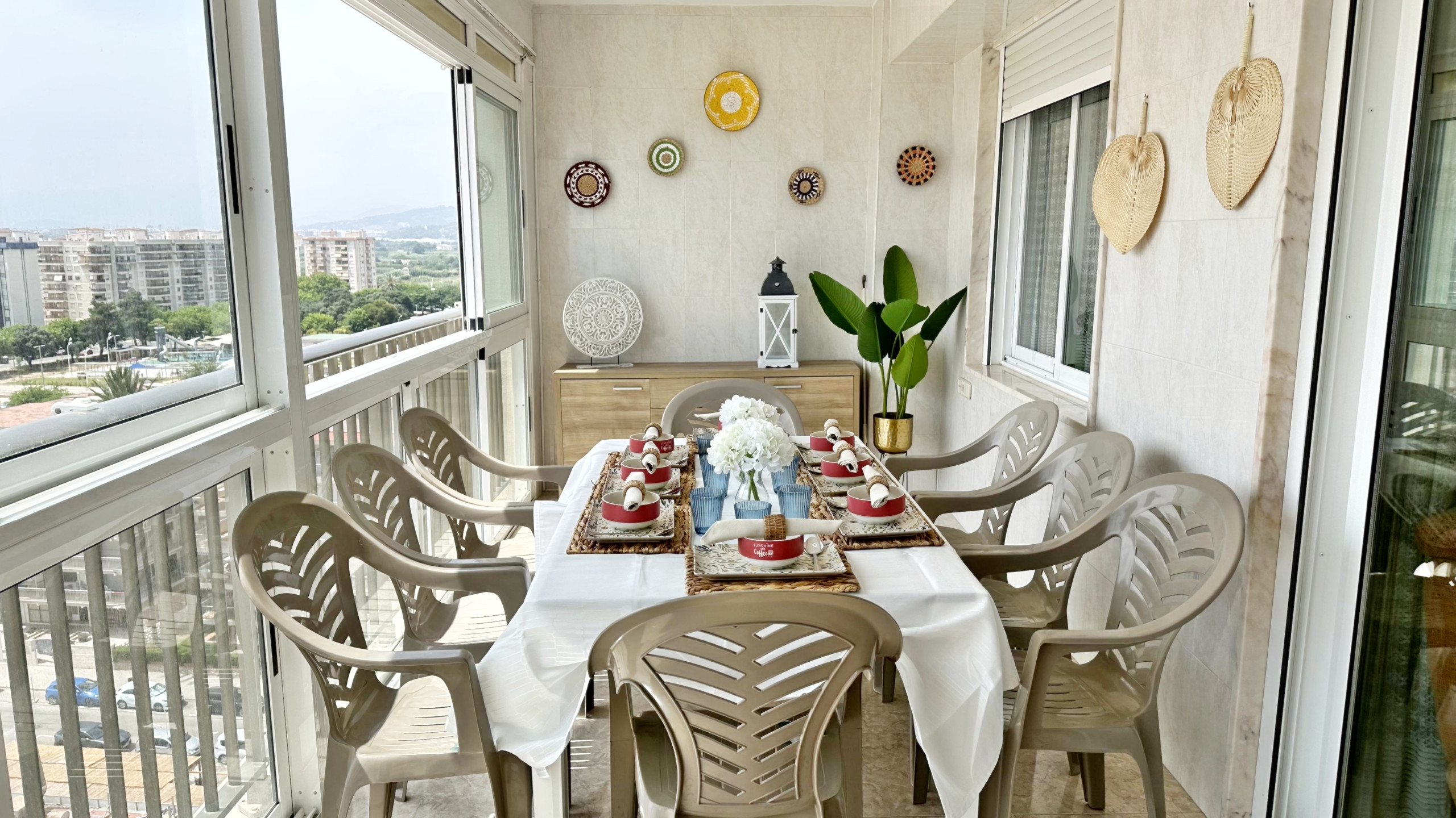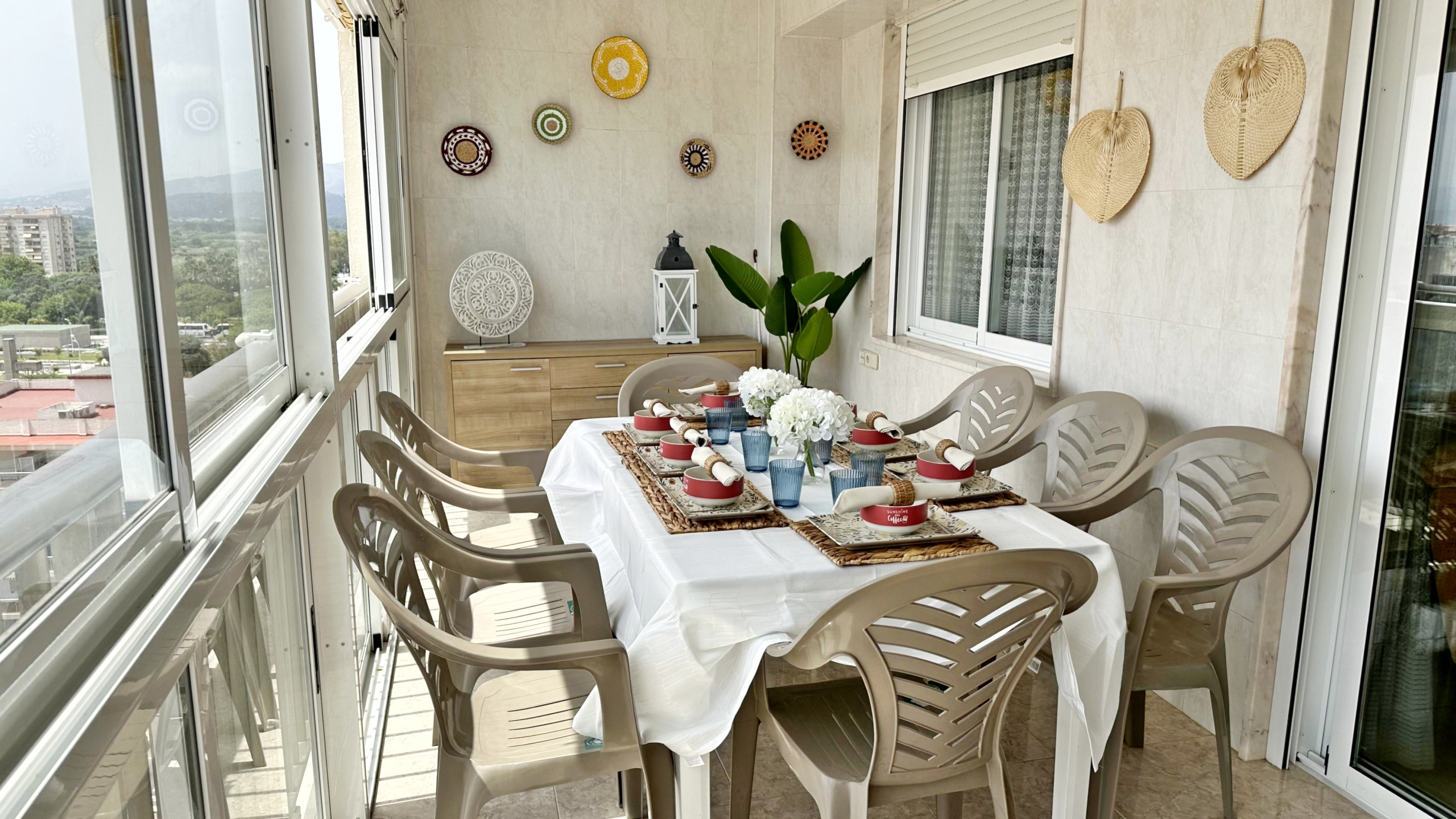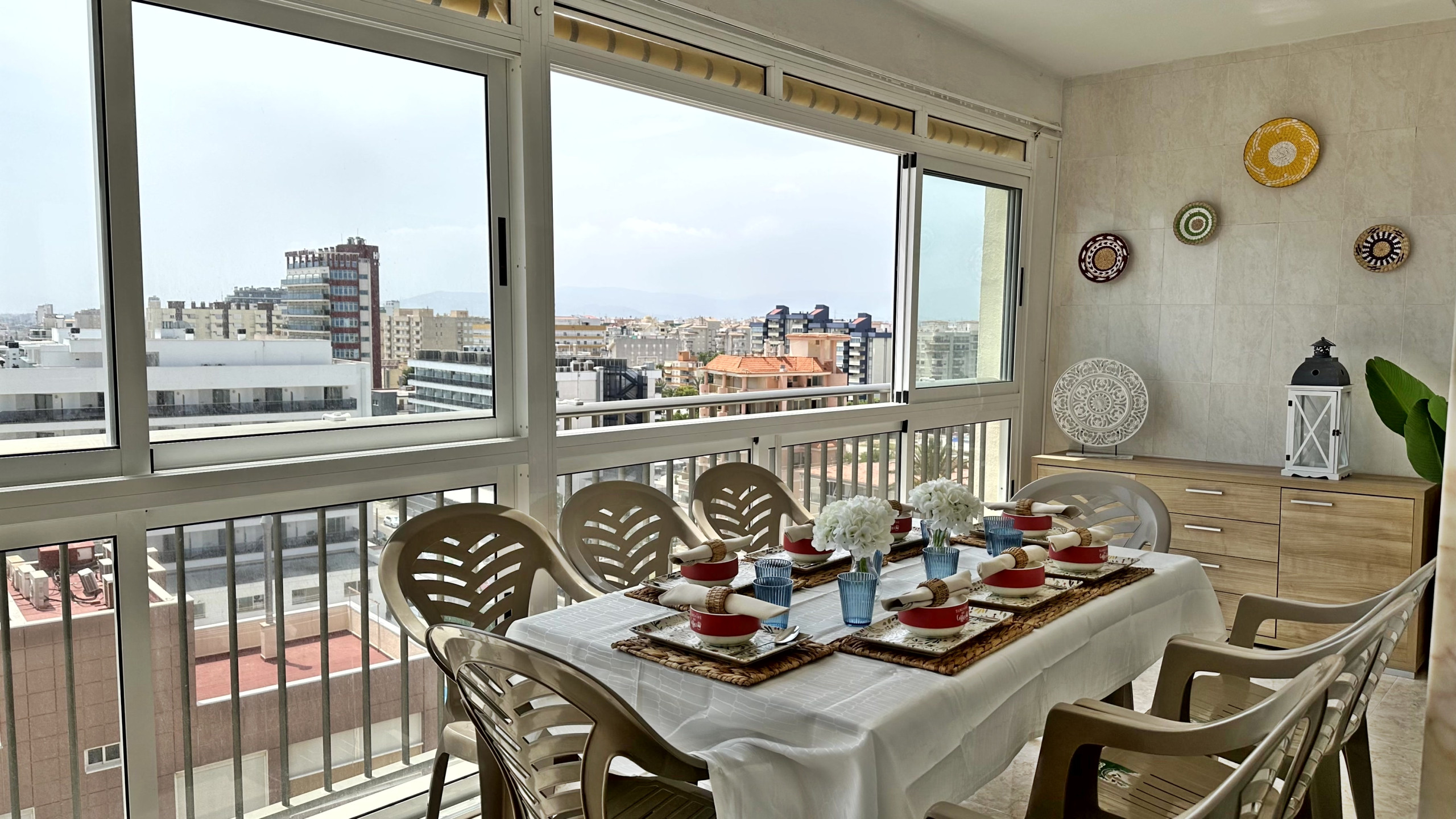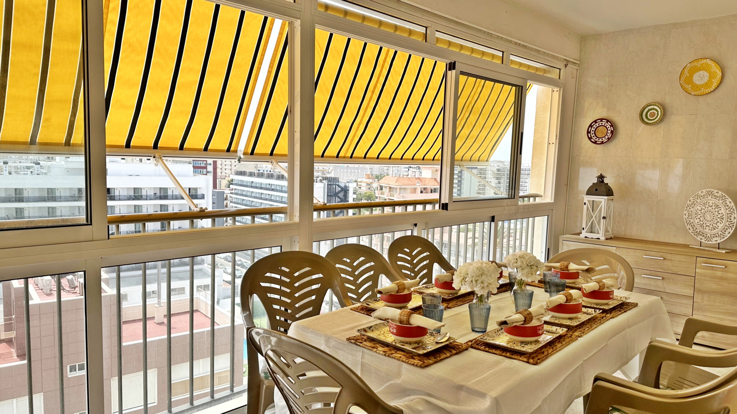CONSTA DE: de 4 dormitorios, (2 dormitorios con cama matrimonio, 1 dormitorio con dos camas, y otro dormitorio anejo a la cocina con una cama individual ), salón con sofá cama, cocina con vitro totalmente equipada, 1 cuarto de balo con bañera, 1 cuarto de baño con ducha . TERRAZA ACRISTALADA con vistas frontales al mar. La terraza cuenta con un toldo tipo cortina.