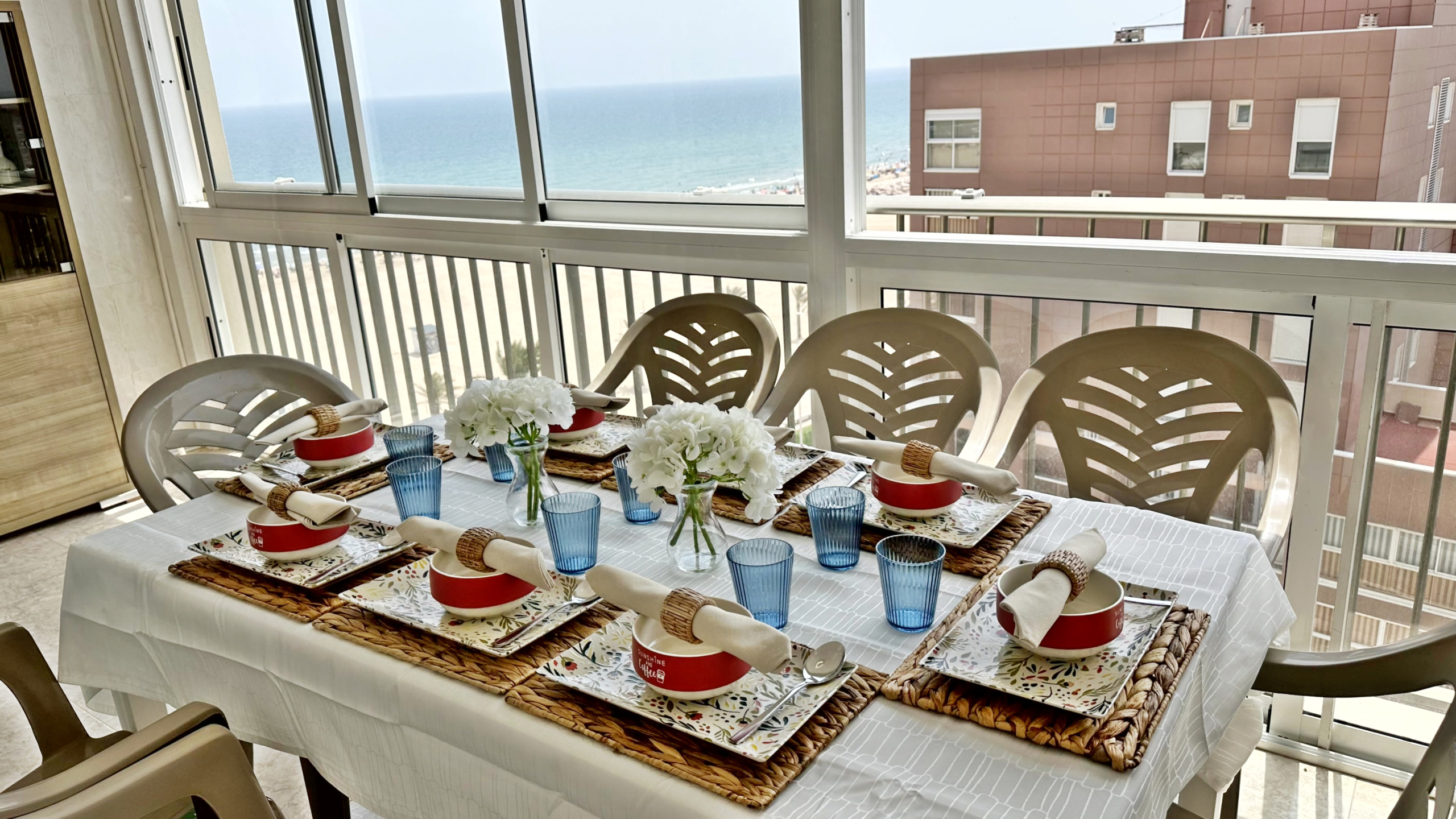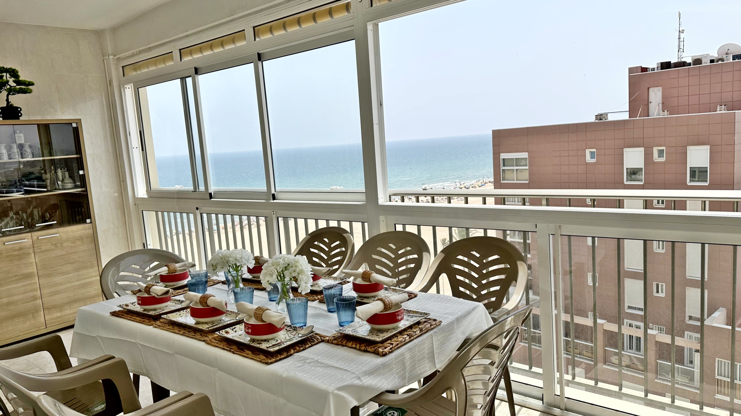 Situado en: 1ª línea de playa, en la zona del Club Náutico y terraza con vista frontal al mar.