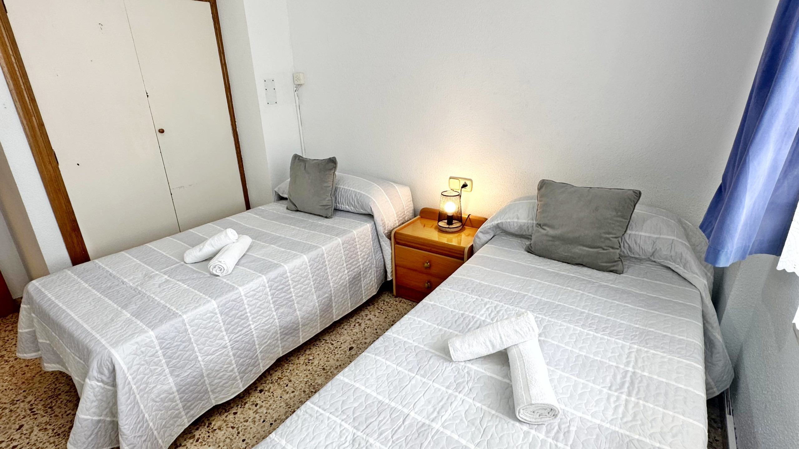 Consta de: 4 dormitorios ( 3 dormitorios con una cama de matrimonio cada uno, y 1 dormitorio con una cama individual ) , amplio salón comedor con cama supletoria y gran terraza con vistas al mar ya la playa, cocina independiente , 2 cuartos de baño completos, uno con ducha y otro con bañera.