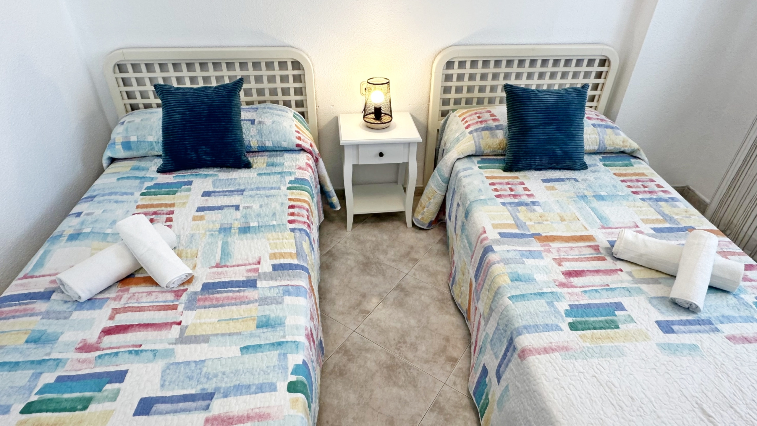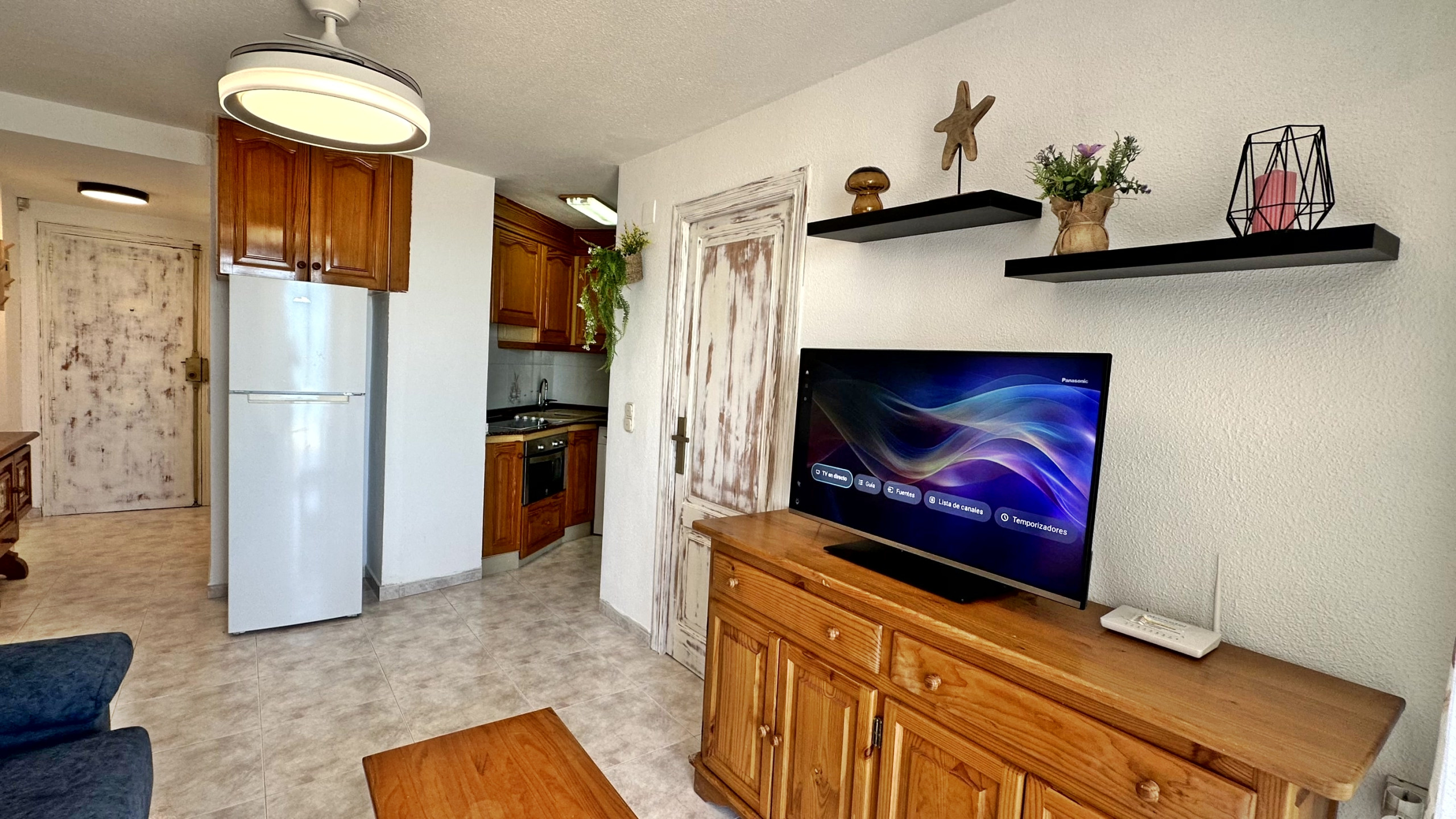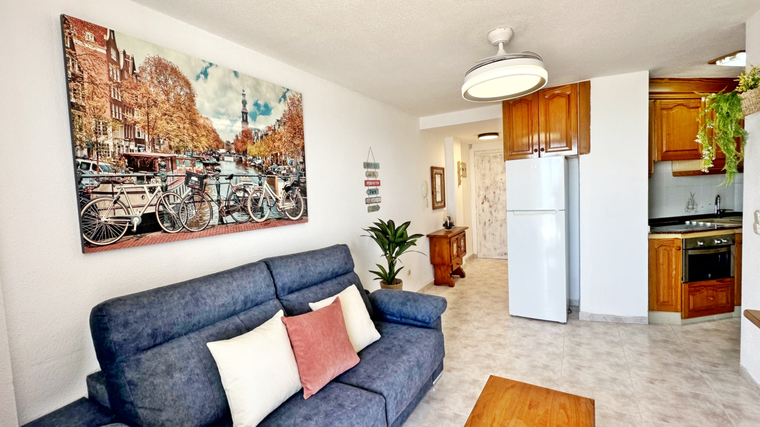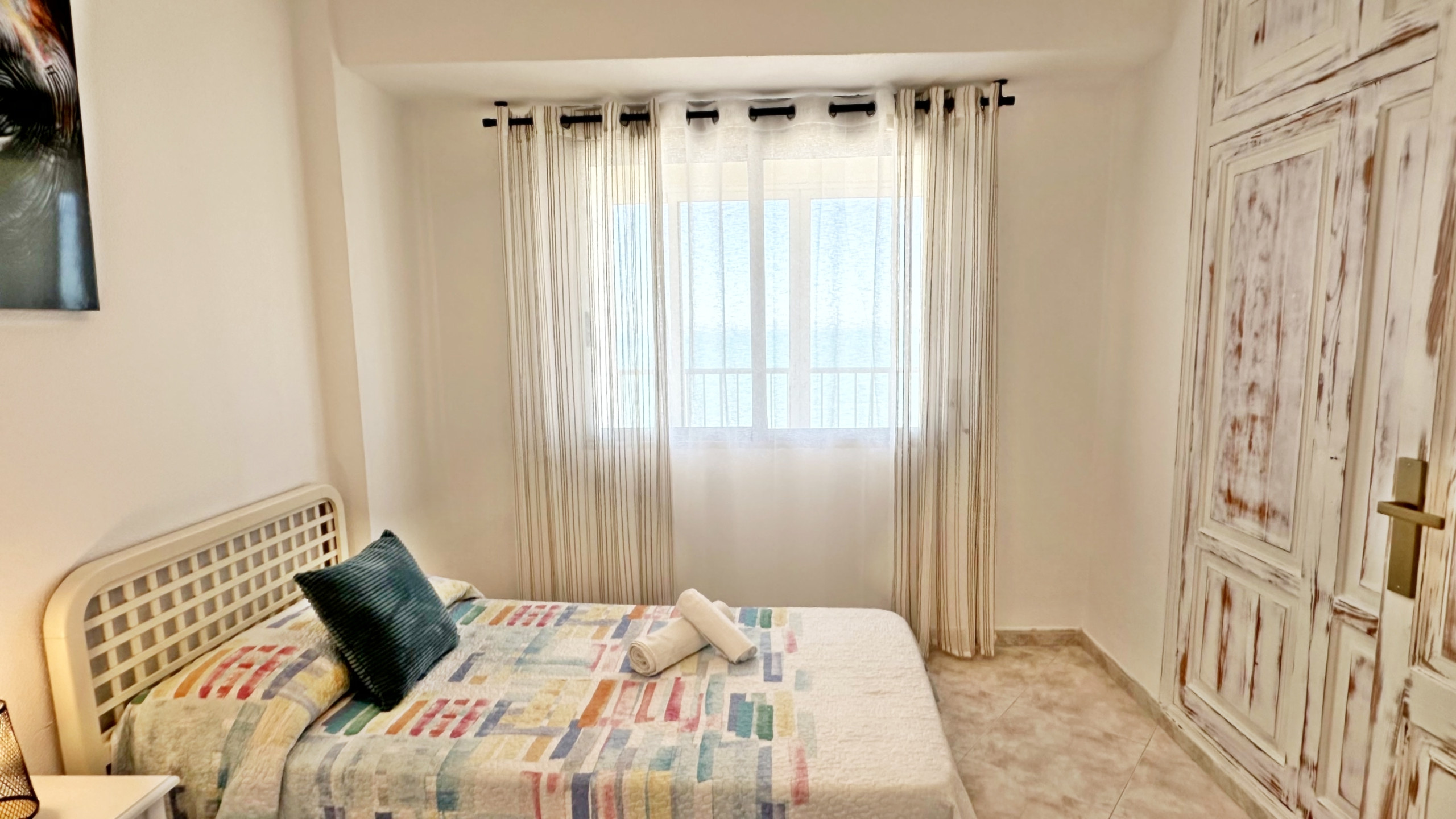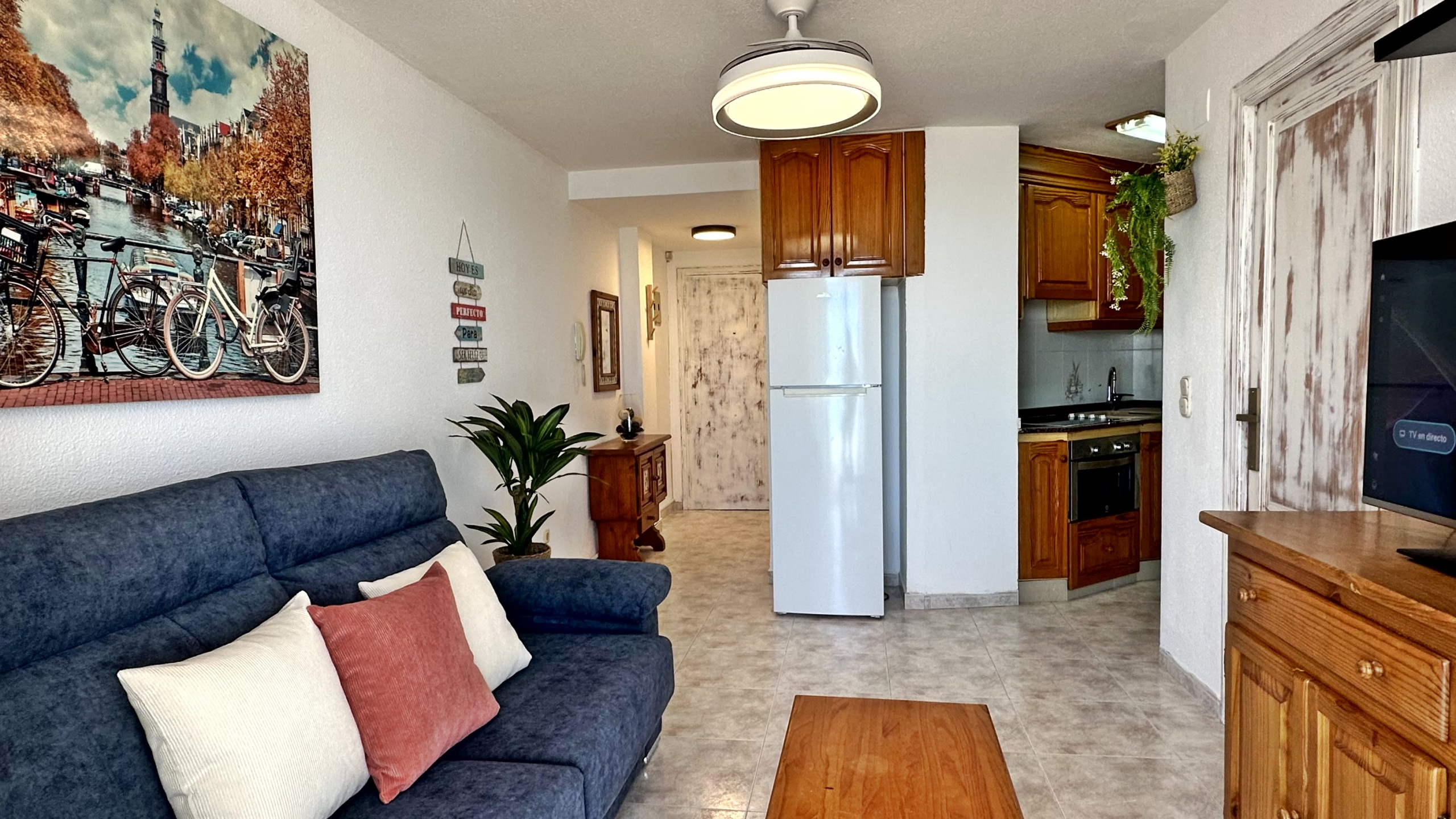 Consta de: 1 dormitorio con dos camas individuales, salón con sofá-cama, cocina americana totalmente equipada, 1 cuarto de baño completo con bañera y terraza con vistas directas a la playa y al paseo marítimo.
