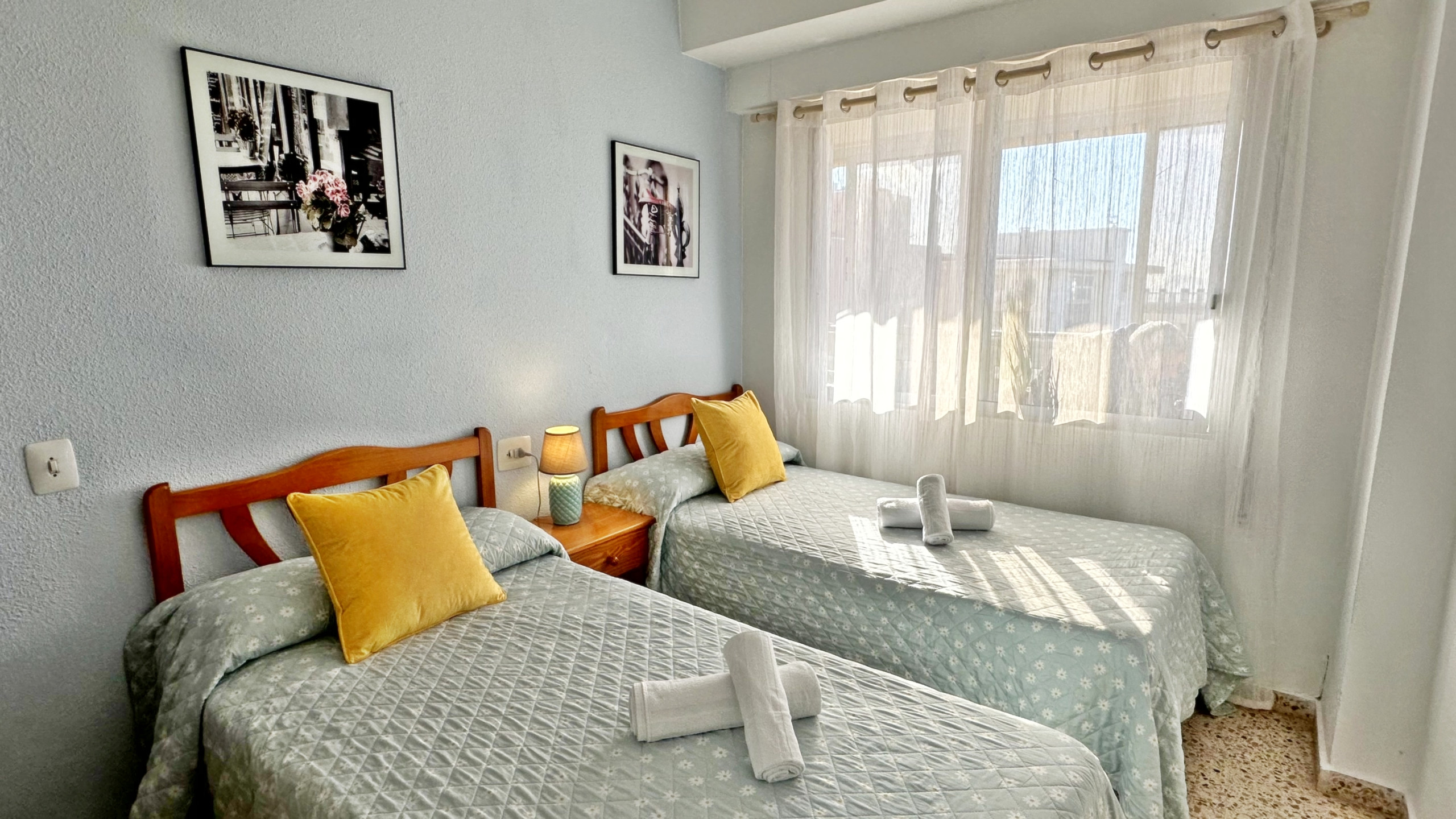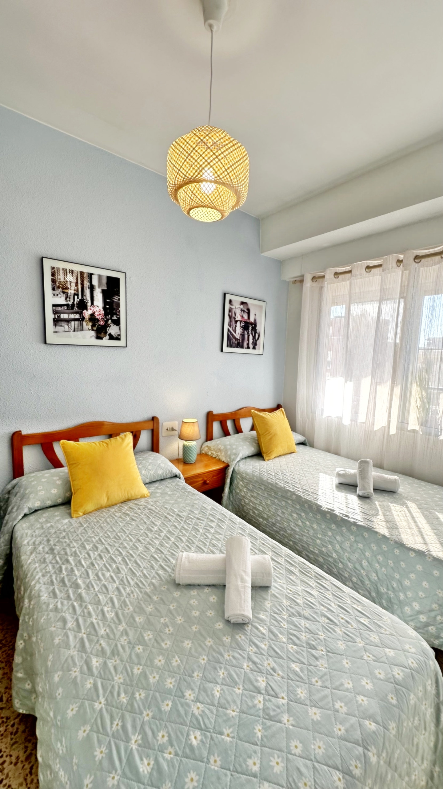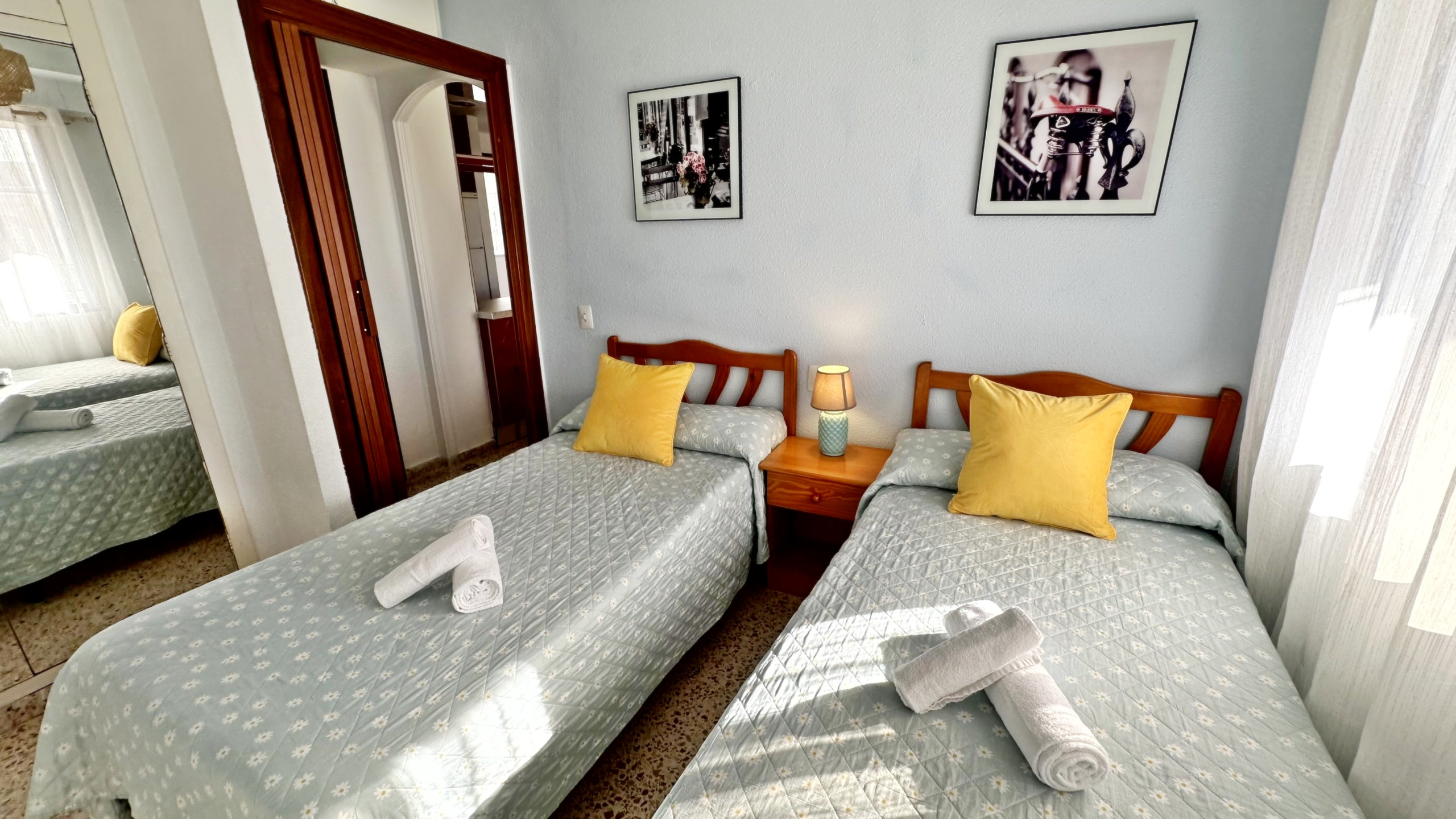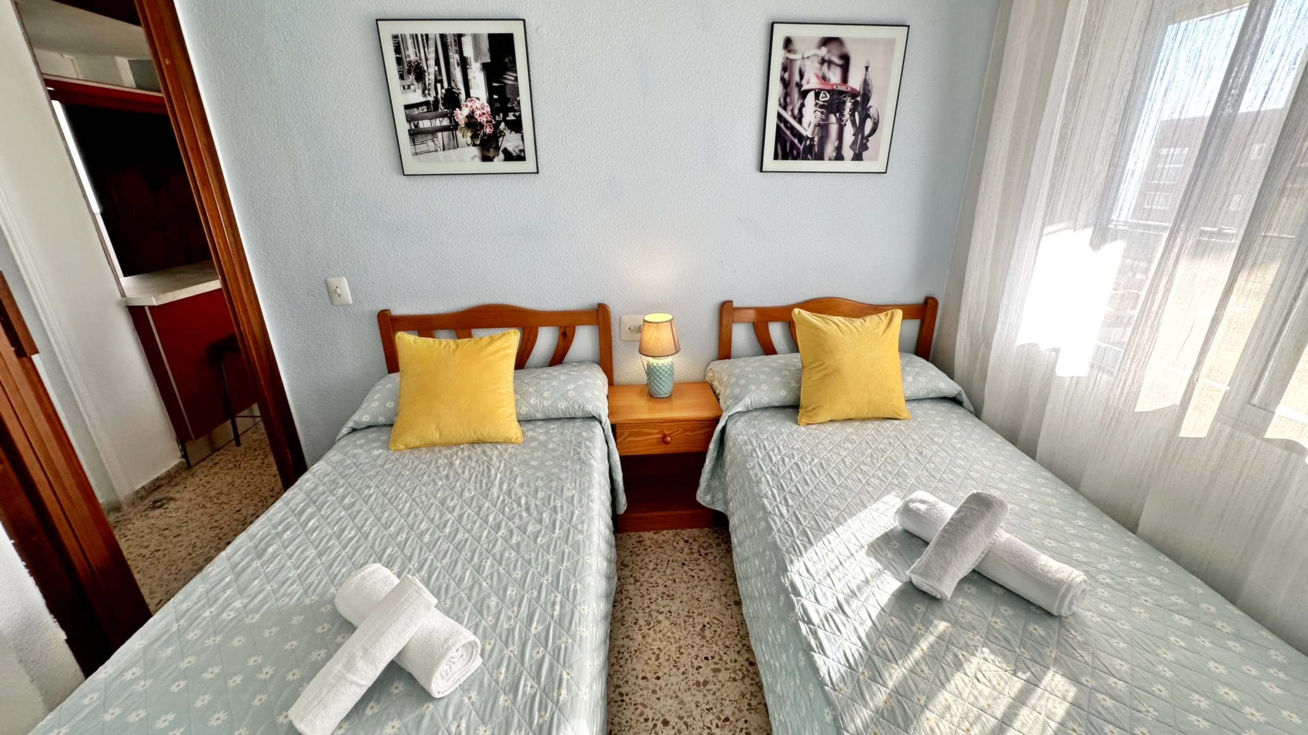 Consta de: 1 dormitorio con dos camas individuales, salón con sofá-cama, cocina americana totalmente equipada, 1 cuarto de baño completo con bañera y terraza con vistas directas a la playa y al paseo marítimo.