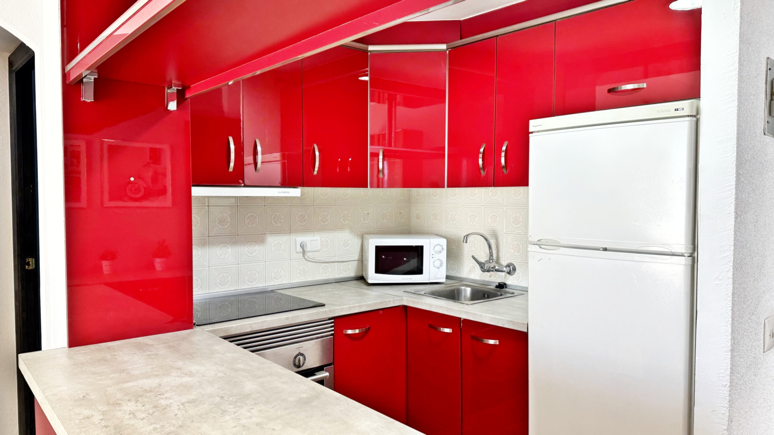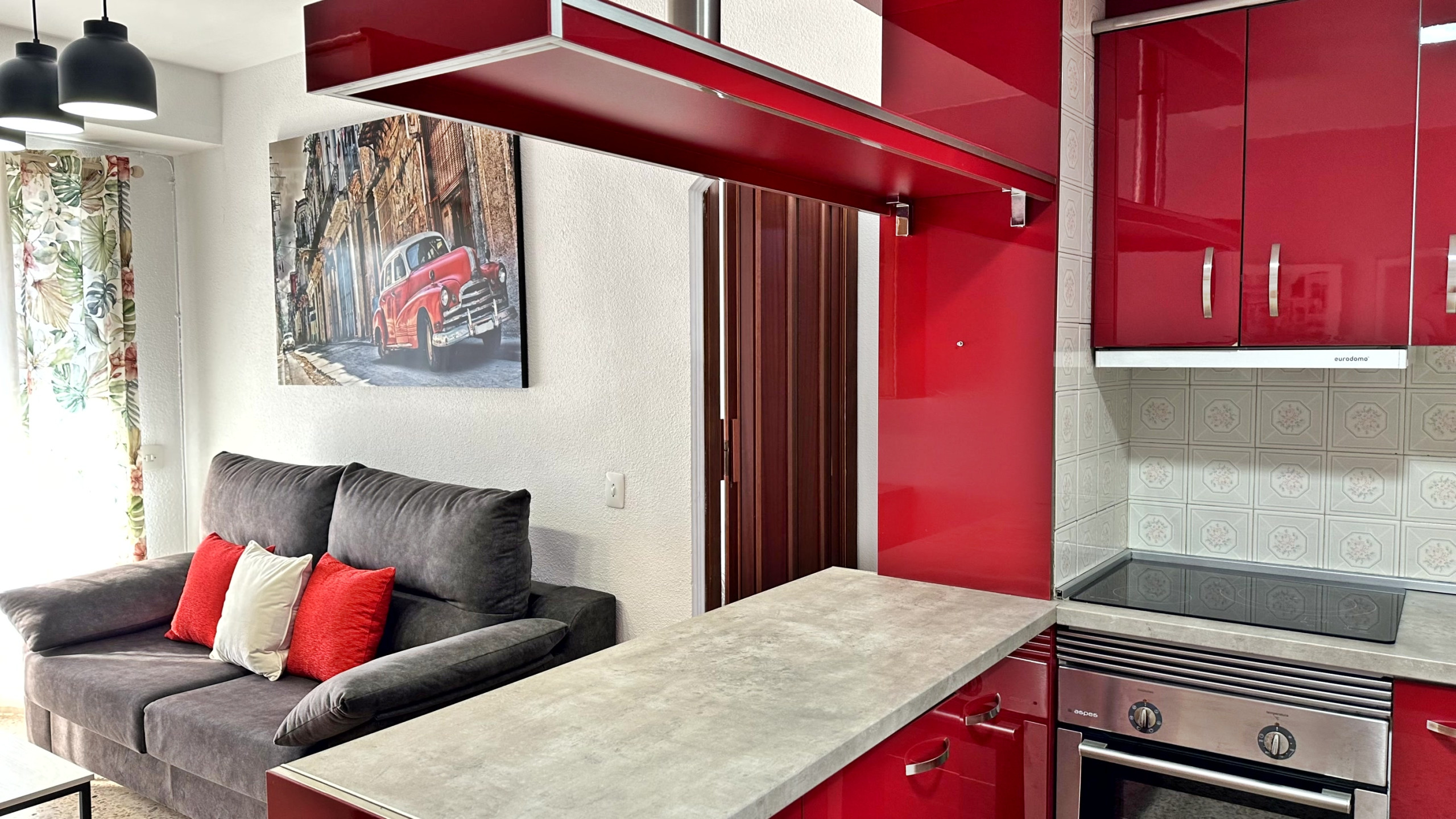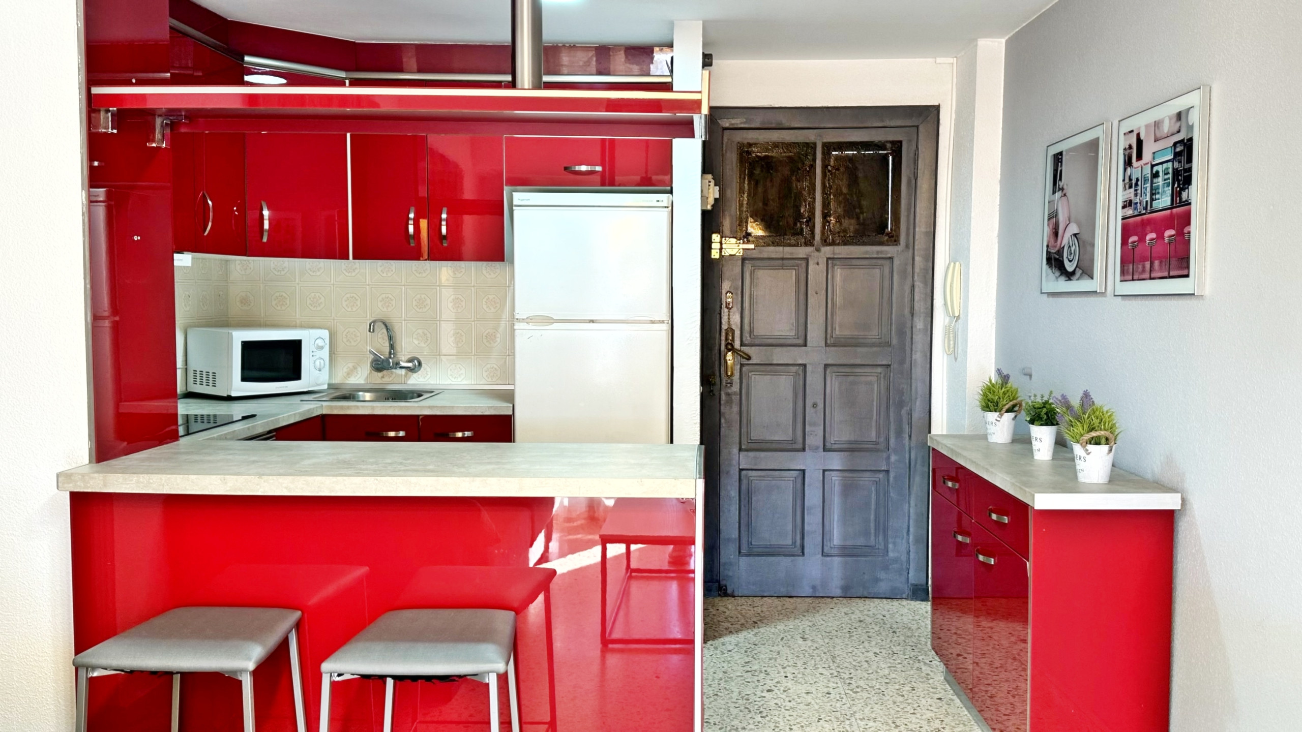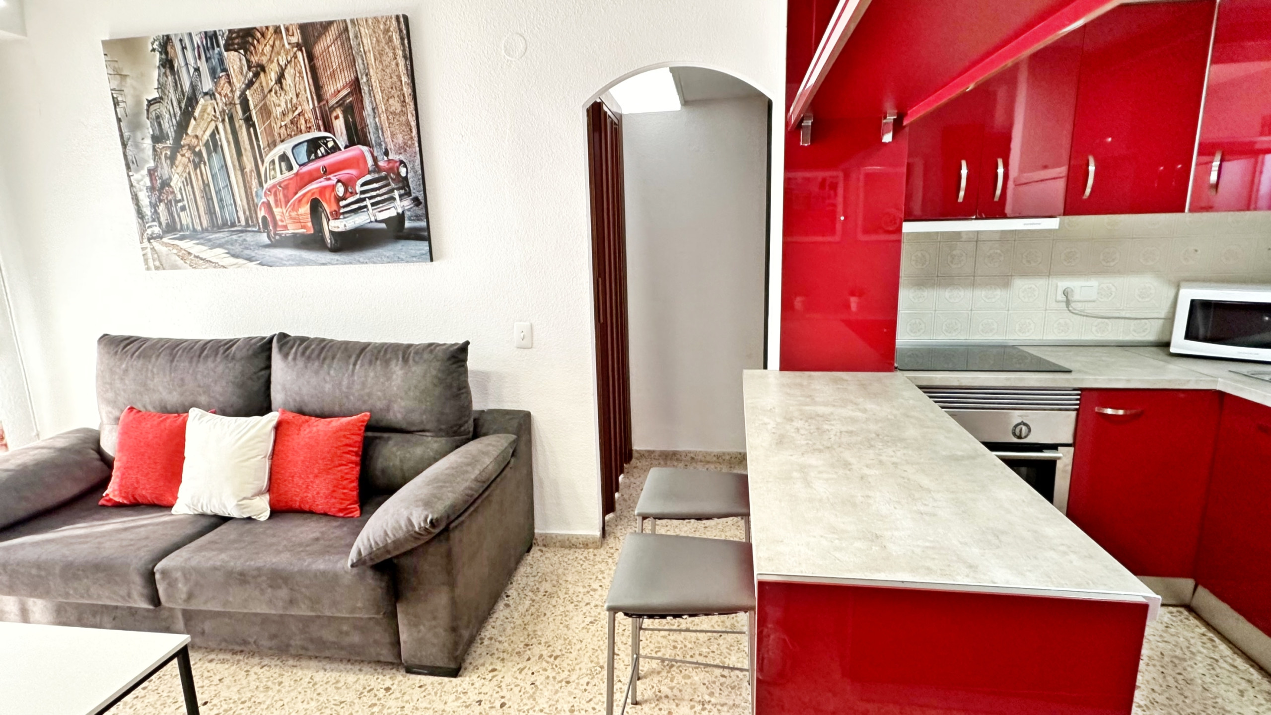 Consta de: 1 dormitorio con dos camas individuales, salón con sofá-cama, cocina americana totalmente equipada, 1 cuarto de baño completo con bañera y terraza con vistas directas a la playa y al paseo marítimo.