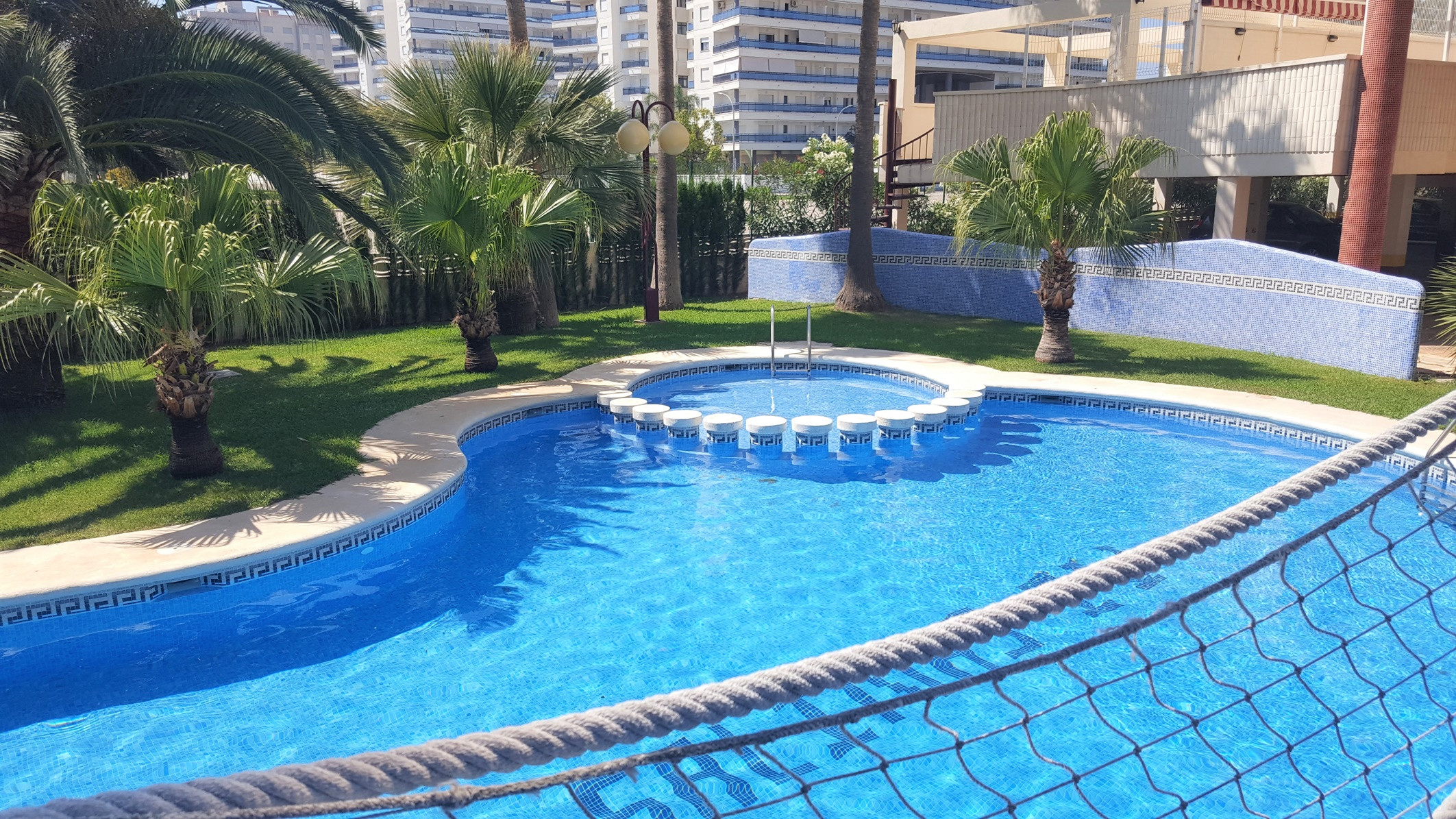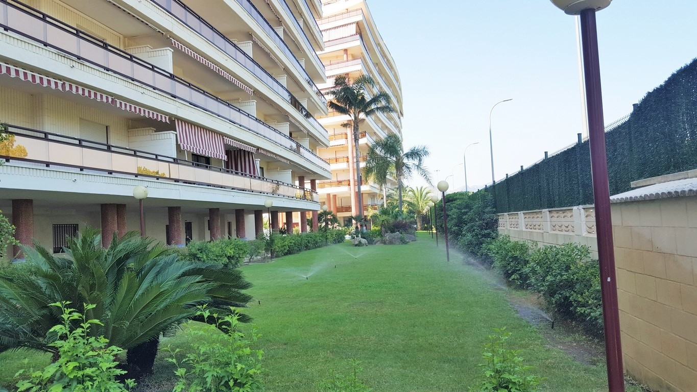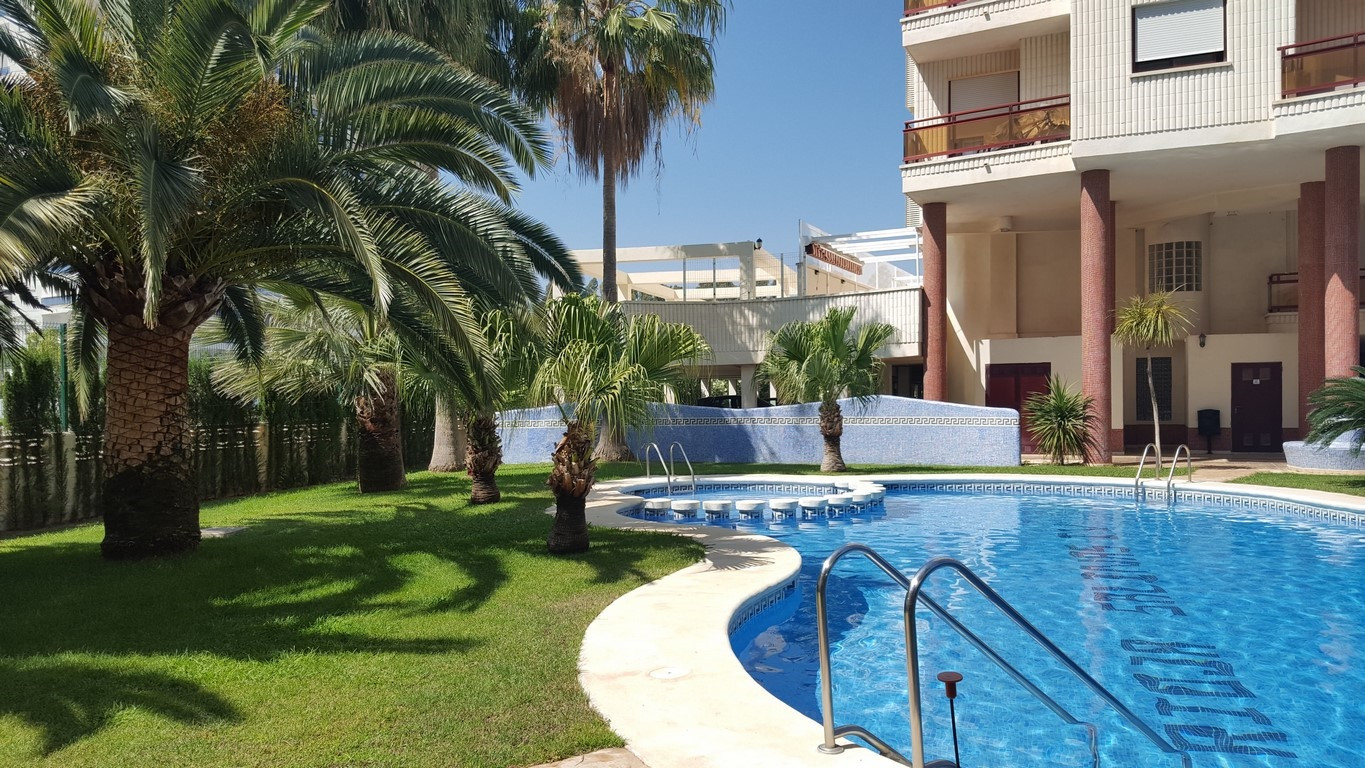 Moderno Apartamento de 3 dormitorios situado a 400 metros de la playa, con piscina, amplios jardines con zona para juegos, gran piscina adultos y piscina infantil, cancha de pádel y cancha de tenis. Aparcamiento para 1 coche.