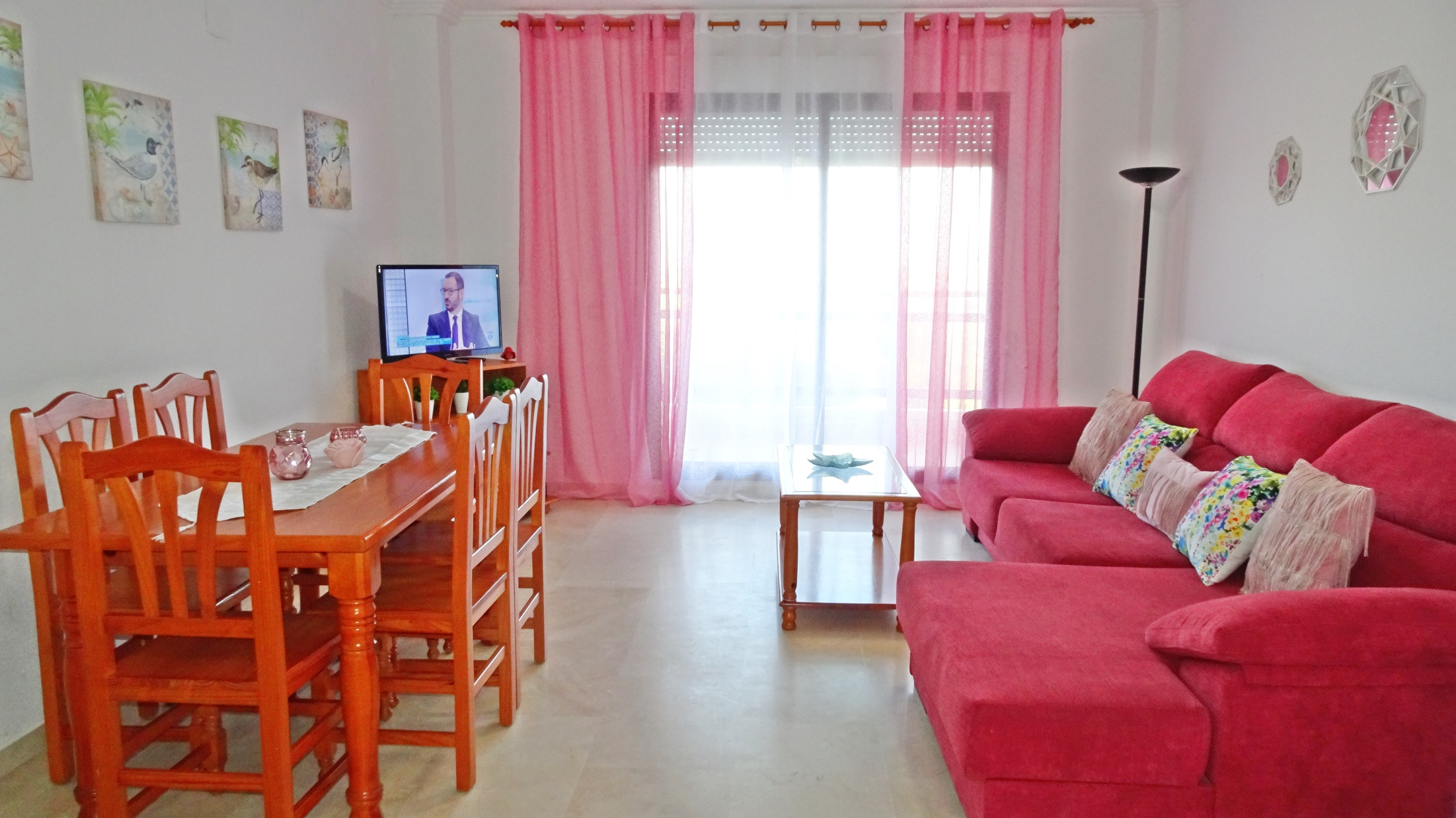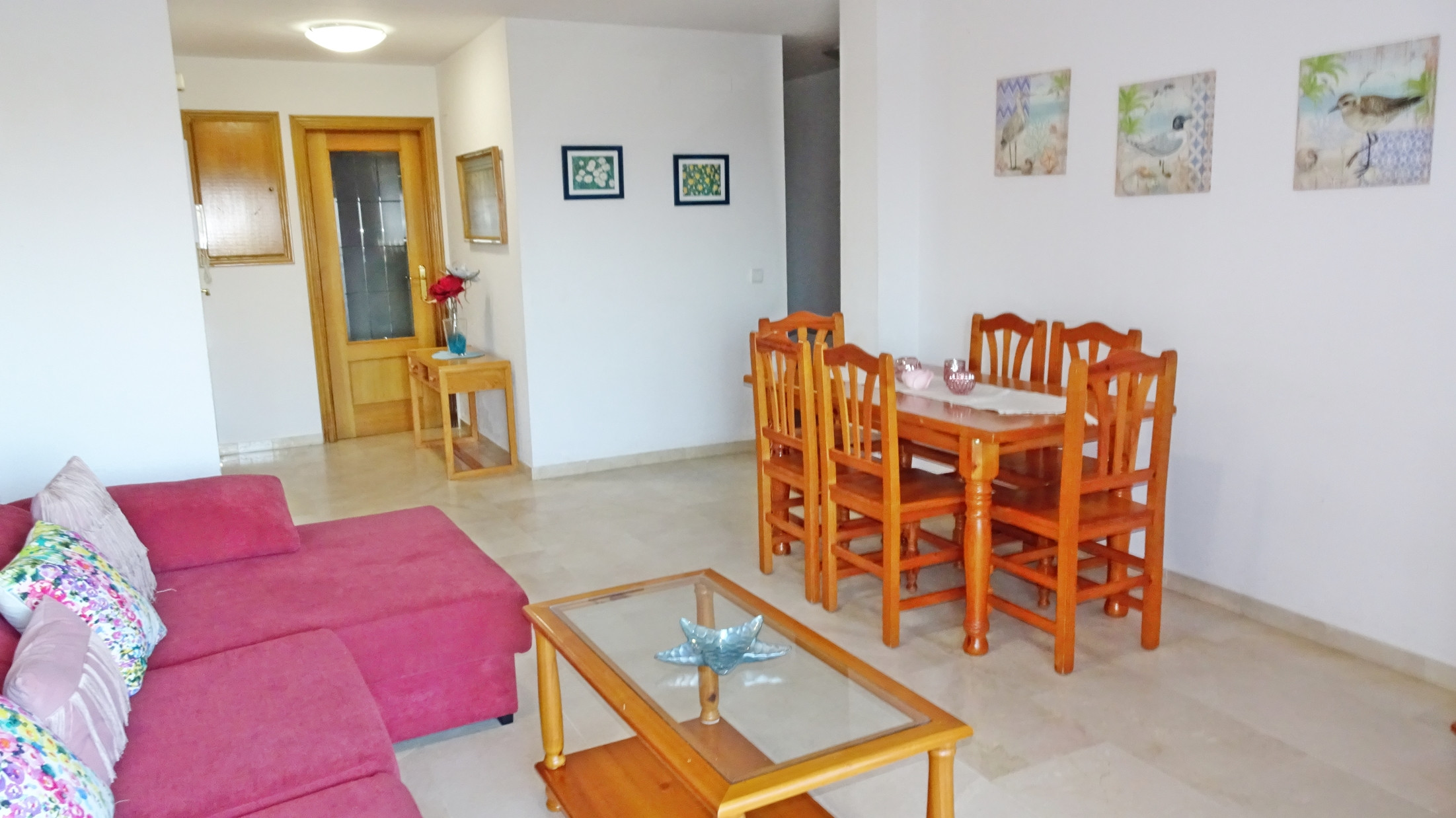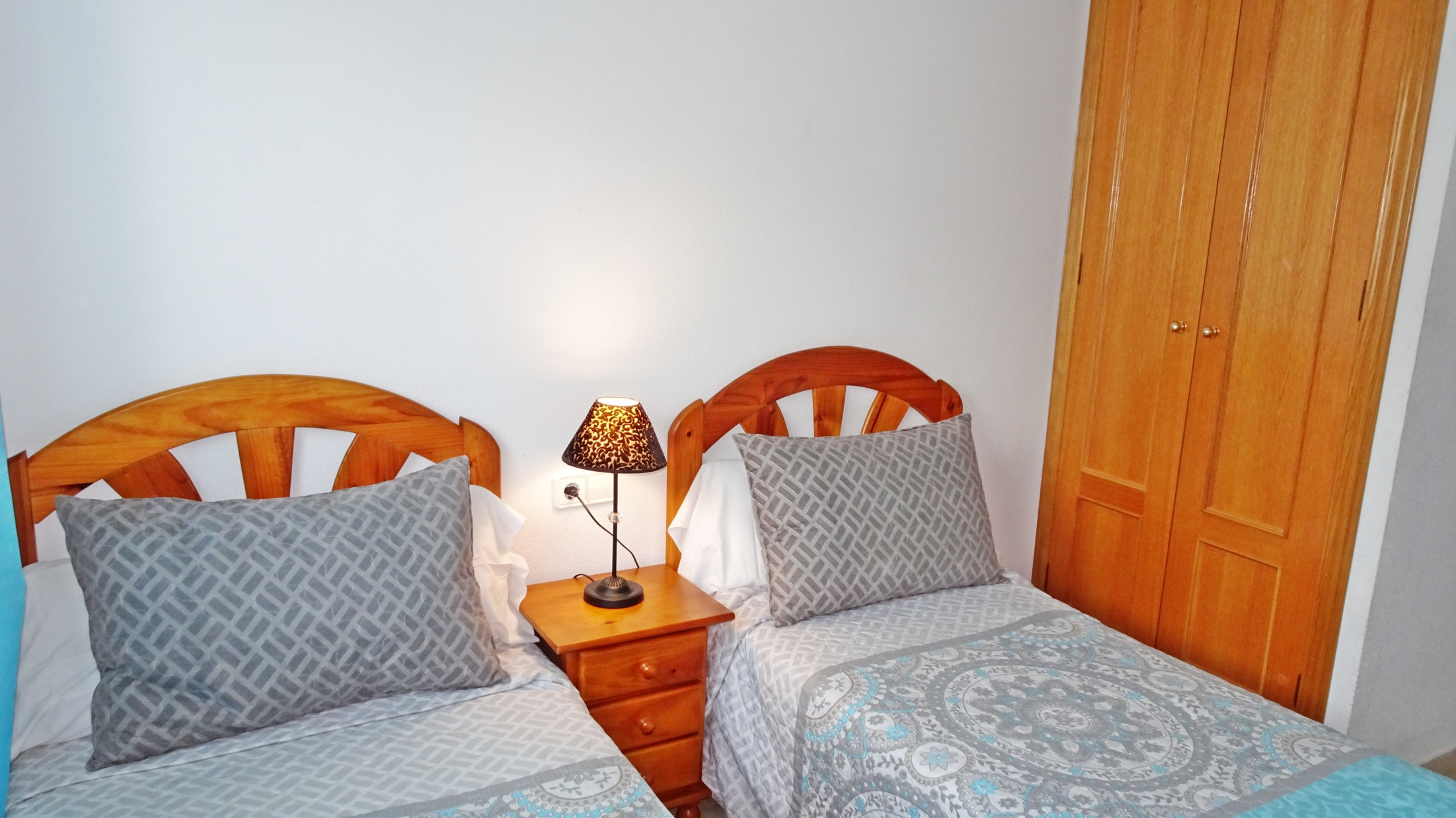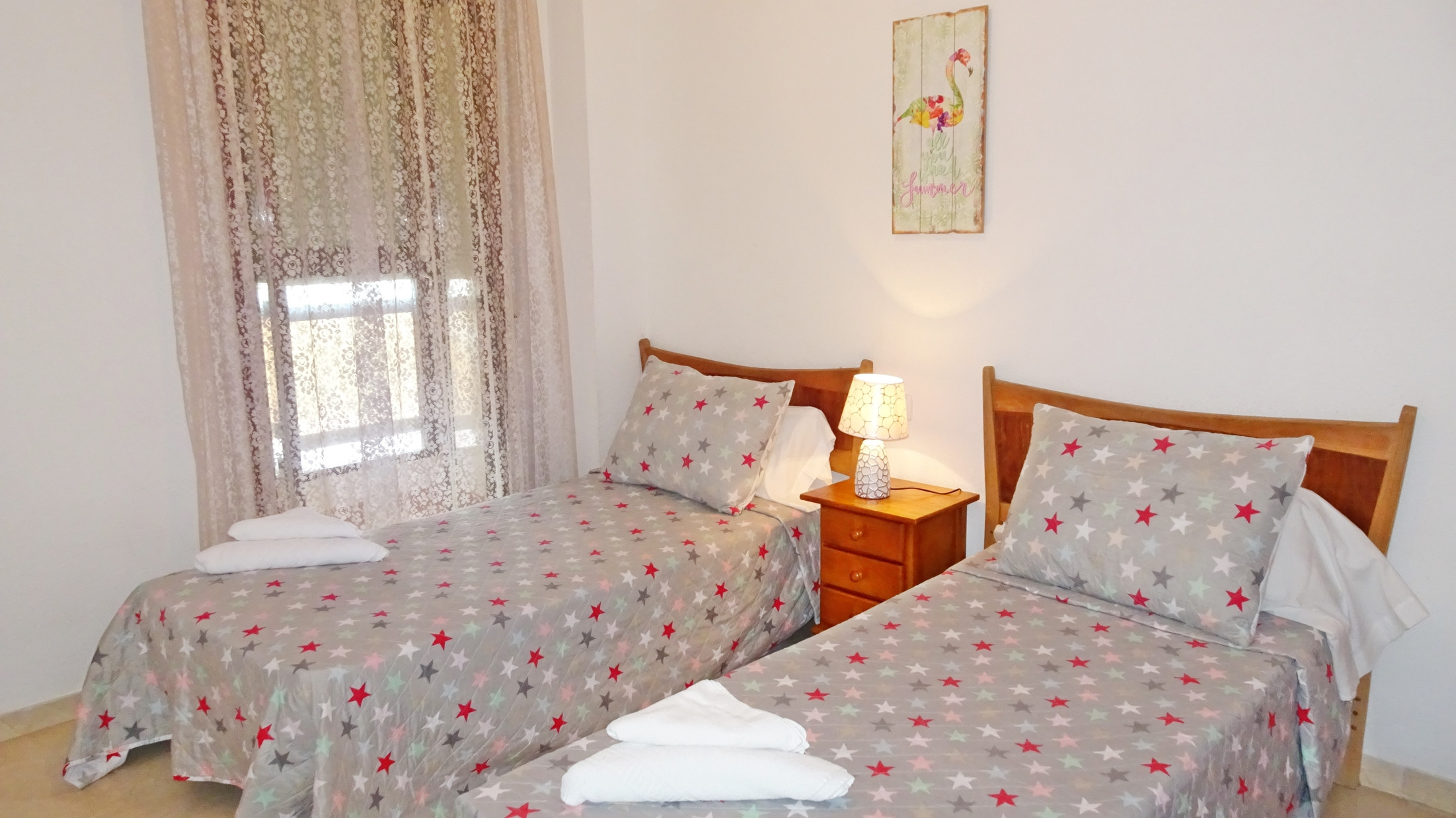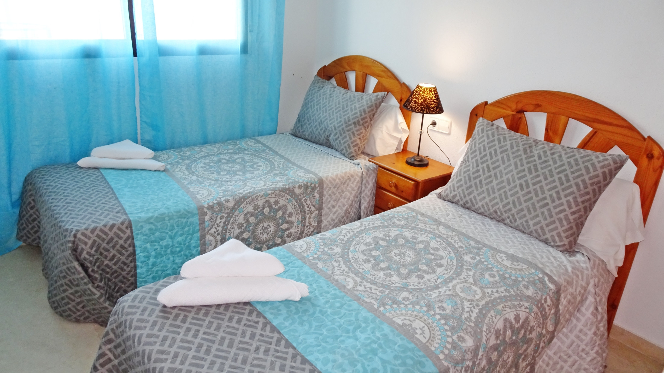 CONSTA DE: 3 dormitorios con cama de matrimonio, un cuarto de baño con ducha. Salón comedor con una cama plegable para 1 persona. En uno de los dormitorios, (dormitorio de color amarillo) hay un ventilador de techo. Cocina independiente totalmente equipada con vitro. Gran terraza con vistas laterales a la playa.