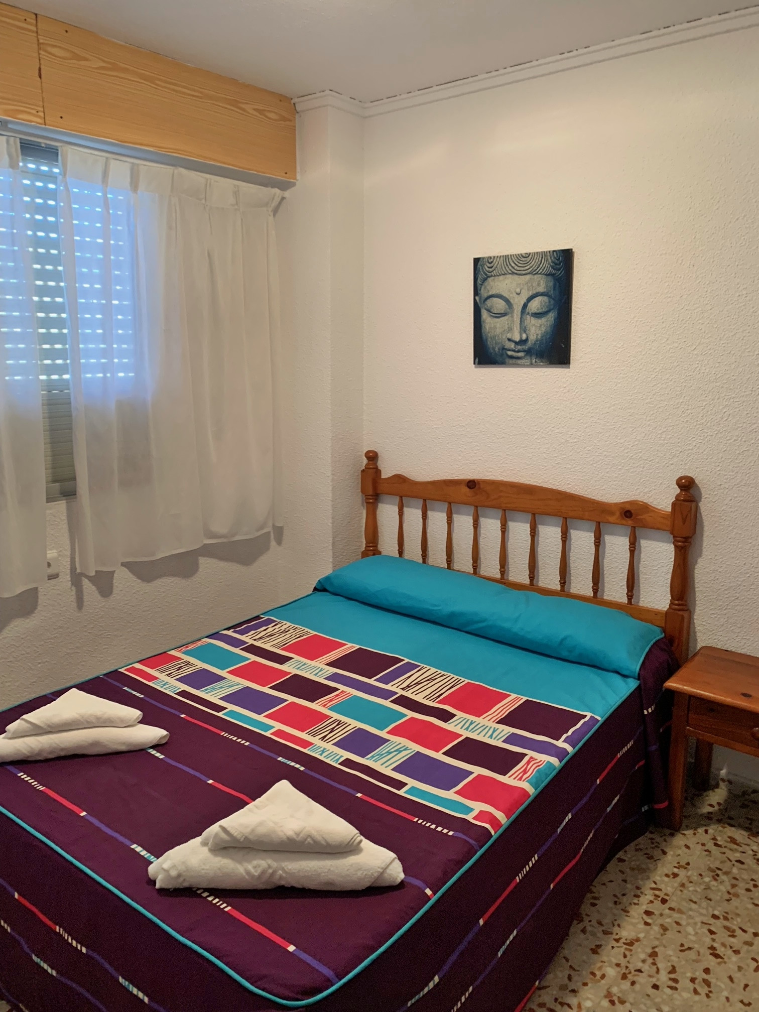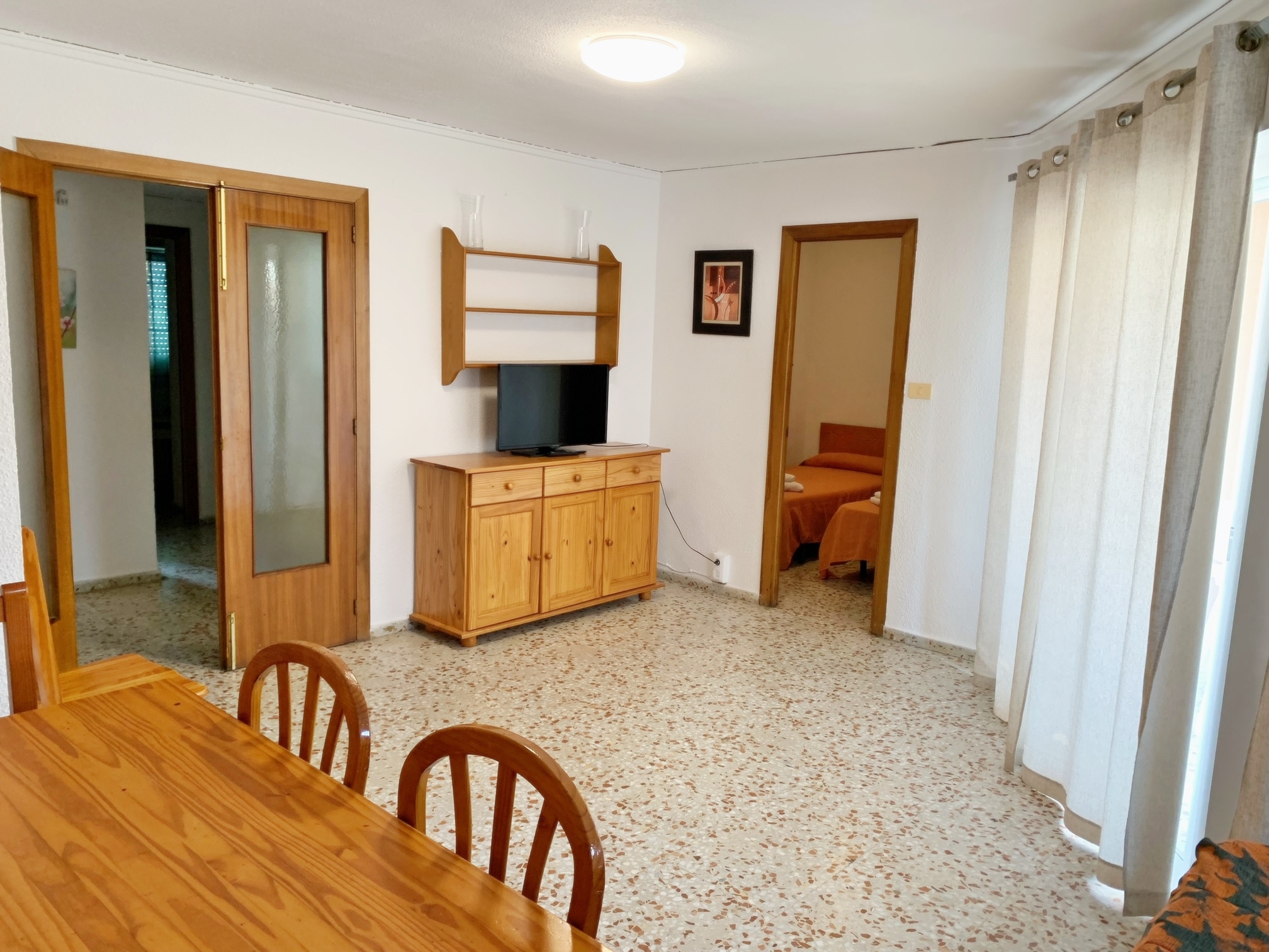 CONSTA DE: 3 dormitorios con cama de matrimonio, un cuarto de baño con ducha. Salón comedor con una cama plegable para 1 persona. En uno de los dormitorios, (dormitorio de color amarillo) hay un ventilador de techo. Cocina independiente totalmente equipada con vitro. Gran terraza con vistas laterales a la playa.