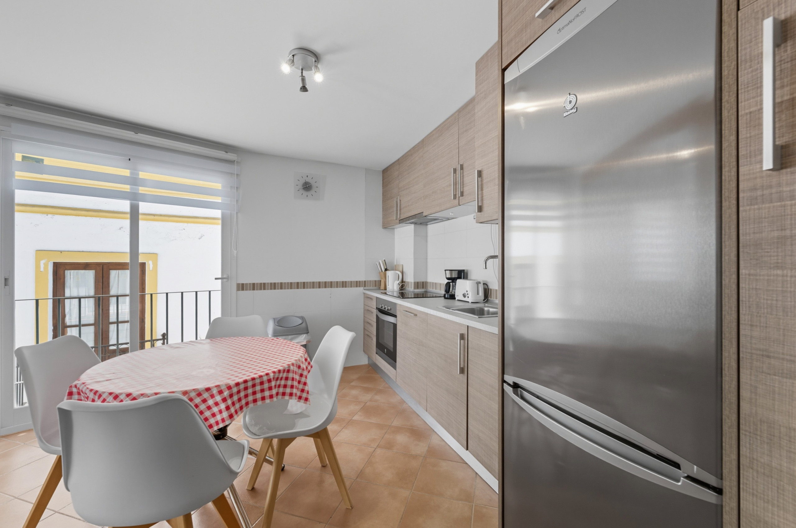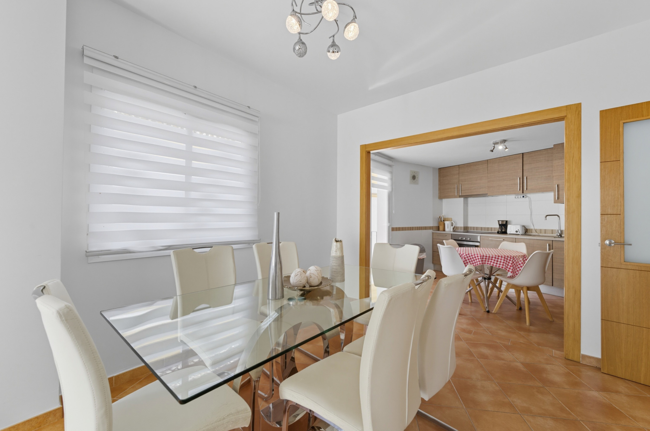 El punto culminante del apartamento es su gran terraza, que ofrece vistas parciales al mar y a la montaña, con vistas a las áreas de jardín y piscina. Este es un lugar ideal para relajarse y disfrutar de las noches de verano. El apartamento cuenta con una cocina semiabierta junto al comedor y la sala de estar, con acceso directo a la terraza.