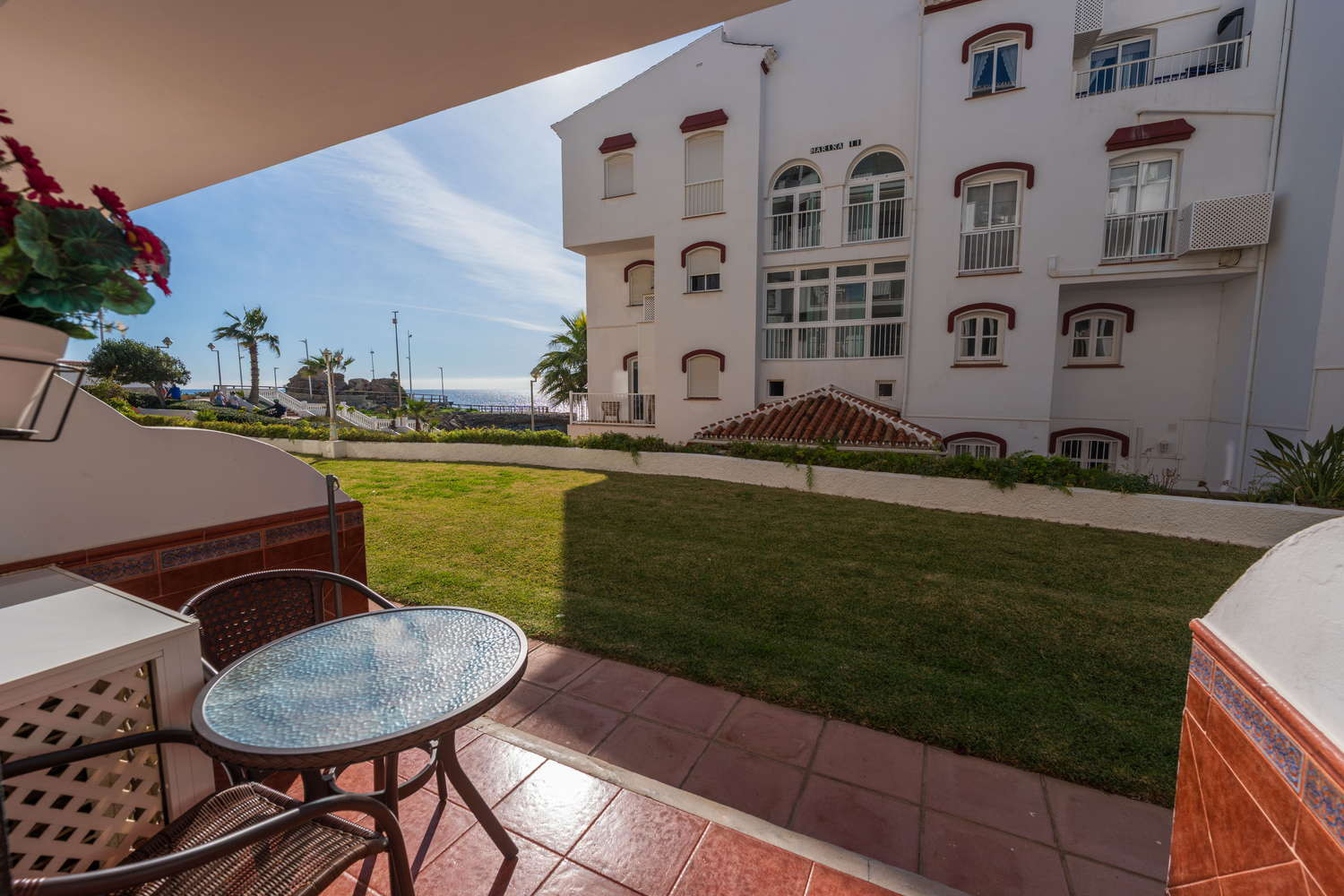 Vida interior y exterior: El apartamento dispone de un balcón funcional donde disfrutar de la temperatura de Nerja. A pocos pasos de su puerta encontrará el acceso exclusivo a las zonas comunes del edificio, donde podrá relajarse en el césped del jardín comunitario con vistas directas al mar o bañarse en la piscina suspendida sobre la costa.
