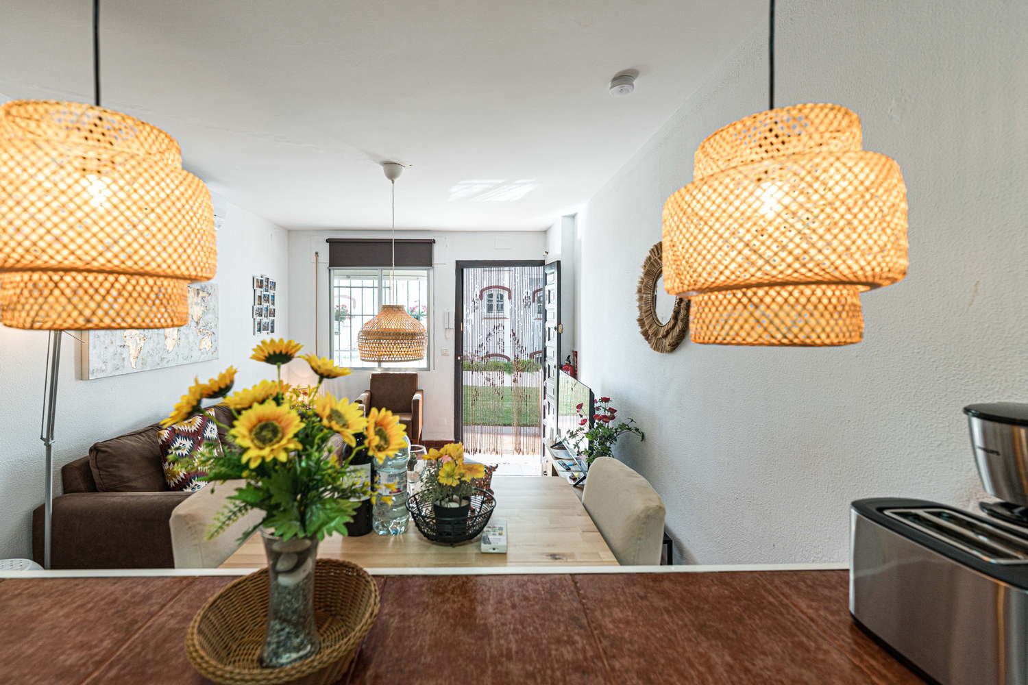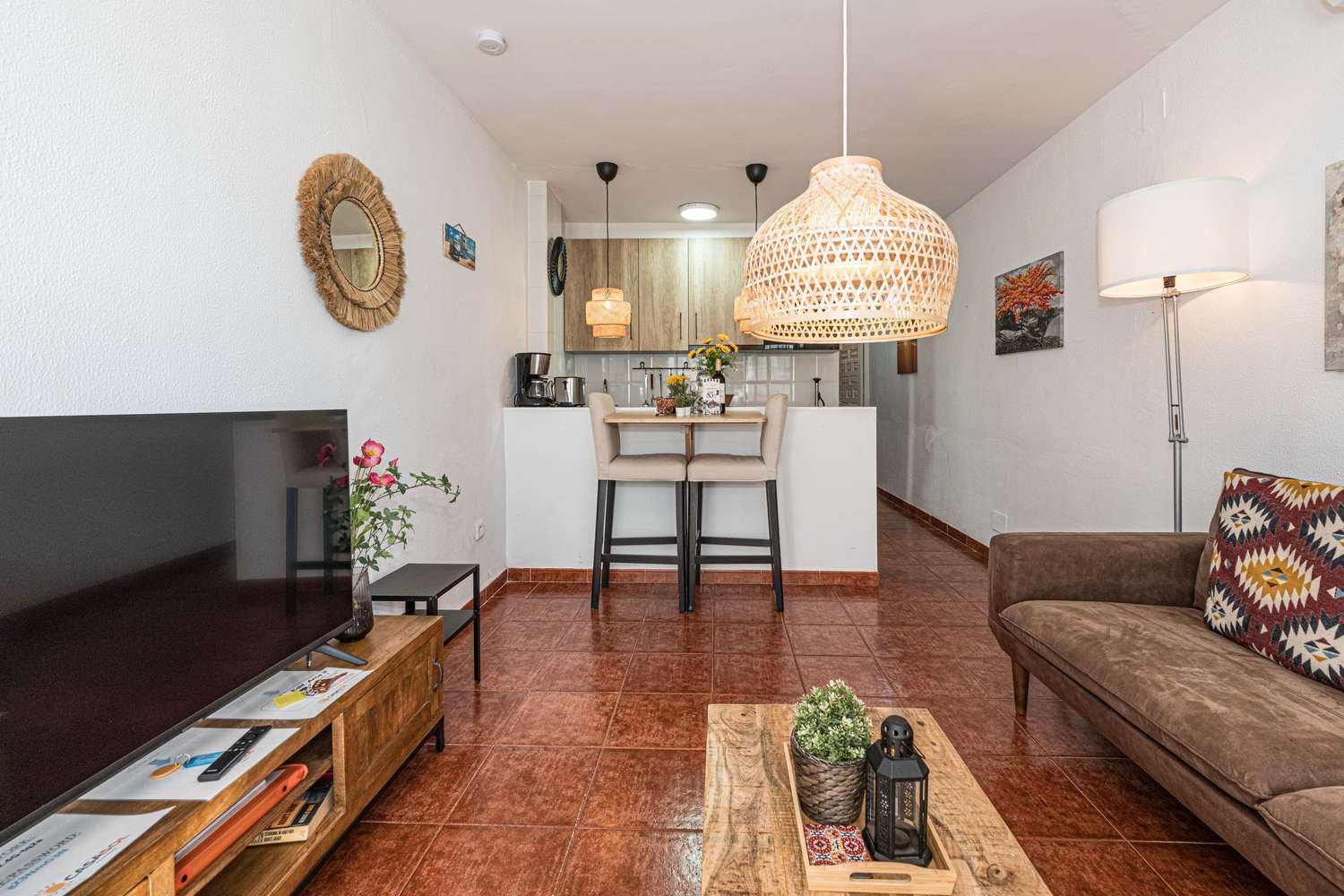Vida interior y exterior: La vida aquí sucede entre el salón y su terraza privada a pie de calle. La fluidez del espacio os permite pasar del sofá al exterior en un segundo, convirtiendo este rincón con vistas al mar en el lugar perfecto para esas cenas tranquilas tras un día explorando las calas de Nerja.