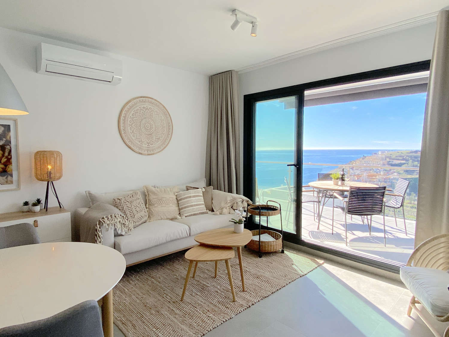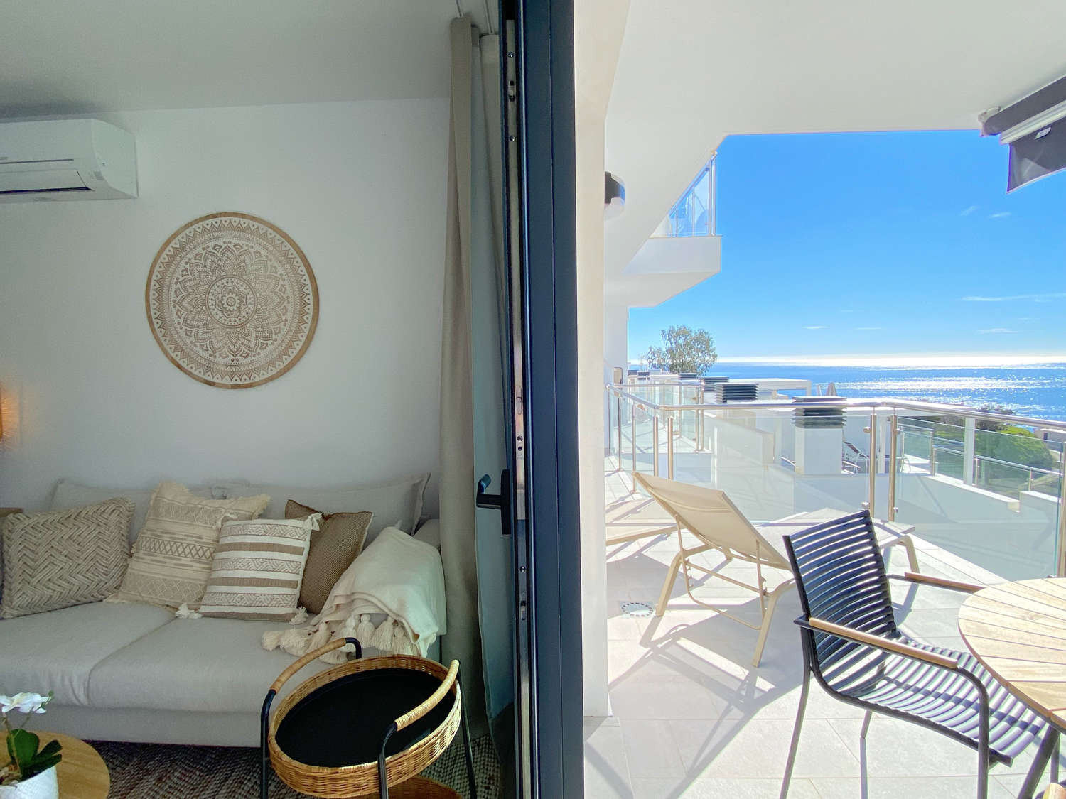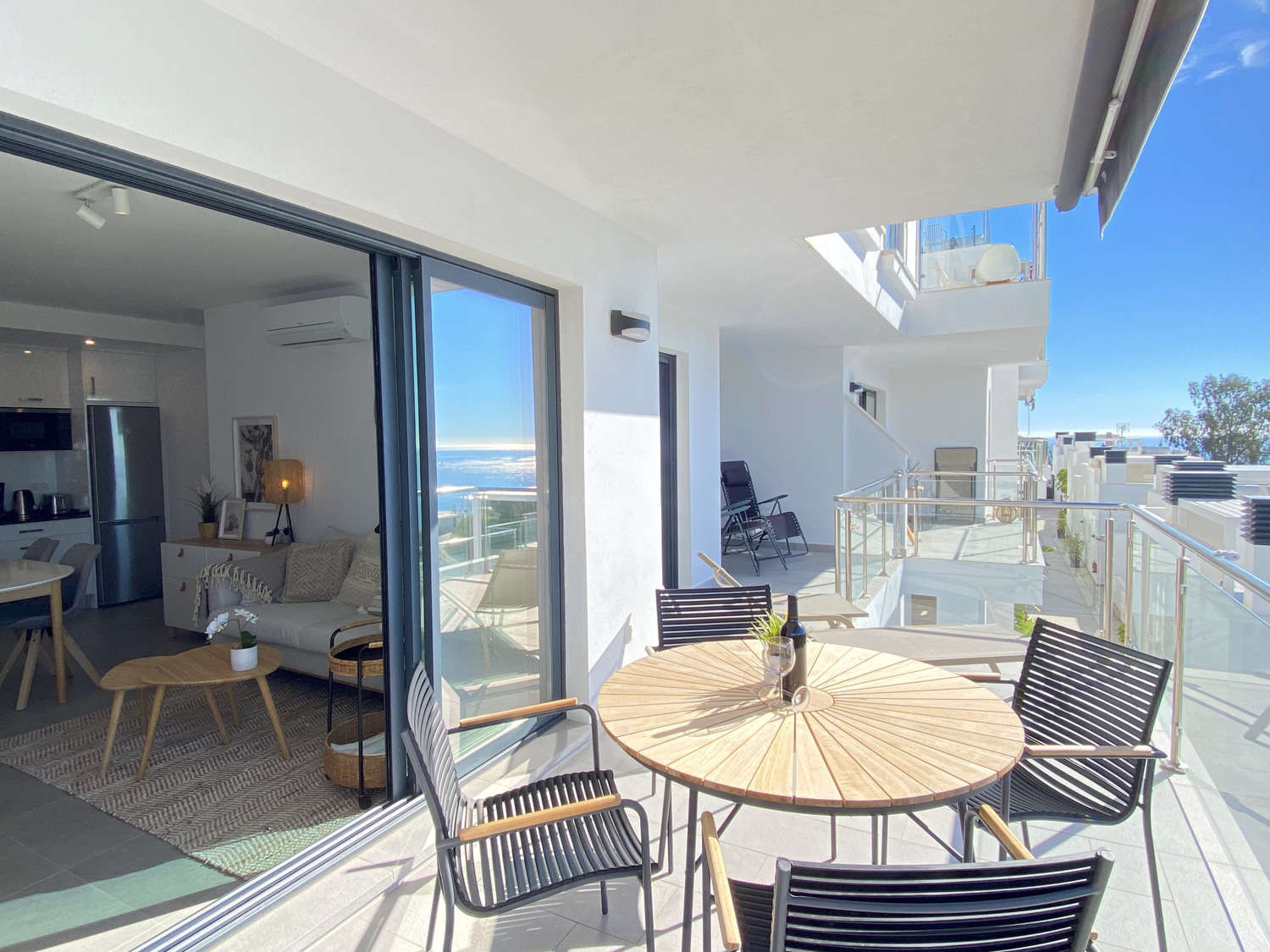 Sienta la exclusividad de este espectacular apartamento en la Urbanización Balcón del Mar, donde la altura de una segunda planta garantiza las mejores panorámicas. Diseñado para el máximo relax, su amplia terraza privada con tumbonas es el lugar perfecto para tomar el sol con total privacidad o disfrutar de una cena inolvidable gracias a su barbacoa de gas con el Mediterráneo de fondo.La Propiedad: Este alojamiento destaca por su luminosidad y una distribución inteligente que prioriza el entorno. Cuenta con dos dormitorios con camas dobles, ambos con la característica única de ofrecer vistas al mar desde la cama, permitiéndole despertar con el azul del horizonte. Dispone de dos baños completos con ducha y una cocina de concepto moderno equipada con electrodomésticos de última generación para una estancia de lujo.