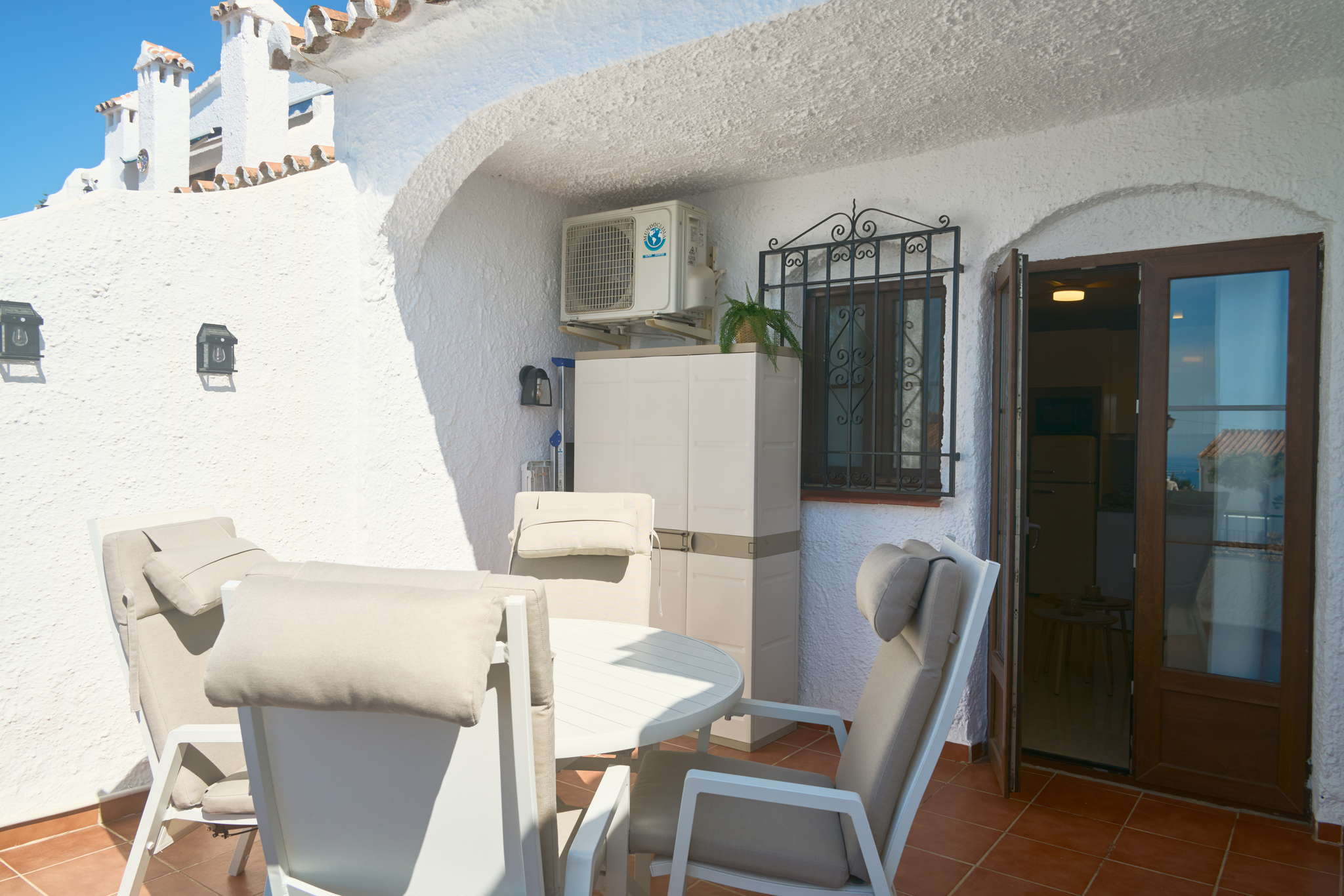 Disfrute de un desayuno bajo el sol en la terraza de Casa Sofia mientras contempla el azul del Mediterráneo y el diseño de pueblo blanco andaluz que caracteriza esta zona. Este apartamento con vistas al mar en Nerja es la opción ideal para parejas que buscan un entorno tranquilo, alejado del ruido del centro pero con todas las facilidades de un complejo de primer nivel que incluye jardines cuidados y servicios compartidos.