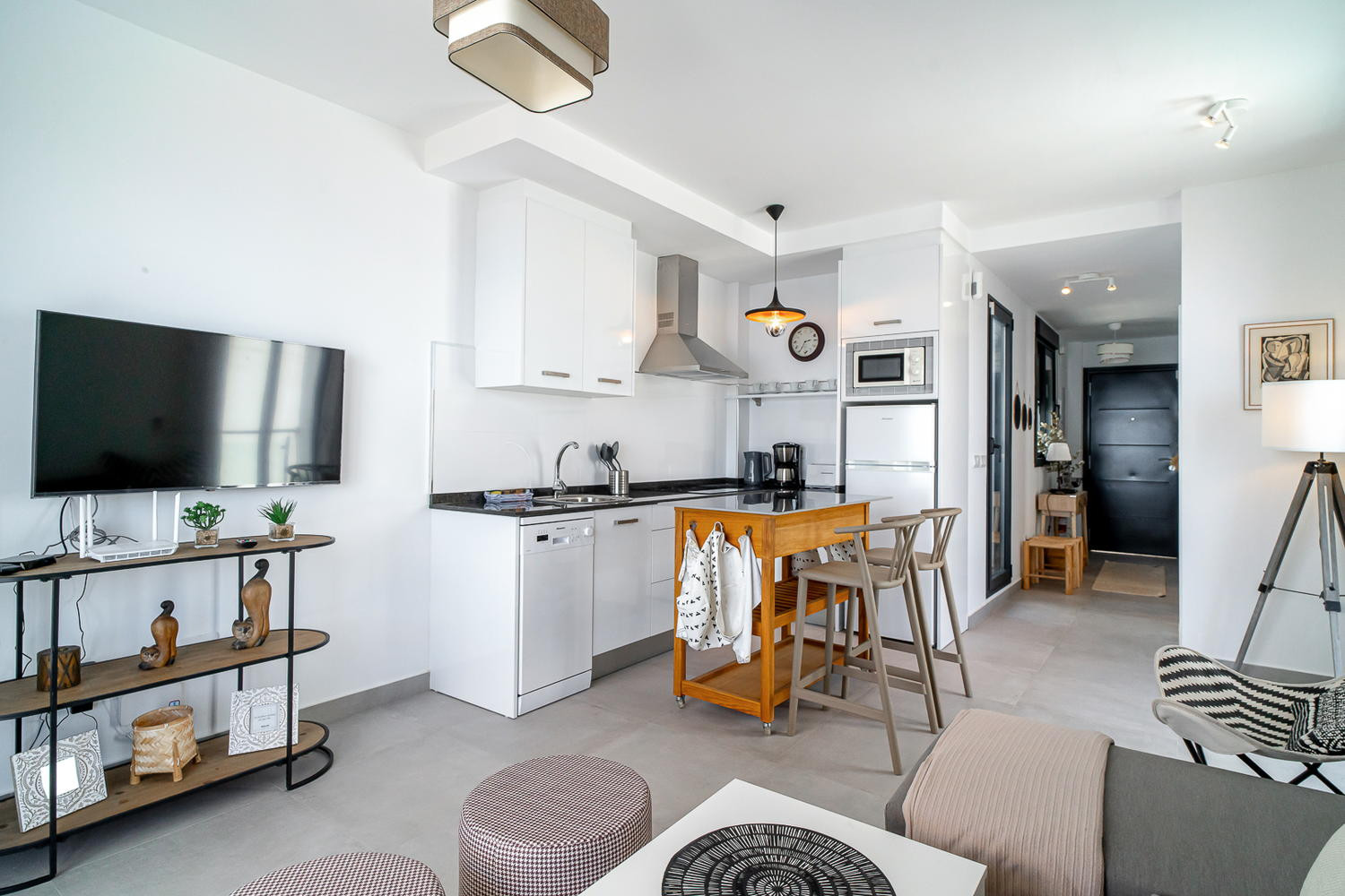 Este exclusivo apartamento en la urbanización Terrazas de Ladera está diseñado para quienes buscan intimidad y un horizonte despejado. Imagínese desayunar sin prisa en su terraza privada orientada al sur, sintiendo la brisa marina y contemplando una panorámica ininterrumpida del Mediterráneo. Es el refugio perfecto para desconectar de la rutina y disfrutar de un entorno de máxima desconexión y diseño moderno.La Propiedad: El espacio ha sido optimizado para el confort en pareja. Cuenta con un dormitorio principal con cama de matrimonio y colchón de alta calidad, garantizando un descanso profundo. Dispone de un baño moderno y una cocina de diseño totalmente equipada (con lavavajillas y electrodomésticos de última gama) abierta al salón para no perder de vista el mar ni un segundo.