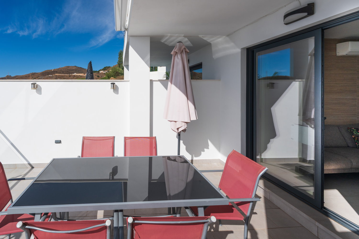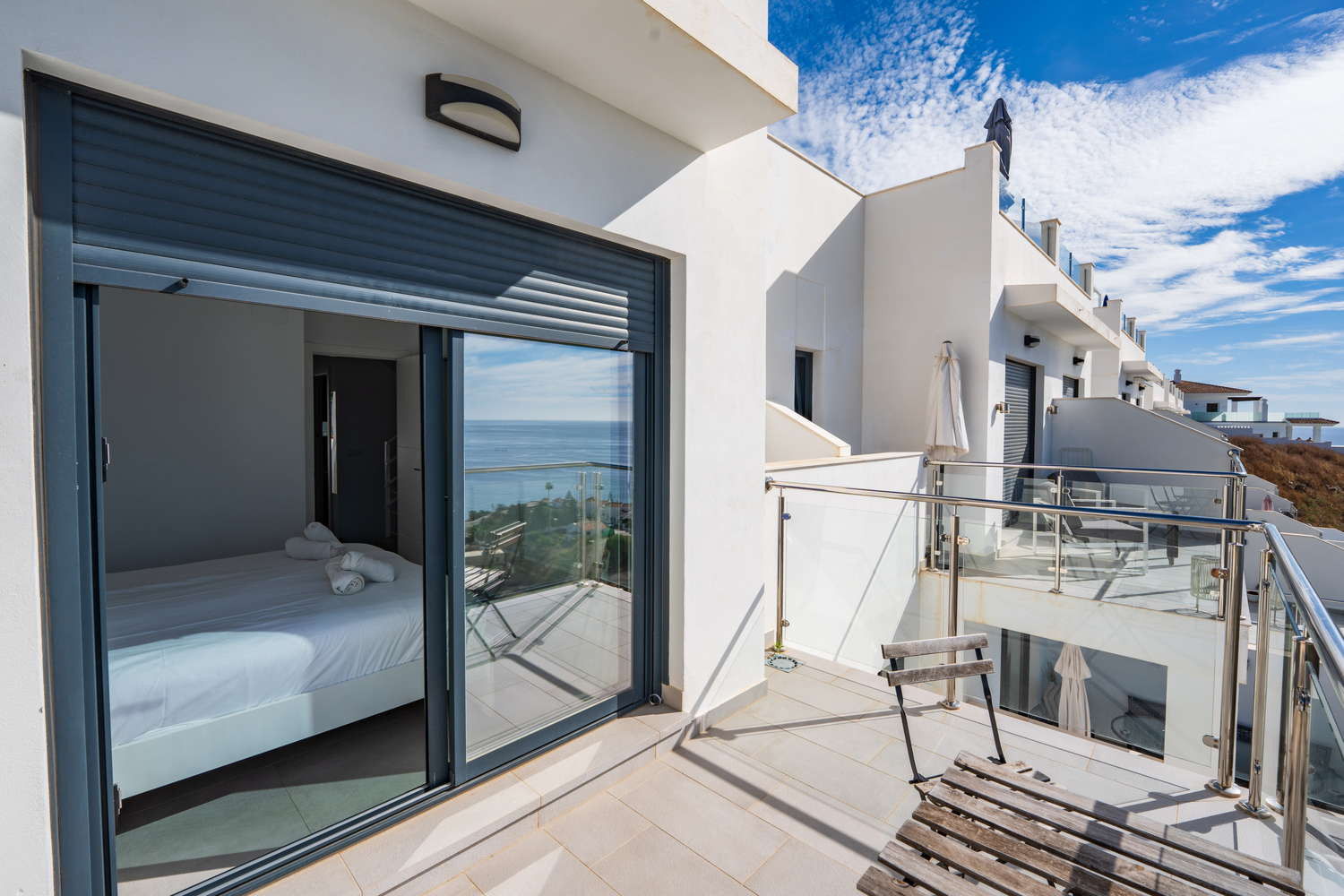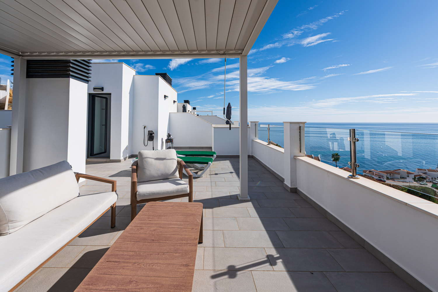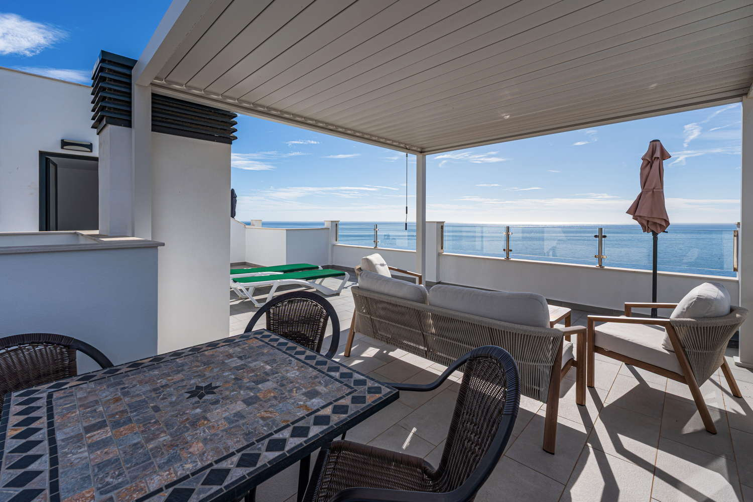 El apartamento en sí está diseñado pensando en su máxima comodidad. Cuenta con una gran terraza privada, accesible desde todas las habitaciones, que ofrece un tranquilo espacio al aire libre para cenar, relajarse o simplemente tomar el sol de Nerja.