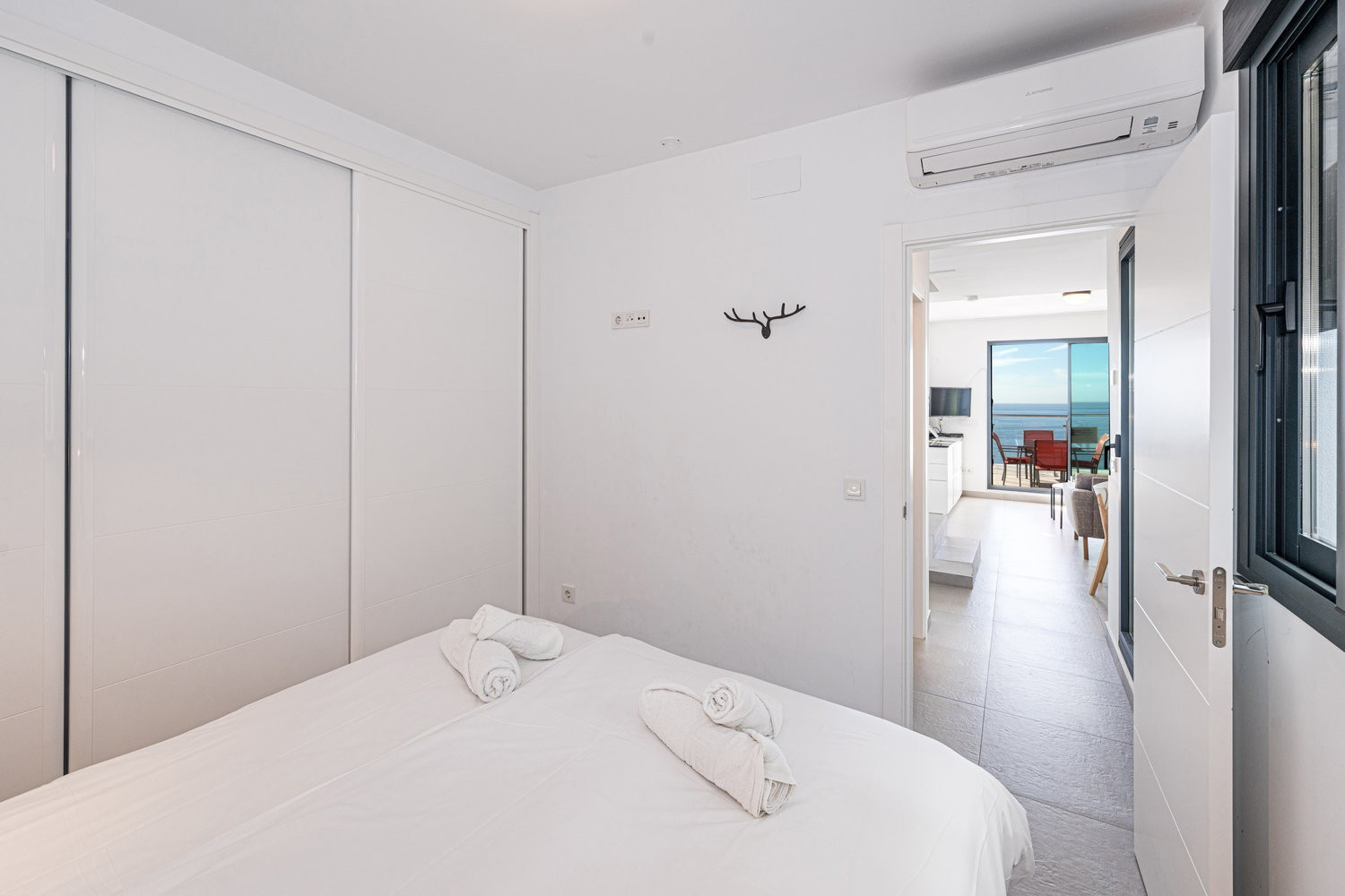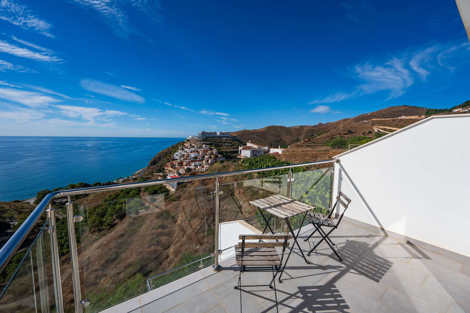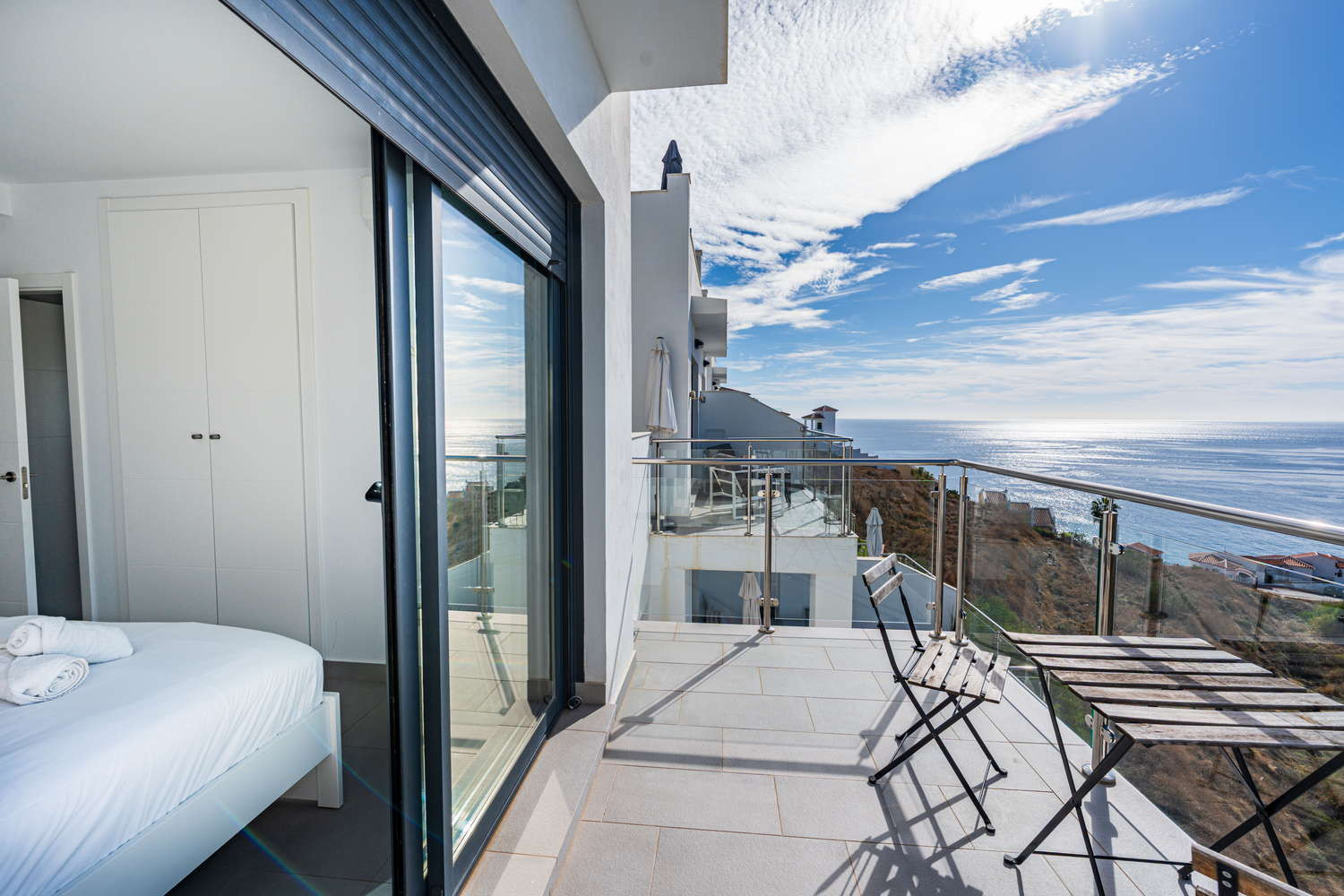El apartamento en sí está diseñado pensando en su máxima comodidad. Cuenta con una gran terraza privada, accesible desde todas las habitaciones, que ofrece un tranquilo espacio al aire libre para cenar, relajarse o simplemente tomar el sol de Nerja.