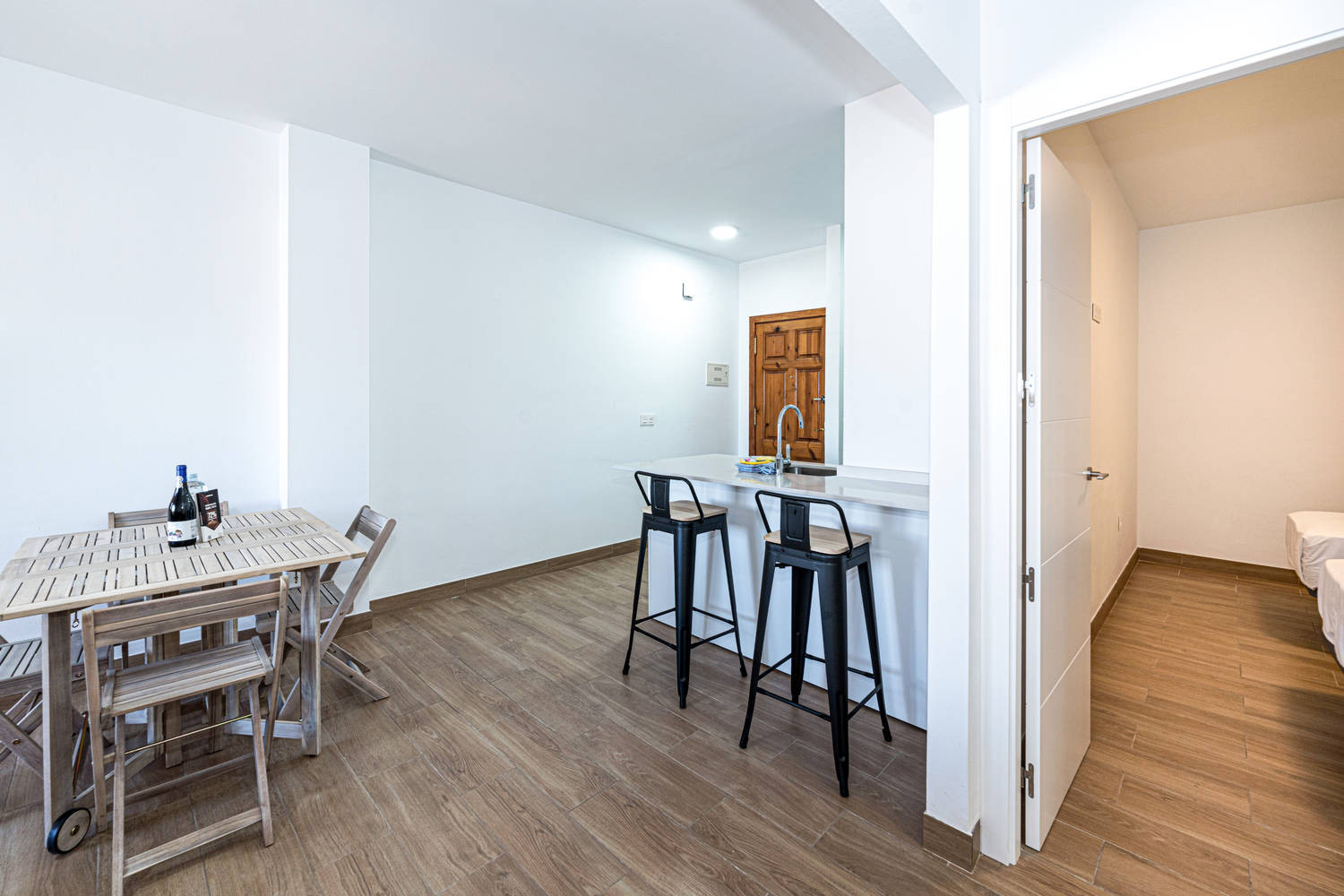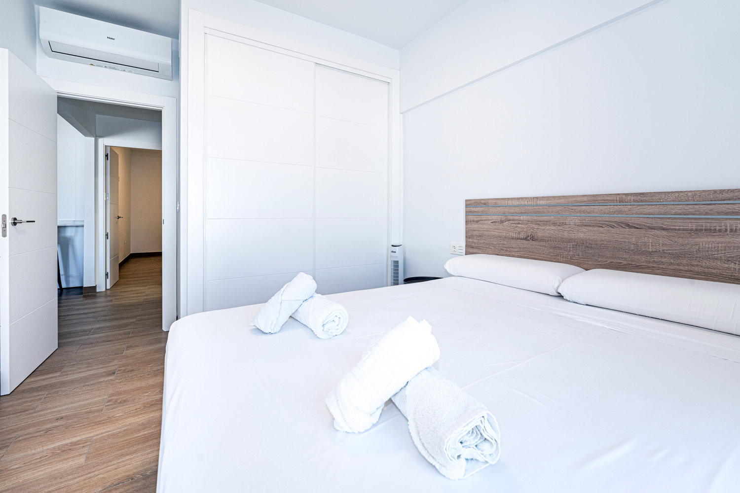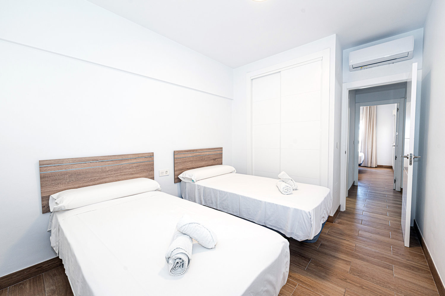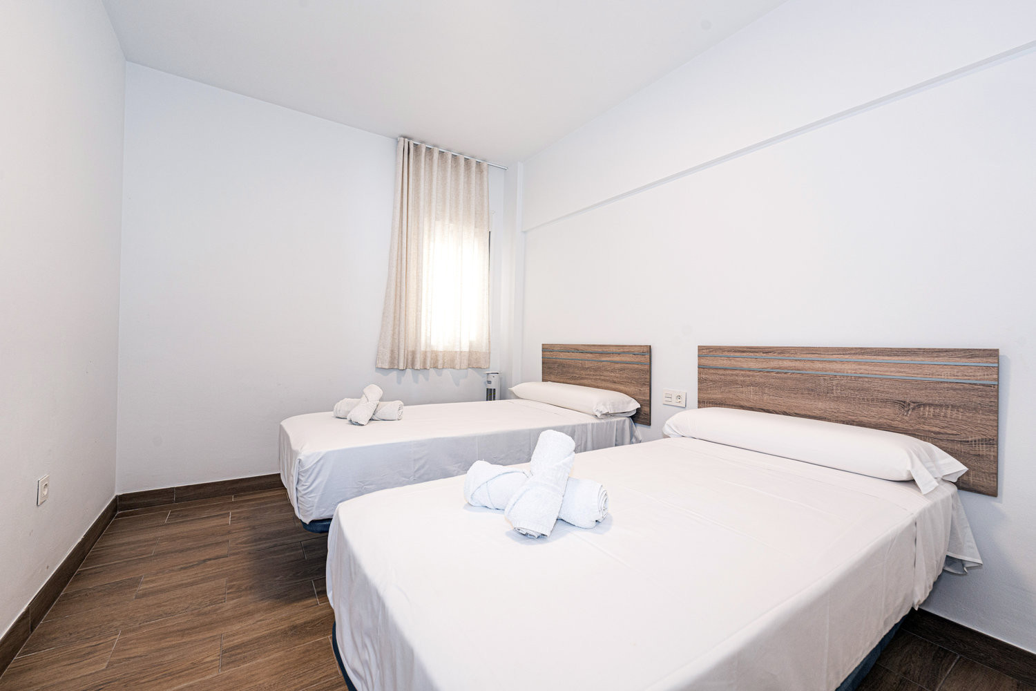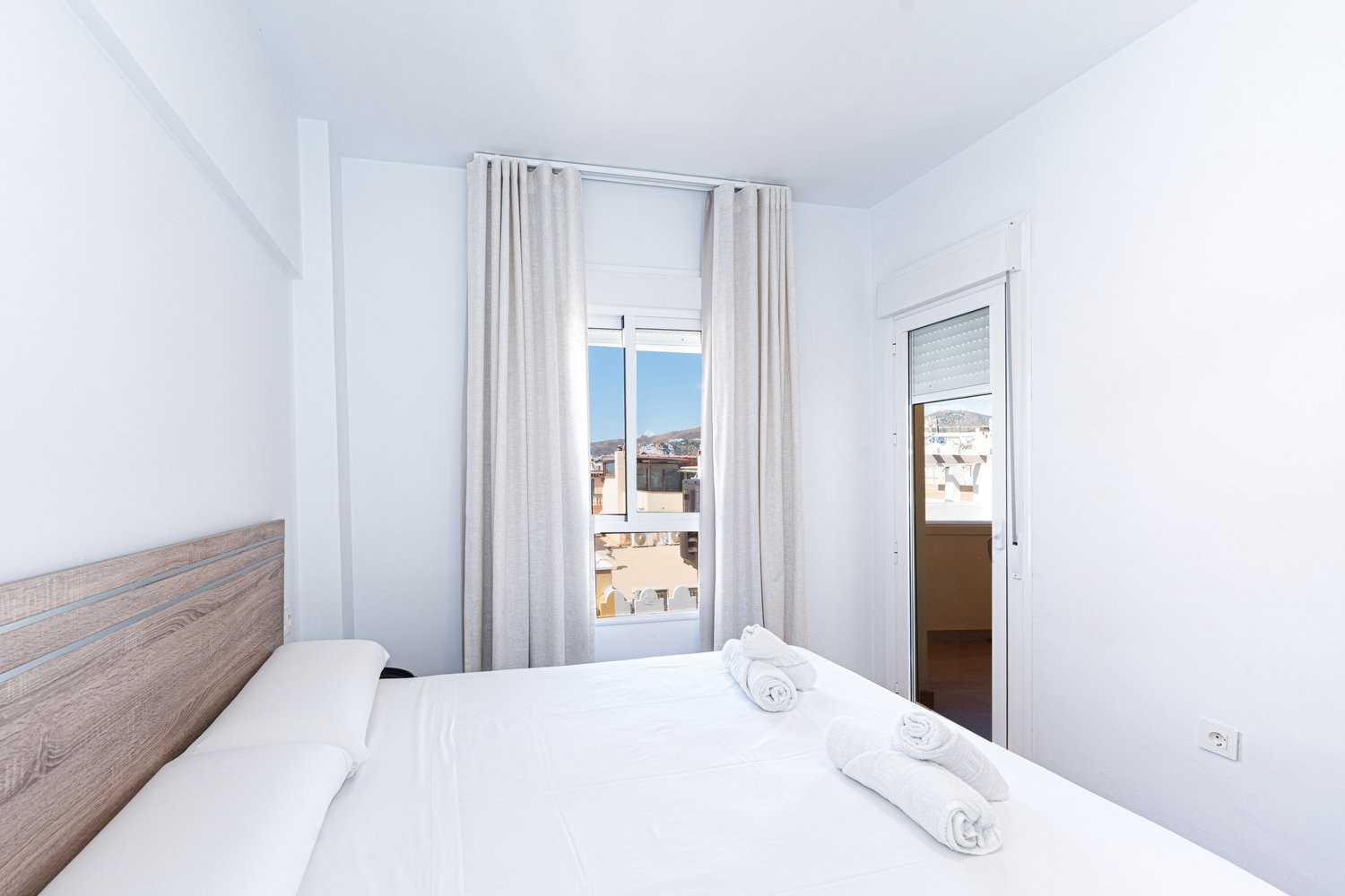 El apartamento cuenta con dos dormitorios: uno con una cama doble de alta calidad y otro con dos camas individuales, lo que ofrece comodidad y espacio para hasta 4 personas. También tiene un acogedor balcón, ideal para relajarse y disfrutar de su desayuno matutino.