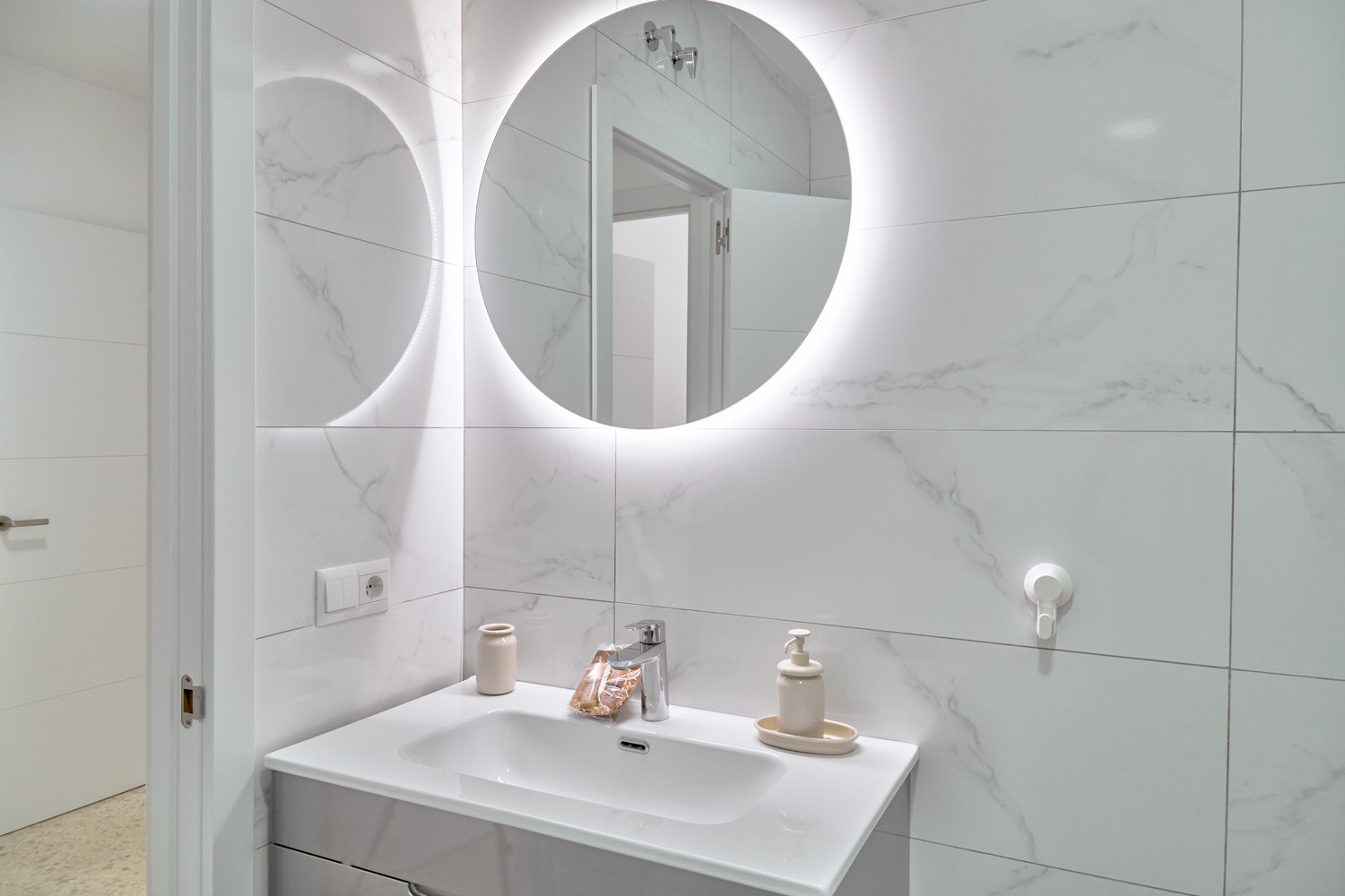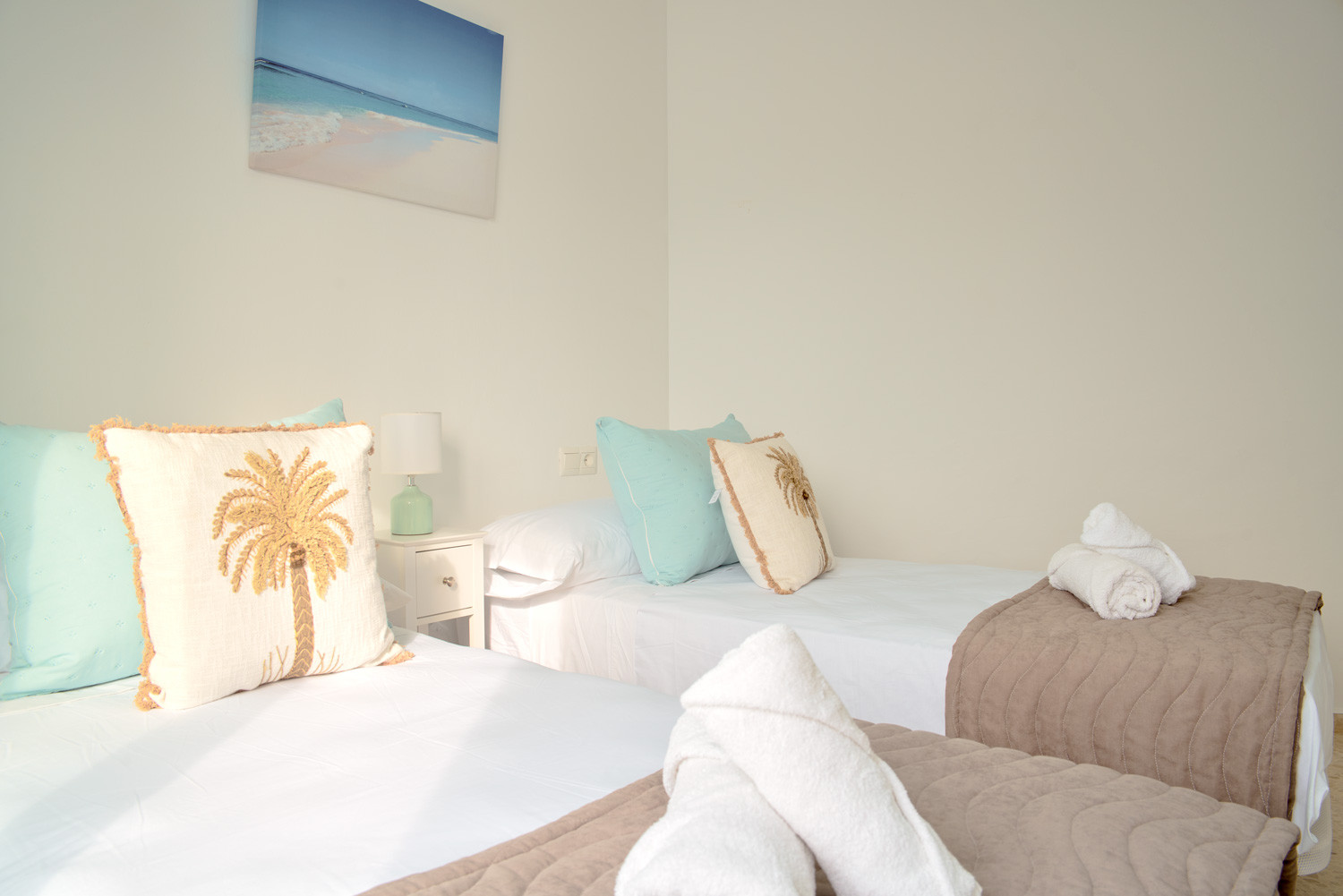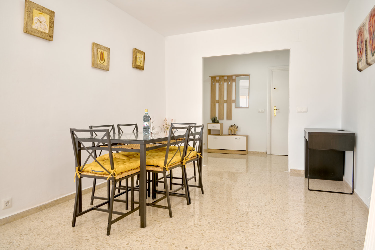 Vida interior y exterior: El salón es el núcleo de la vivienda, un espacio diáfano donde la mesa de comedor y el sofá se benefician de la claridad que entra por el ventanal. La transición al exterior es fluida: una terracita orientada al sur perfecta para leer o tomar algo bajo el sol. Además, la zona de colada en el patio interior facilita la logística de las toallas tras un día de playa.