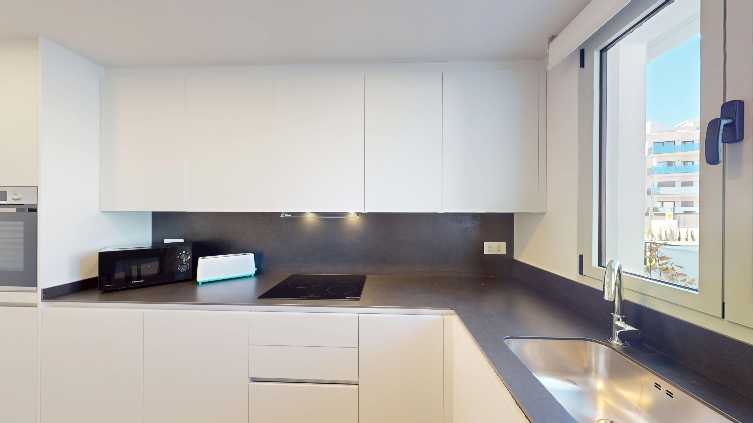 El apartamento cuenta con tres dormitorios, dos de ellos con cama doble y dos con camas individuales. Dispone de dos baños con ducha, garantizando comodidad y privacidad para todos los huéspedes. La cocina americana está totalmente equipada con electrodomésticos de última generación, incluyendo lavadora, lavavajillas, horno, microondas, cafetera y una amplia variedad de menaje.