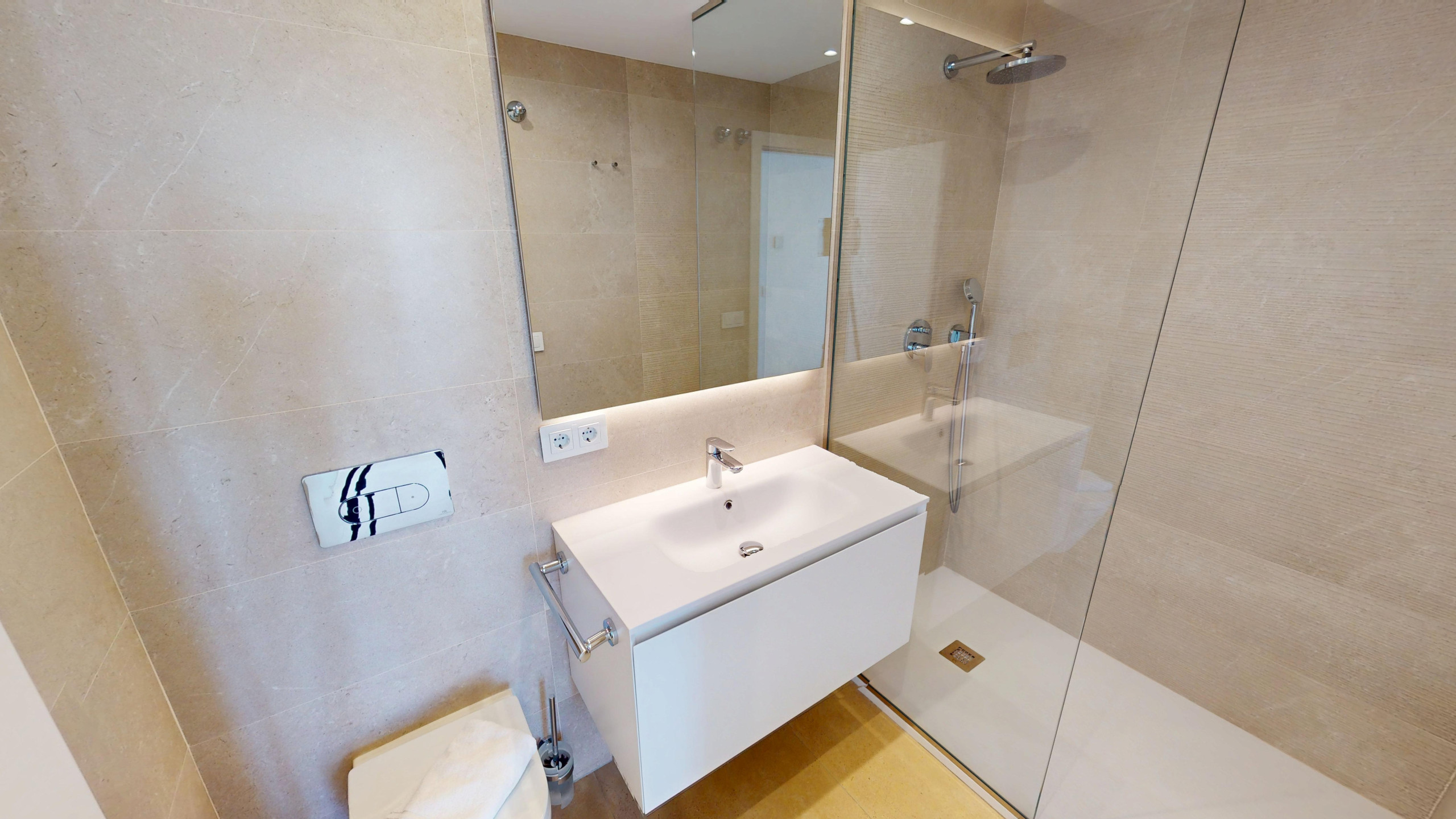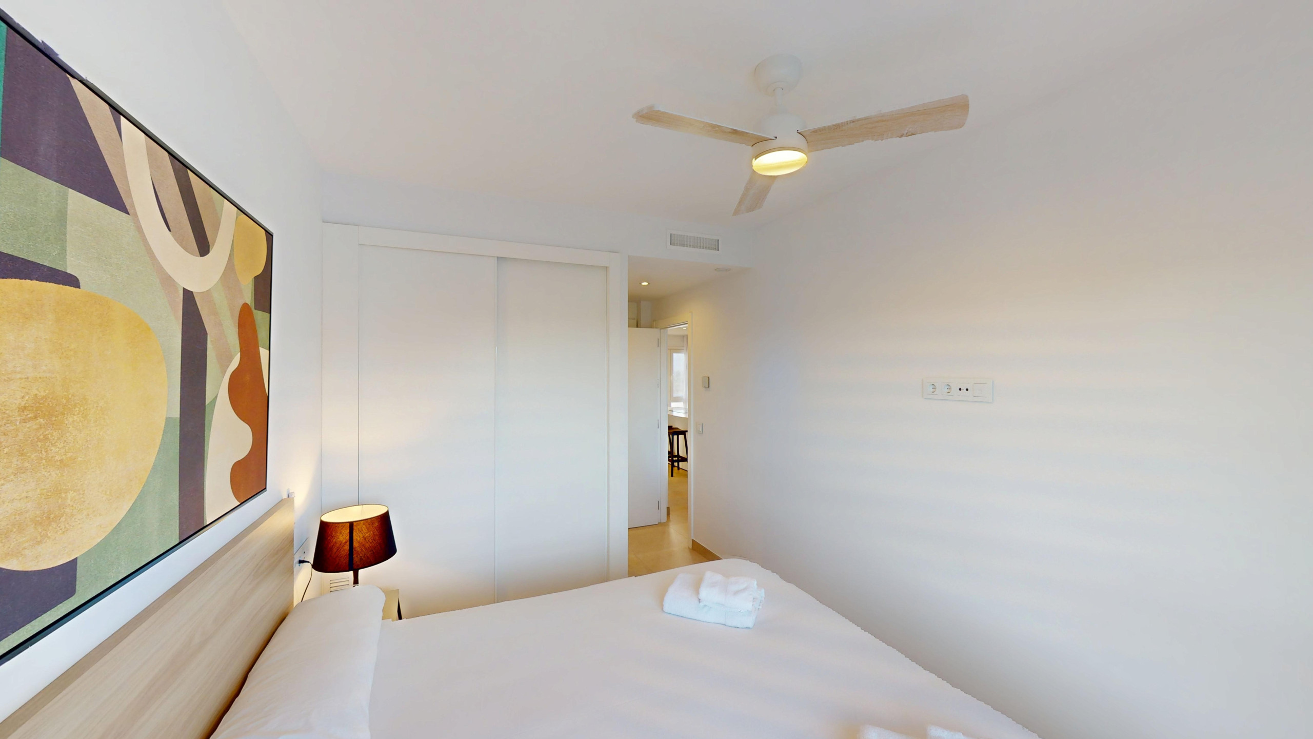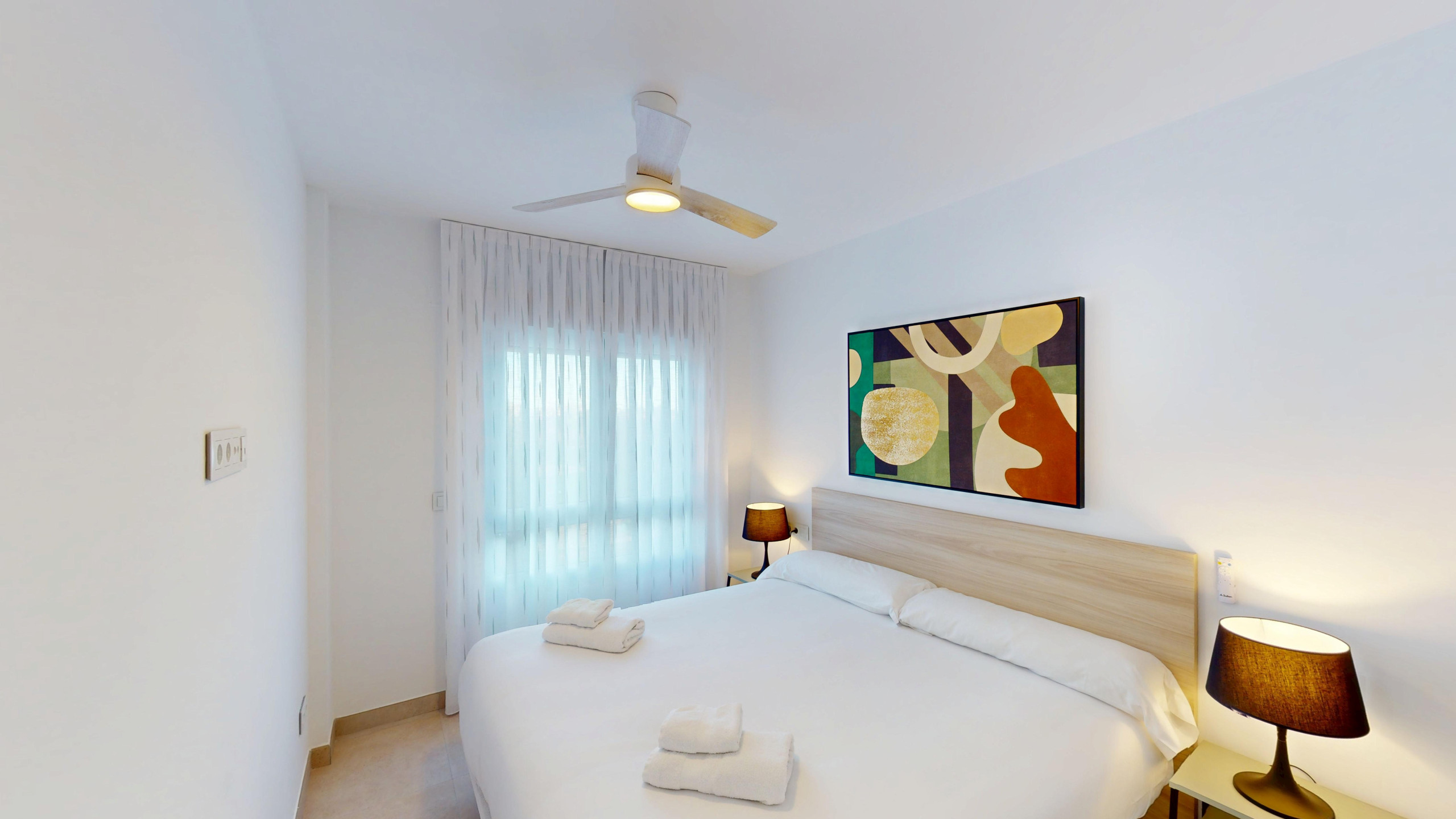 El apartamento cuenta con dos dormitorios completamente equipados: un dormitorio principal con cama matrimonial y dos dormitorios individuales. Dispone de dos baños completos con ducha