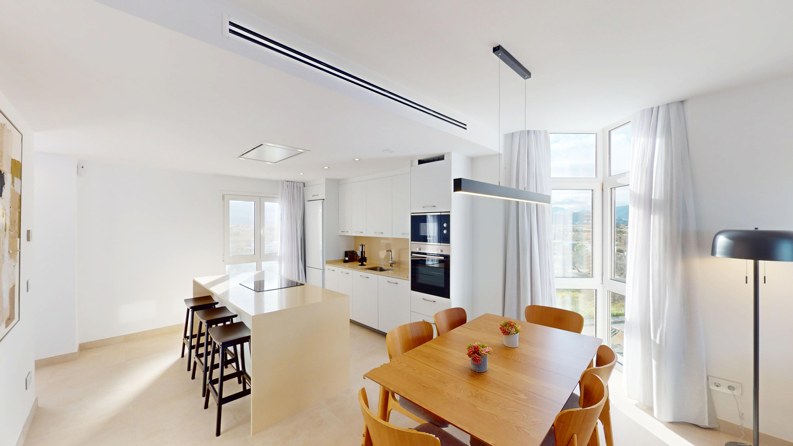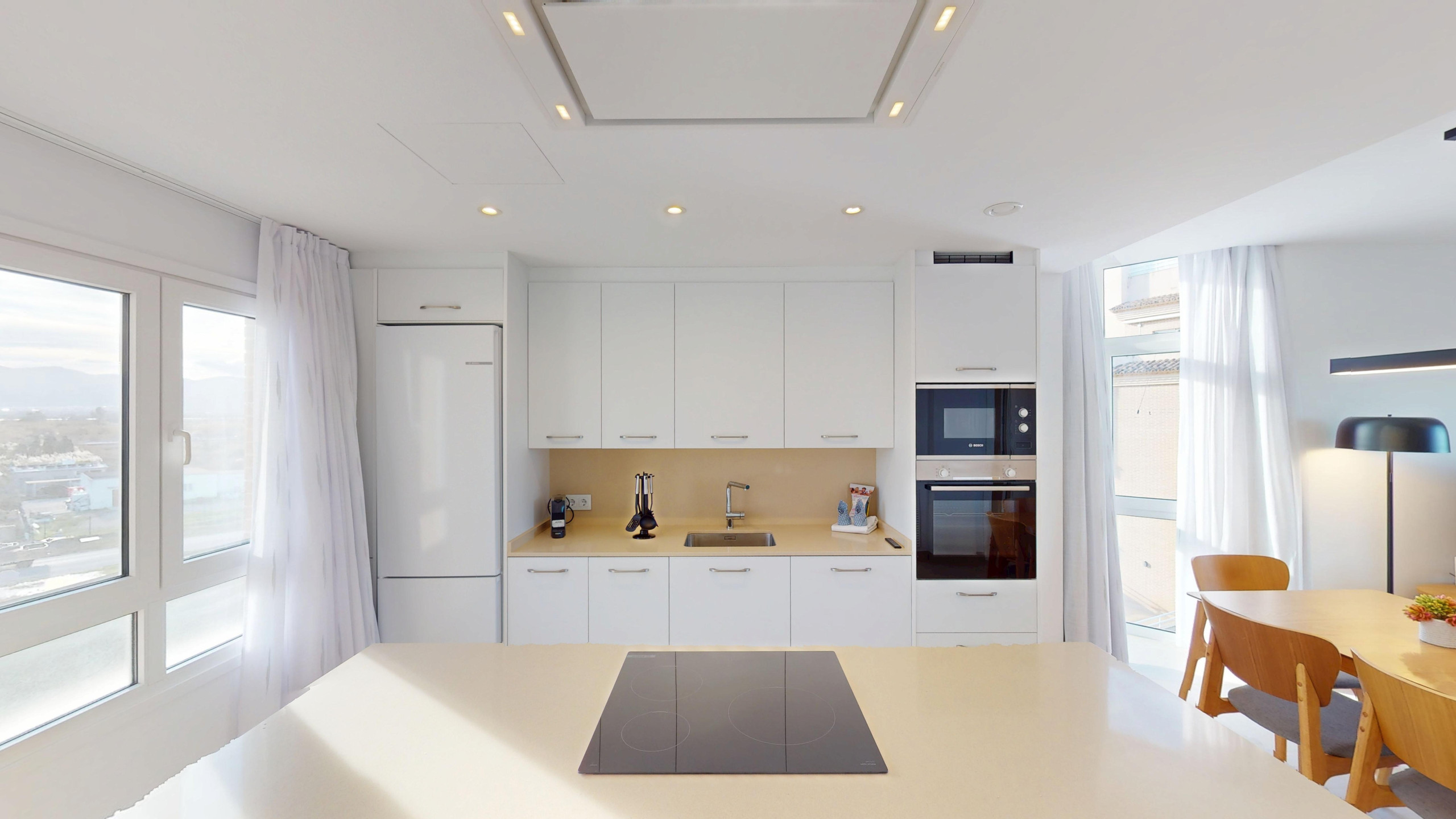 La cocina americana totalmente equipada es un punto destacado, con electrodomésticos modernos como lavadora, lavavajillas, horno, microondas, cafetera, tostadora, y una completa dotación de menaje. Además, cuenta con aire acondicionado y bomba de calor para mantener una temperatura perfecta en cualquier época del año.