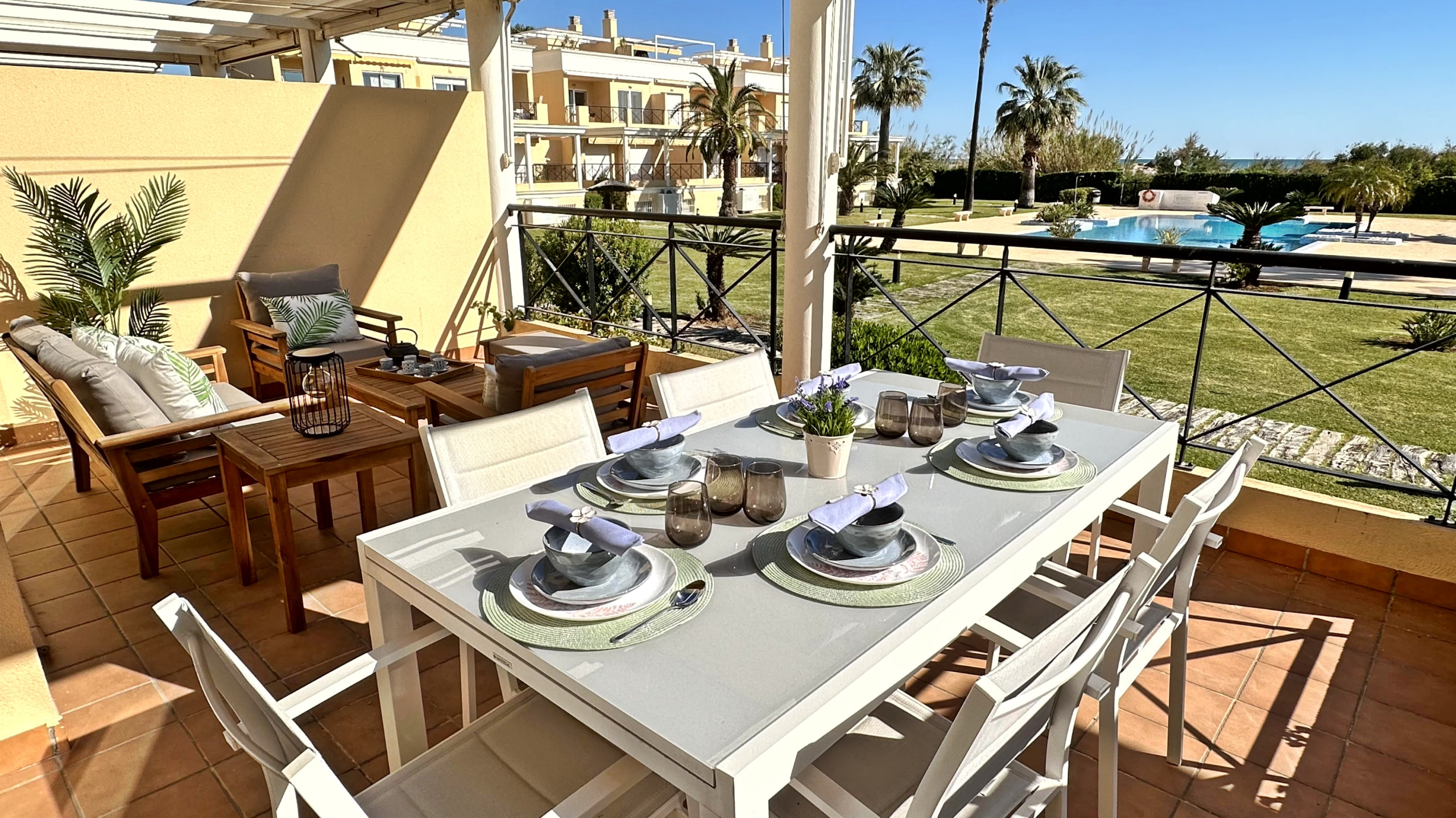 - El complejo CASAS DEL MAR, se encuentra en primera línea de playa, a escasos 500 metros del hotel Oliva Nova Beach & Golf Resort, a 600 metros del Club de Golf, así como a 1.5 Kilómetros del MET ( Mediterranean Equestrian Tour OLIVA NOVA).