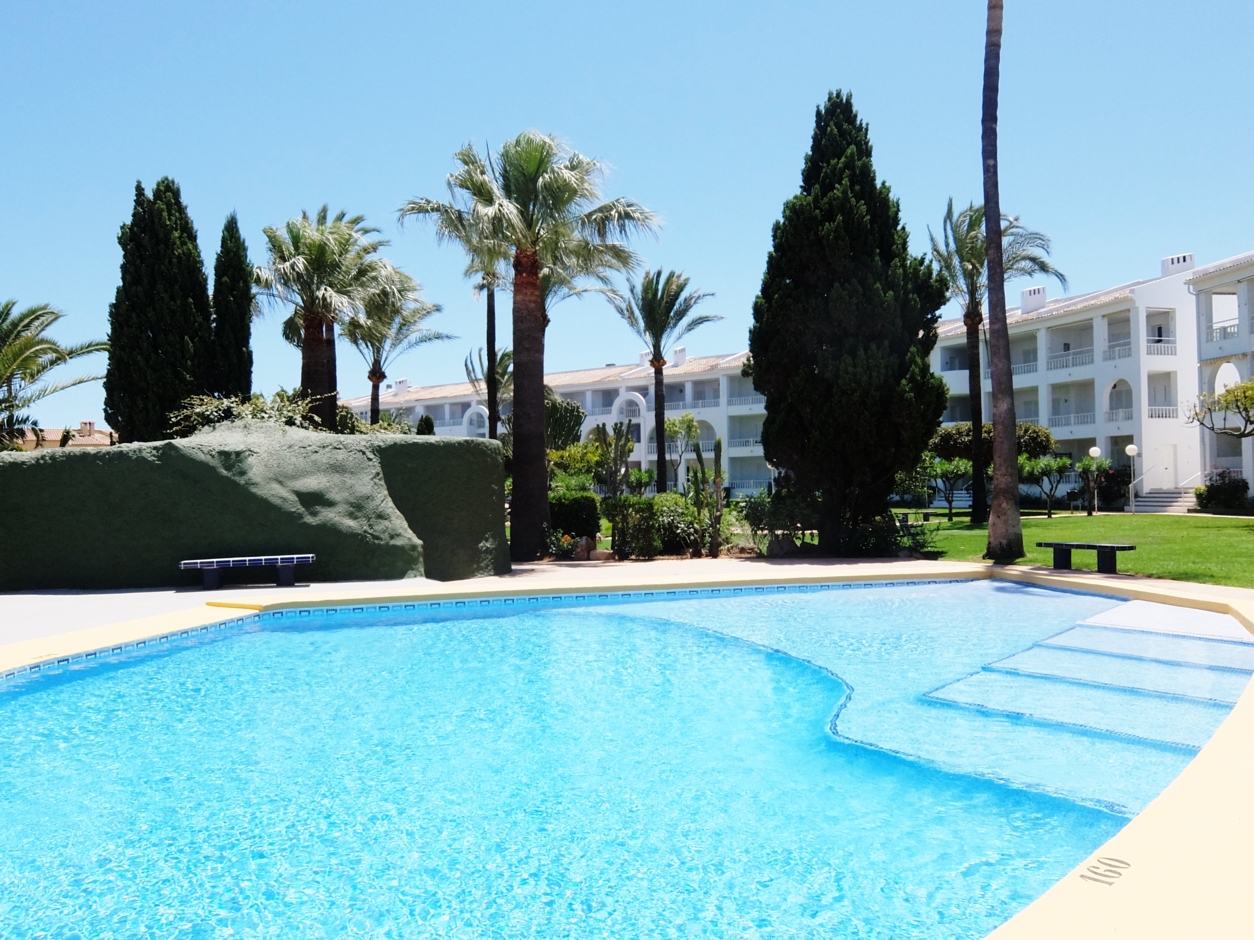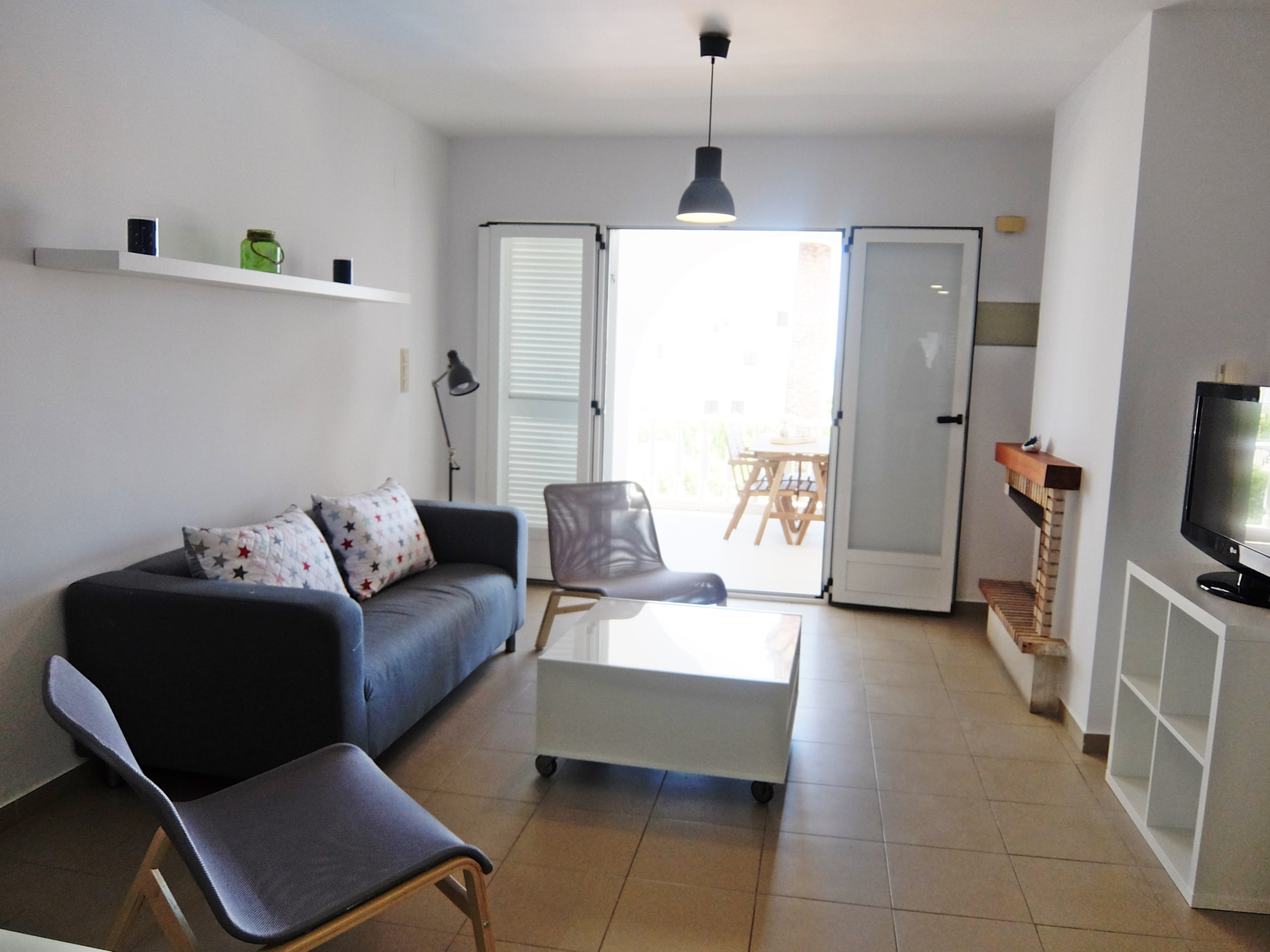Apartamento de 2 dormitorios (1 con cama de matrimonio y otro con 2 camas.), amplio salón comedor con chimenea, cocina equipada, 2 cuartos de baño completos con ducha y amplia terraza amueblada, con vistas a la piscina, al jardín y a la playa