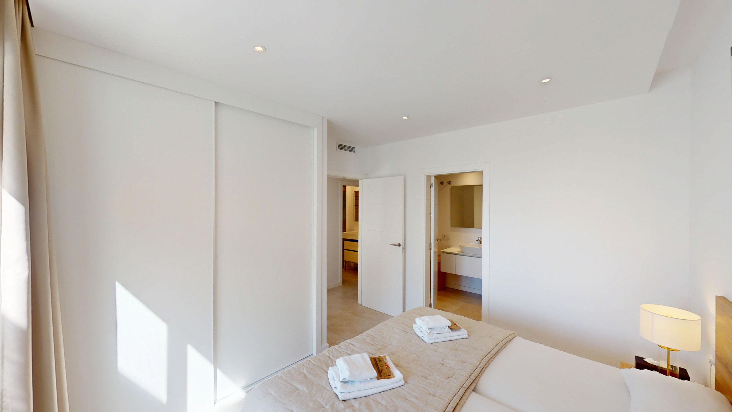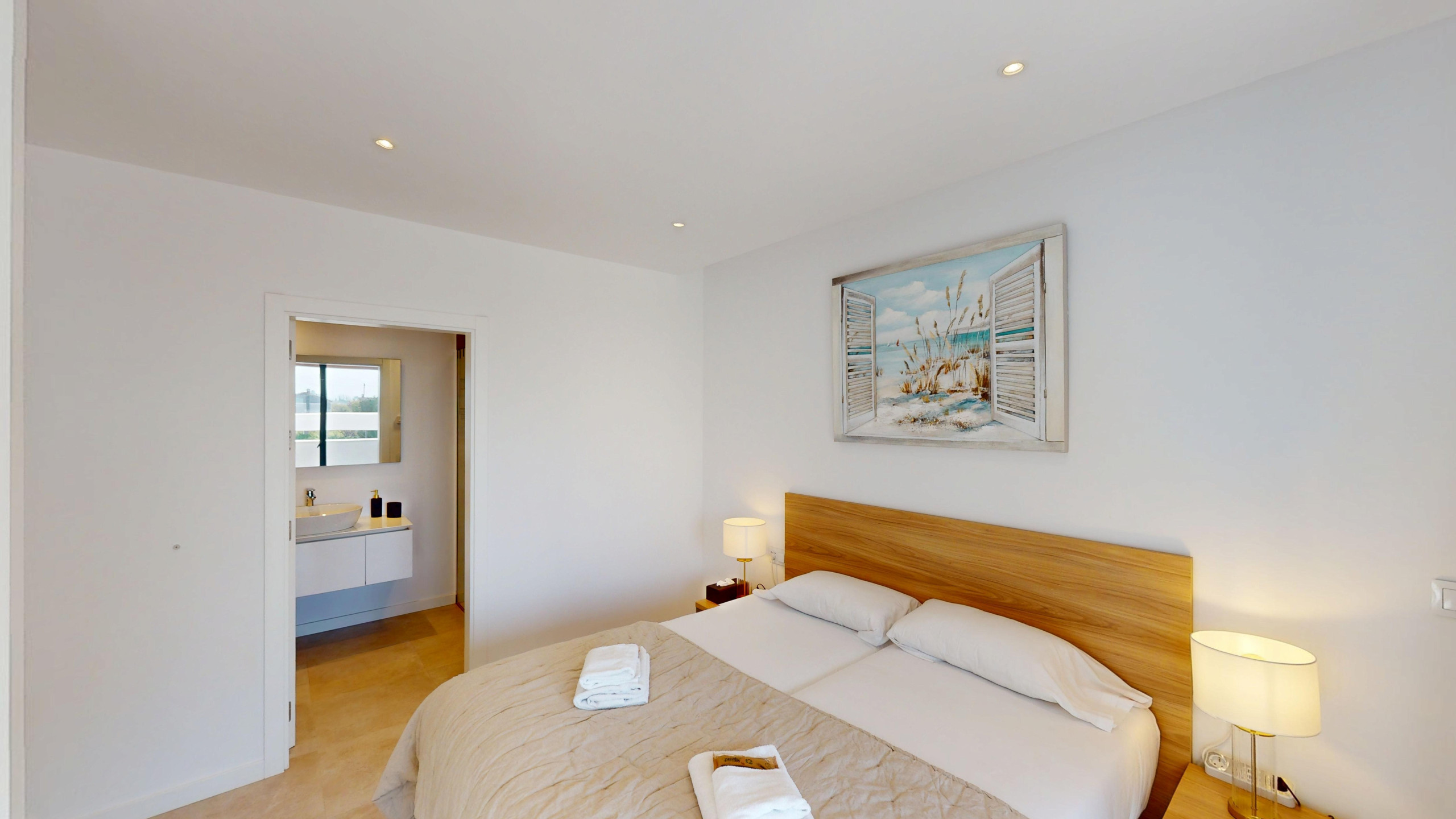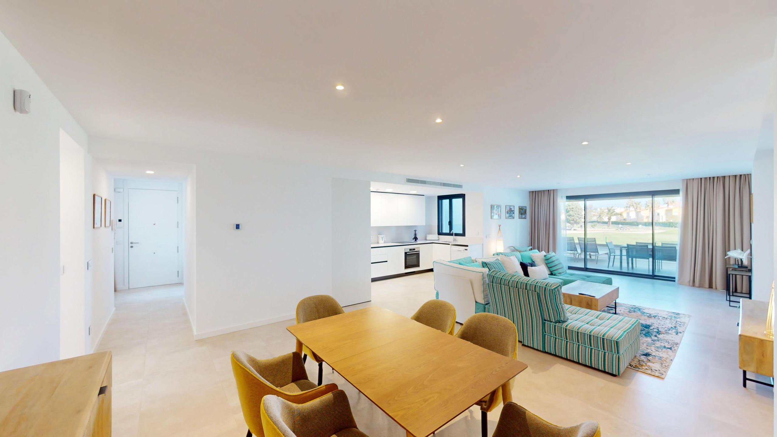 El apartamento cuenta con 2 dormitorios y 2 baños. Dispone de una cocina americana totalmente equipada con electrodomésticos de última generación, como nevera, congelador, lavadora, cafetera, horno y lavavajillas. Además, podrás disfrutar de una agradable terraza de 32 m2 con vistas a la montaña y al campo de golf.