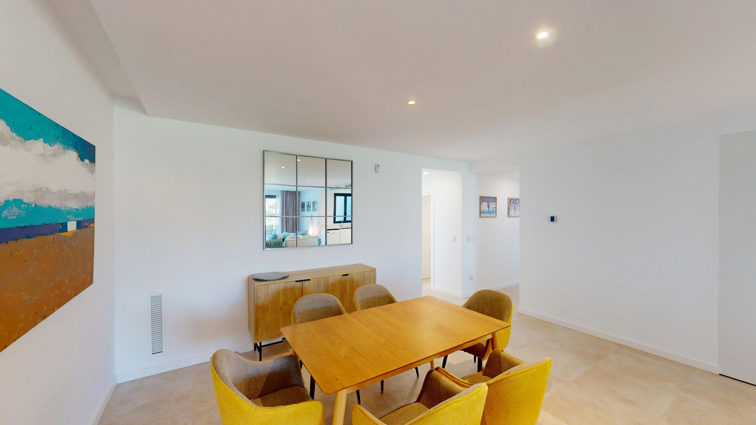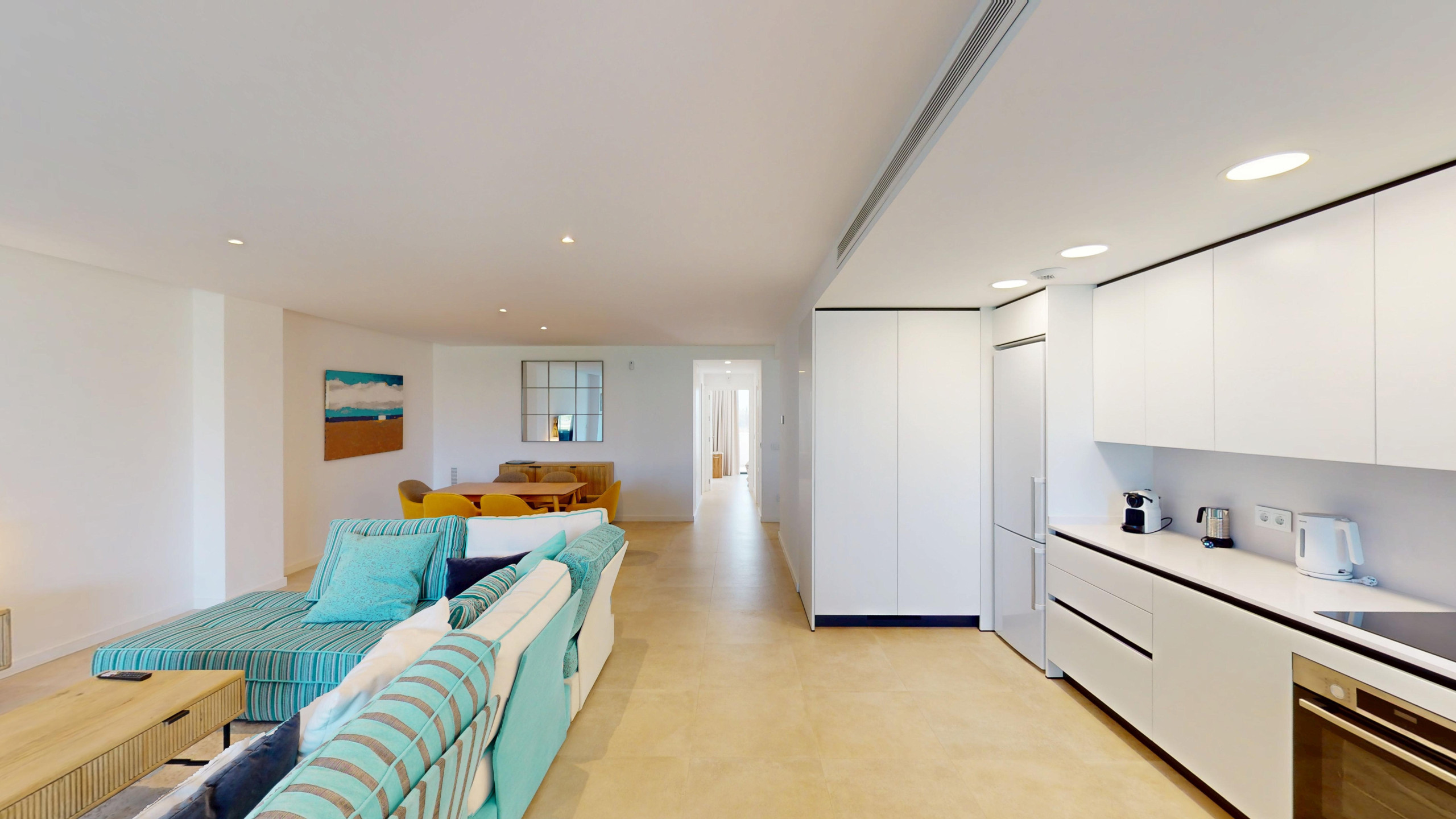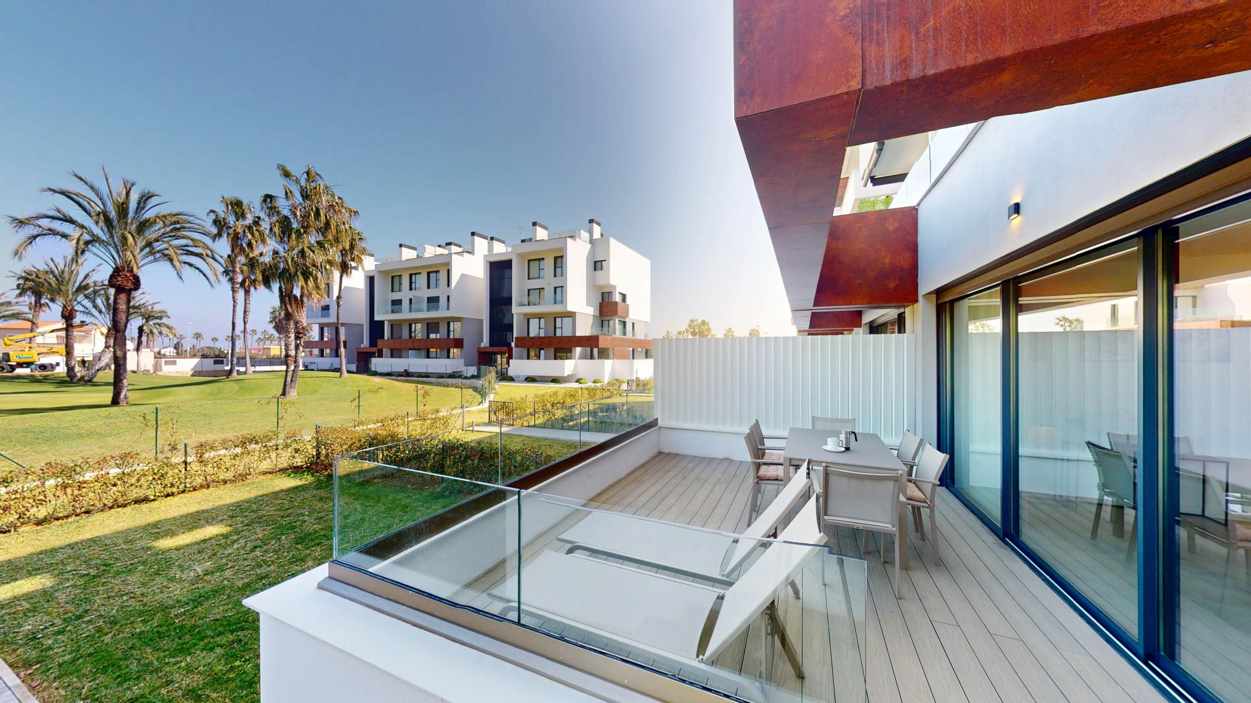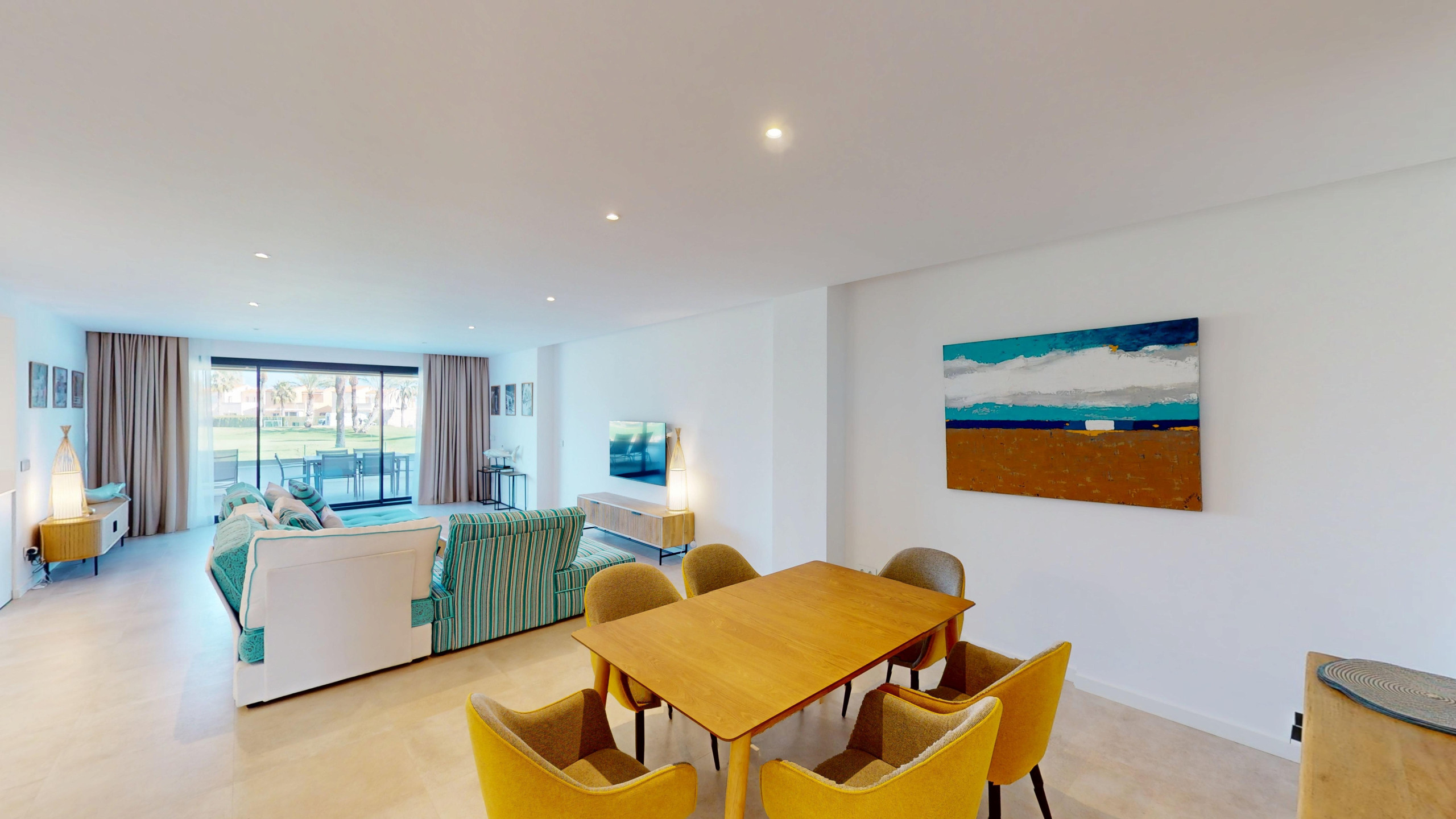 El apartamento cuenta con 2 dormitorios y 2 baños. Dispone de una cocina americana totalmente equipada con electrodomésticos de última generación, como nevera, congelador, lavadora, cafetera, horno y lavavajillas. Además, podrás disfrutar de una agradable terraza de 32 m2 con vistas a la montaña y al campo de golf.