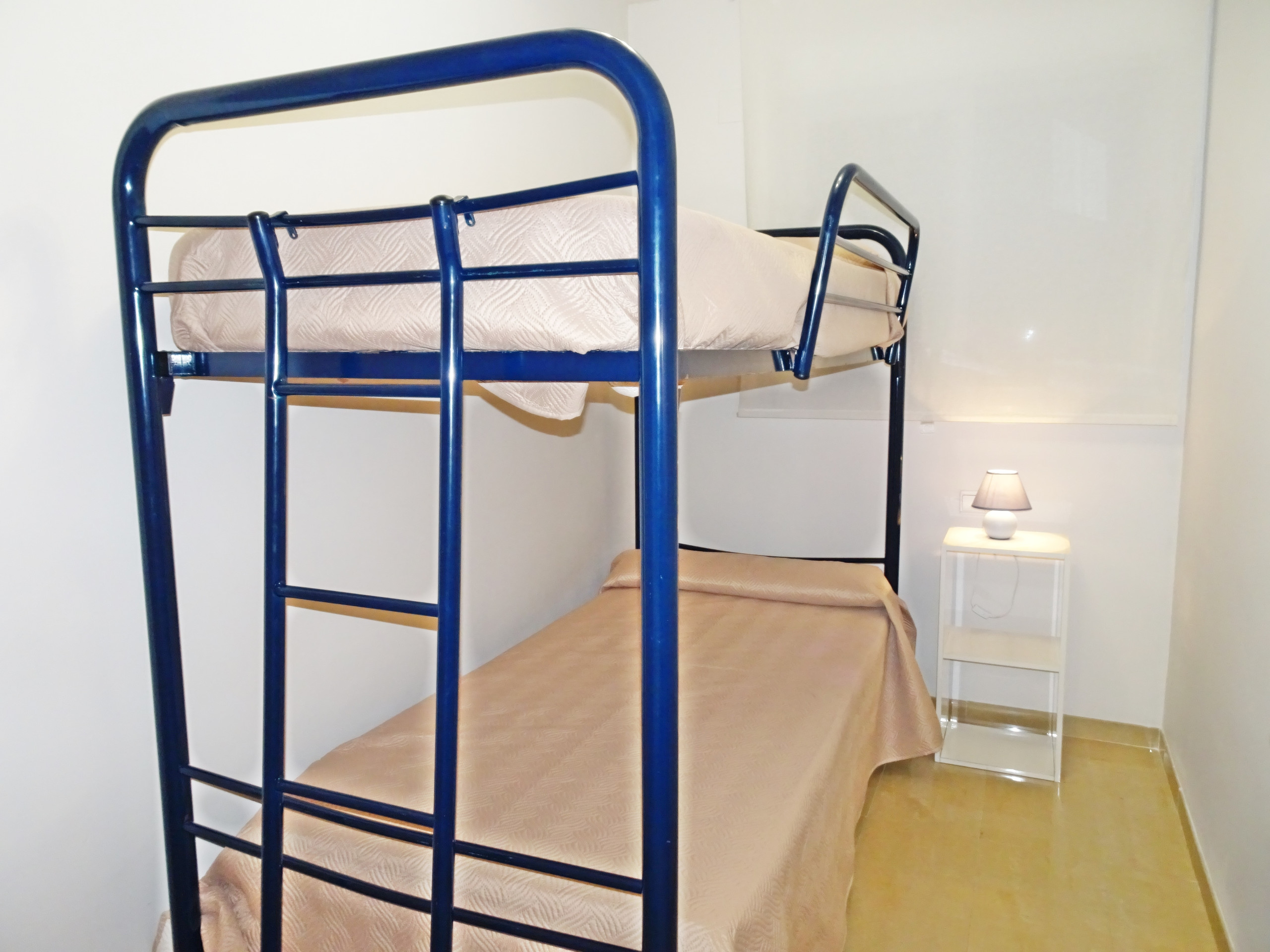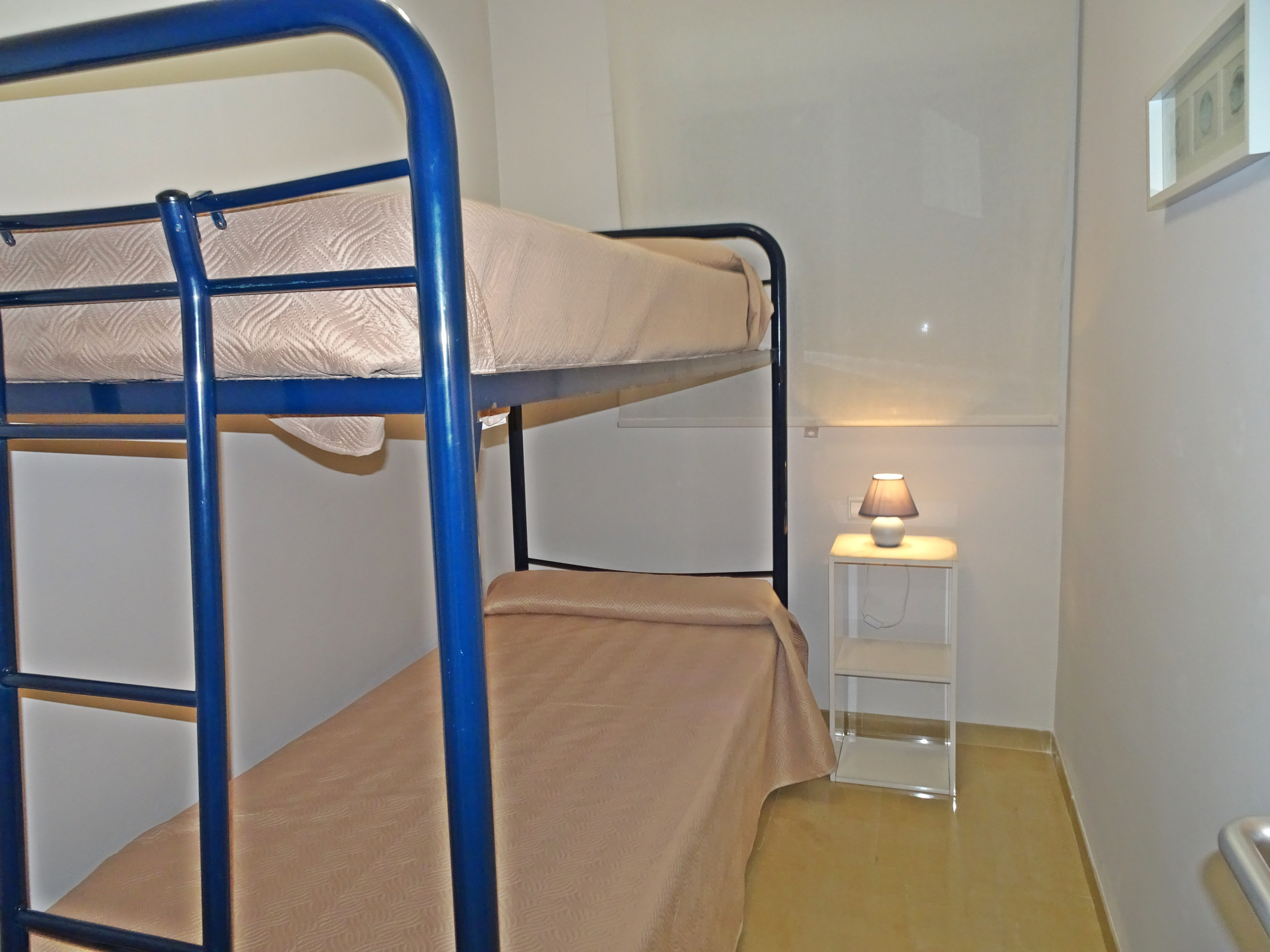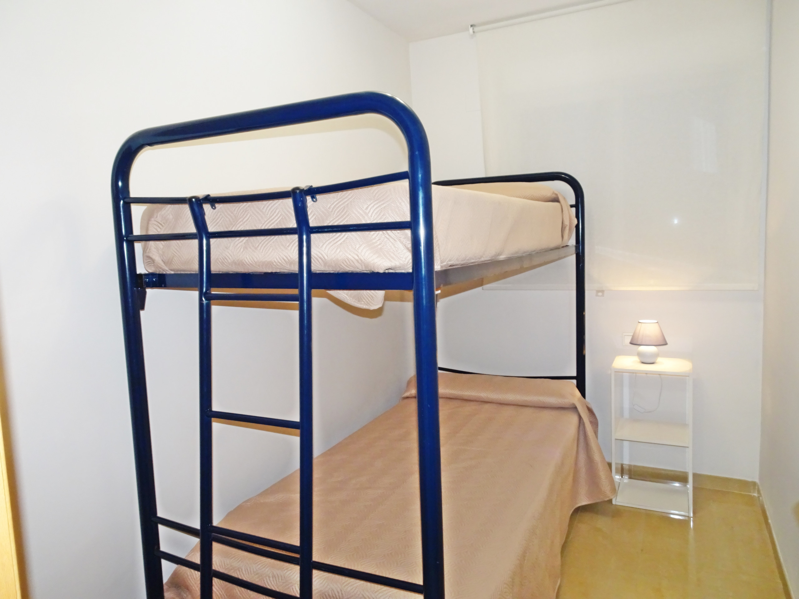 Planta Baja: un dormitorio triple, con tres camas individuales, un baño completo con ducha y garaje cerrado dentro de la vivienda.