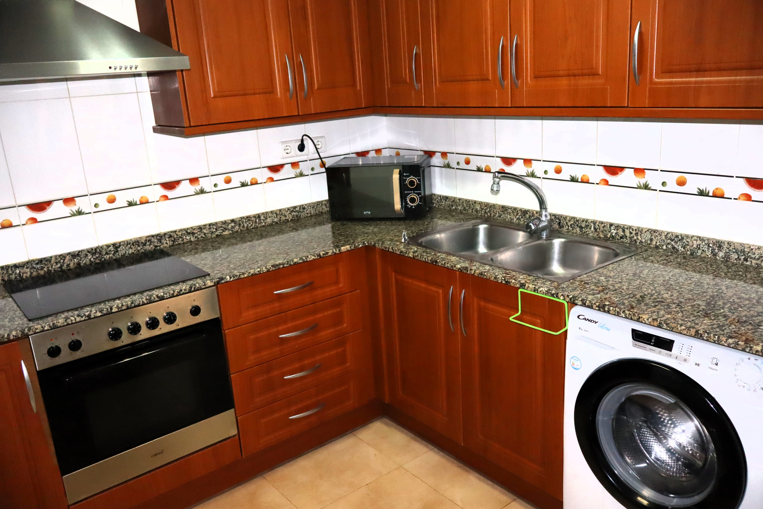 La cocina americana, de gas, está equipada con nevera, microondas, congelador, lavadora, vajilla, cubertería, utensilios de cocina y cafetera.