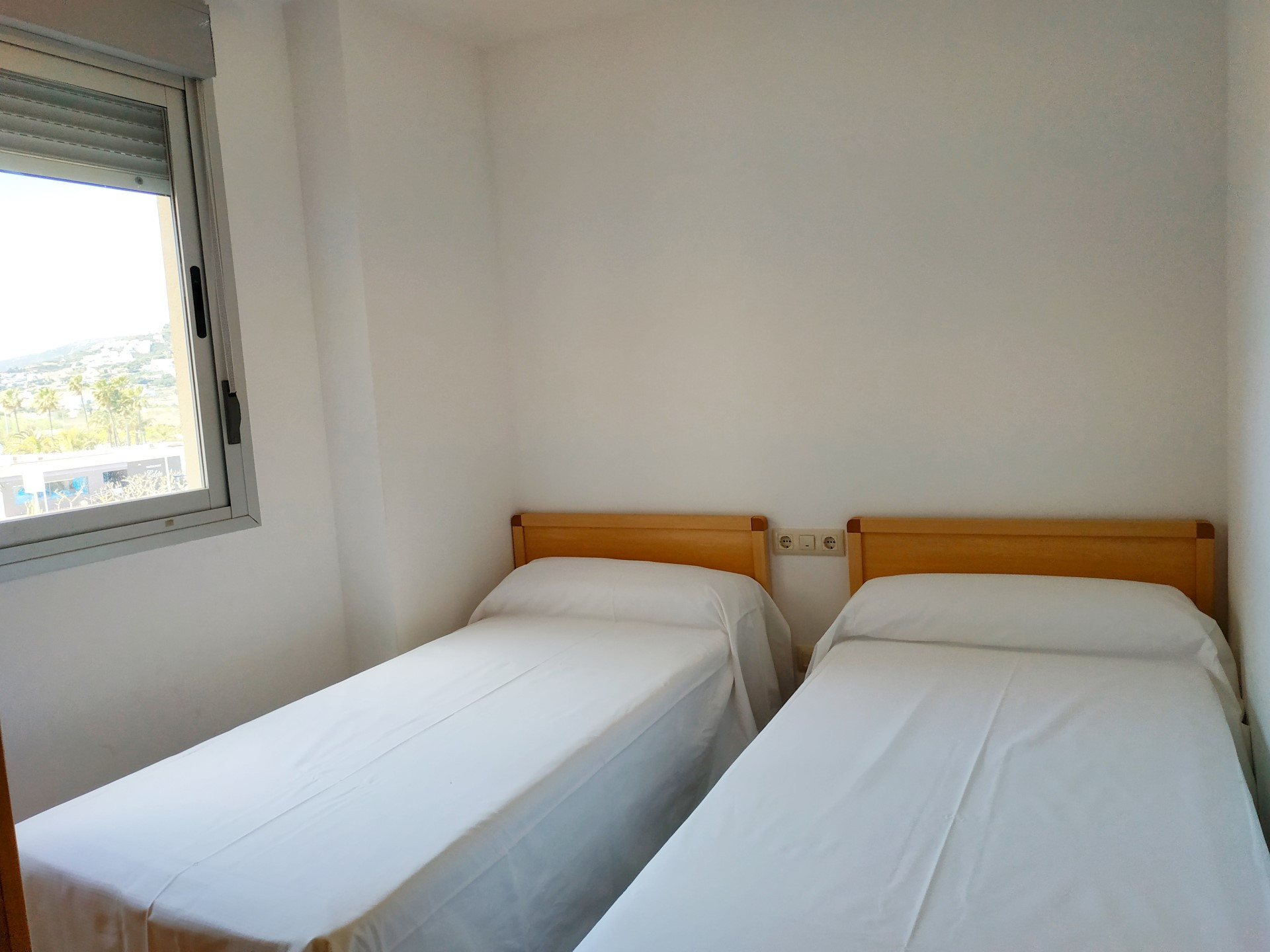 El apartamento cuenta con dos dormitorios bien distribuidos: una habitación principal con cama matrimonial y otra con dos camas individuales, además de un sofá cama en la zona común. La sala de estar dispone de aire acondicionado y una práctica cocina americana totalmente equipada con electrodomésticos como nevera, lavadora, horno, microondas y cafetera.