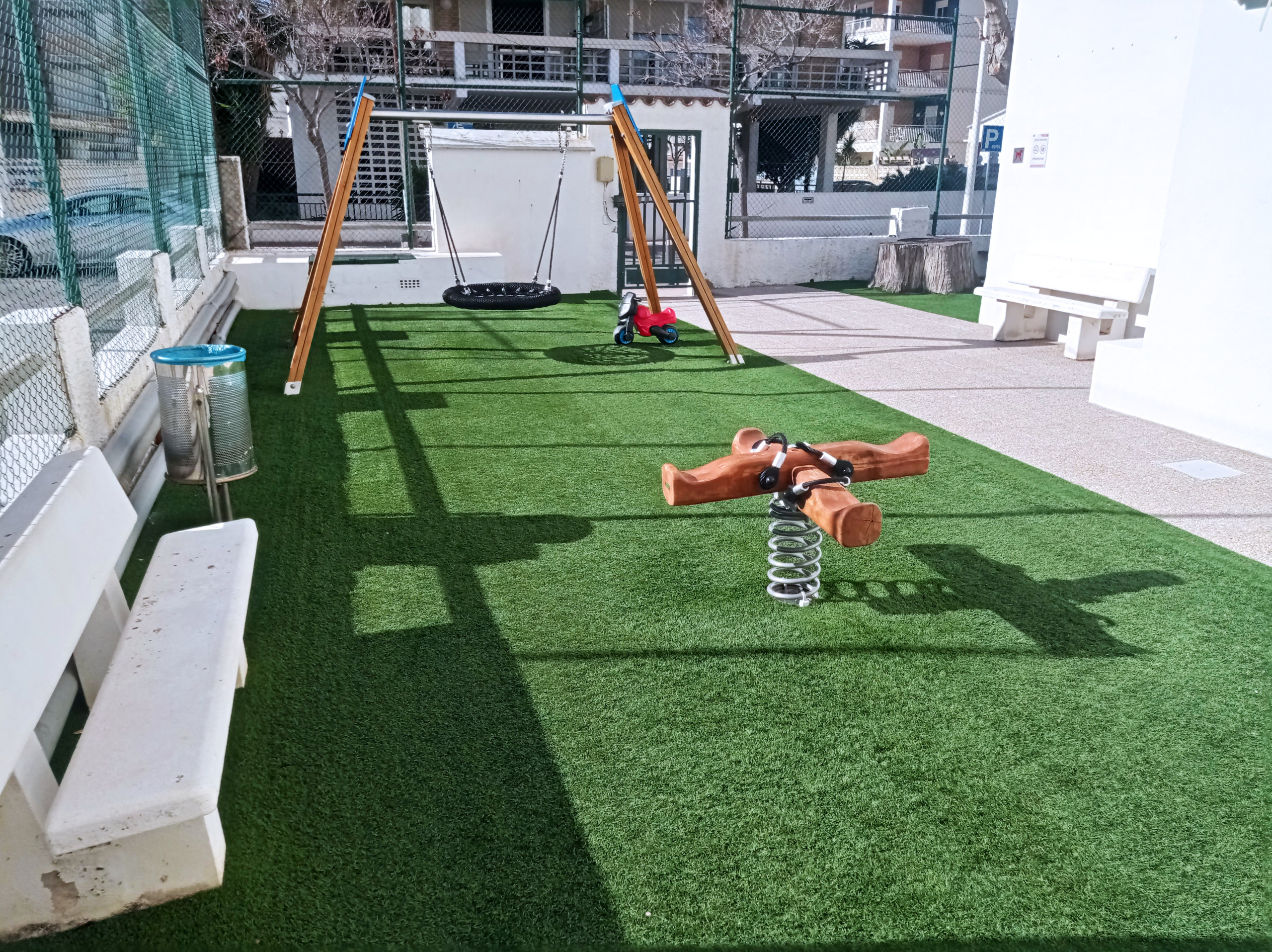 El edificio tiene piscina comunitaria con charco infantil acotado, zonas comunes con pequeño parque con columpios, y pista de tenis.