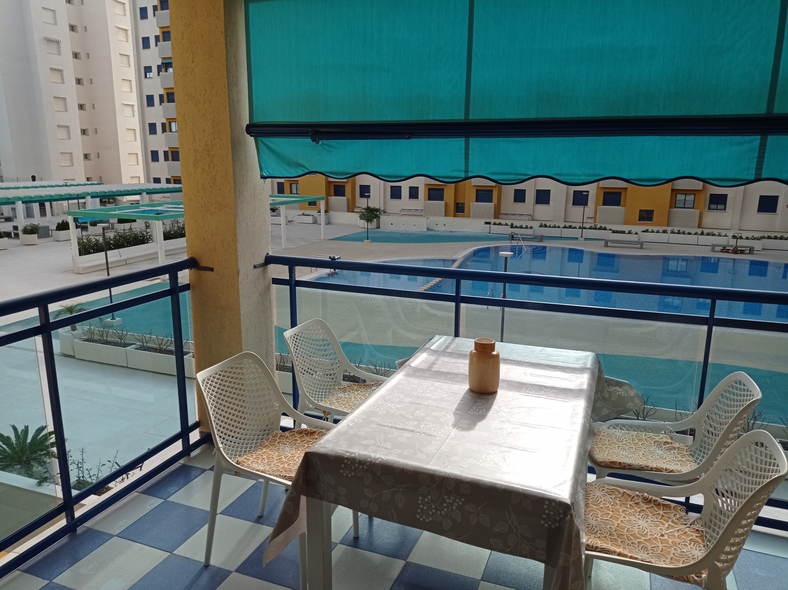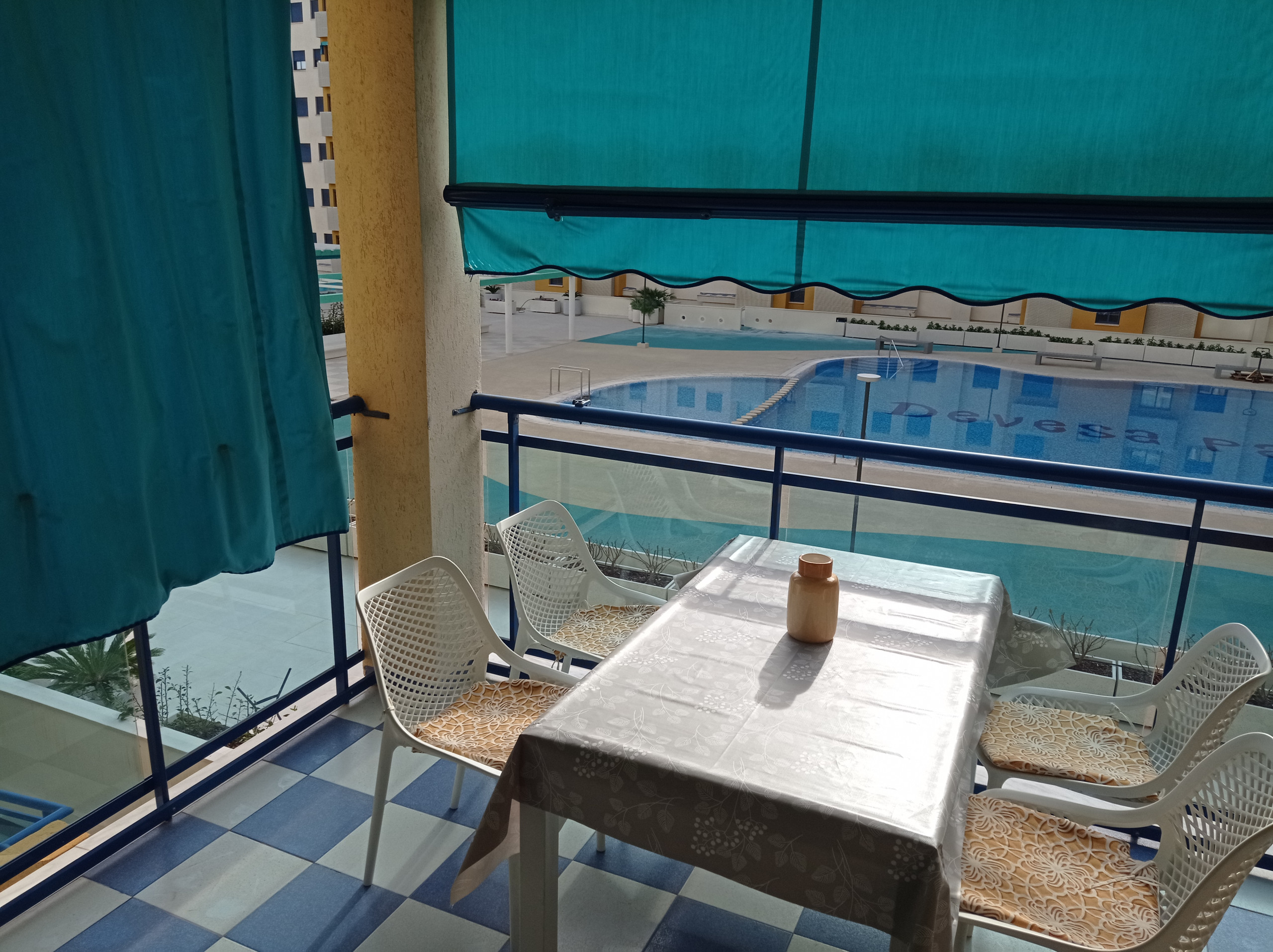 Bonito y acogedor apartamento con dos dormitorios dobles, un baño completo y un aseo. Mobiliario moderno y práctico garantizando así poder disfrutar de una cómodas y confortables vacaciones. Apto. de orientación SurEste-NorOeste, todo exterior a excepción de los baños, con aire acondicionado en el salón-comedor. Cocina luminosa y espaciosa, equipado con lavavajillas. Acogedor salón-comedor, desde donde se accede a una amplia terraza amueblada con toldo y toldo-cortina, con vistas fabulosas a las zonas comunes y piscina. Incluye plaza de garaje, equipado con servicio WIFI y lavavajillas. NO SE ADMITEN MASCOTAS.