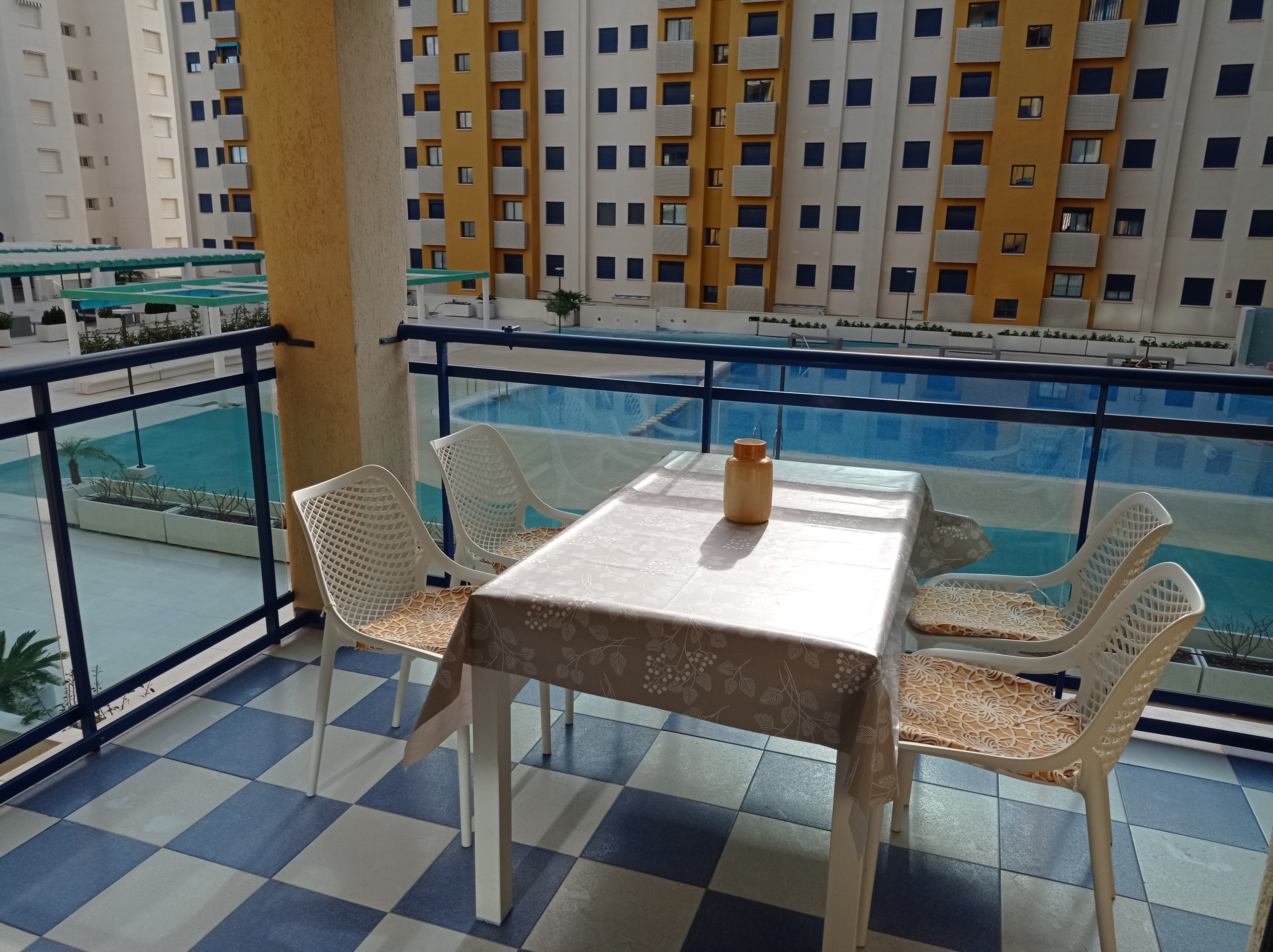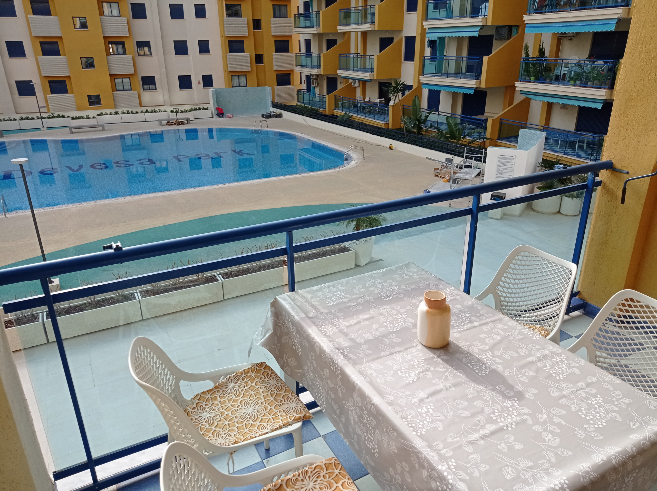 Solo familias. El apartamento Aiguablava es un apartamento de lujo que se encuentra situado en primera línea de playa de Gandia.. Por su situación es un complejo idóneo para grandes familias que busquen unas vacaciones tranquilas junto al mar. Entre la arena y el complejo encontrará un paseo peatonal , que se une al paseo marítimo, lo que le va a permitir dar largos paseos junto al mar. Además, el no tener que cruzar ninguna calle hace que sea ideal para las personas mayores o familias con niños. Desde la amplia terraza gozará de unas espectaculares vistas panorámicas, la cual podrá disfrutar las 24h del día. El complejo tiene una gran piscina con jardín artificial alrededor, zona común con wifi y tv (donde suelen verse los partidos de futbol con los vecinos), gimnasio y tenis. El apartamento está amueblado con un diseño moderno y actual.