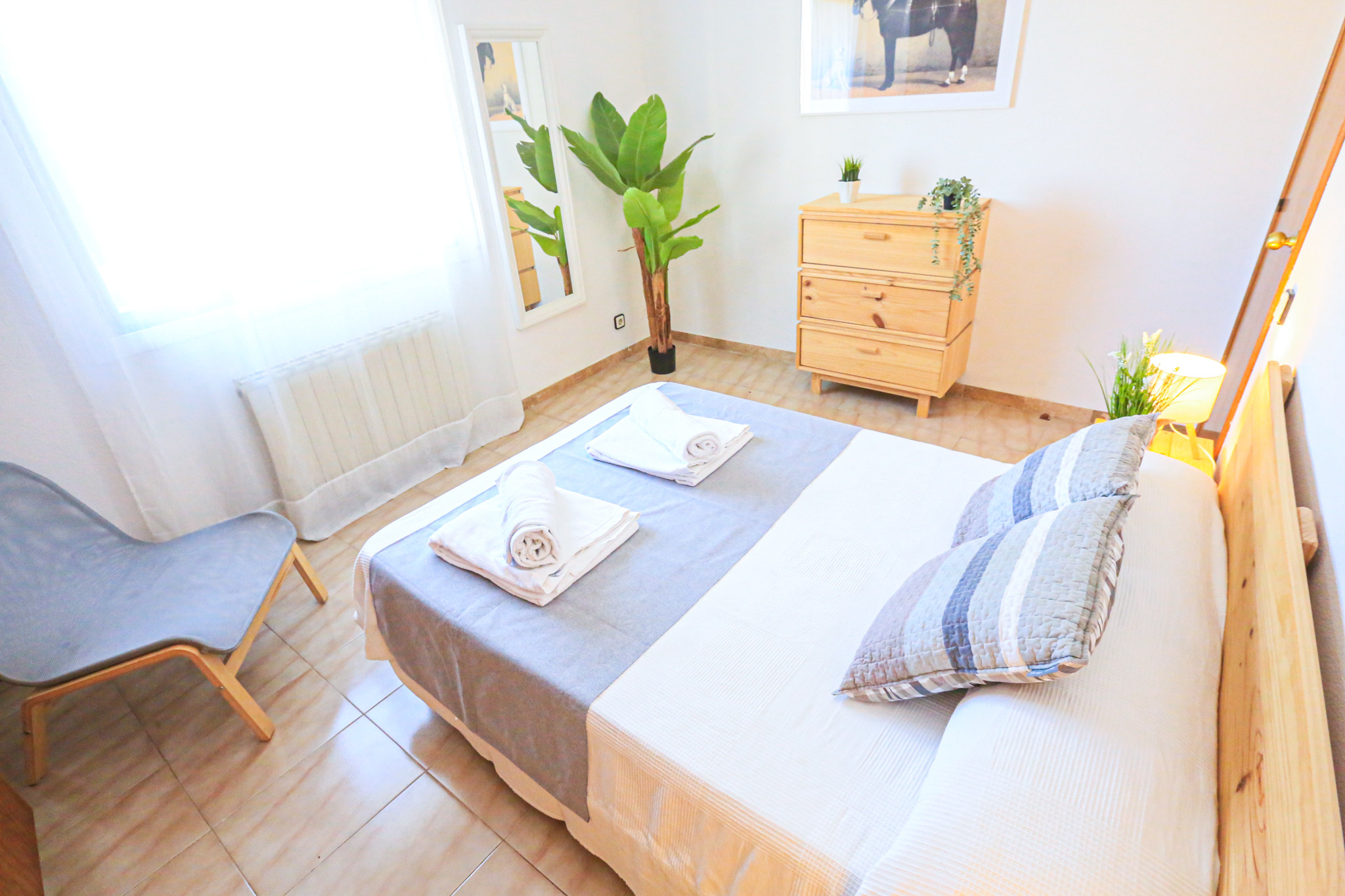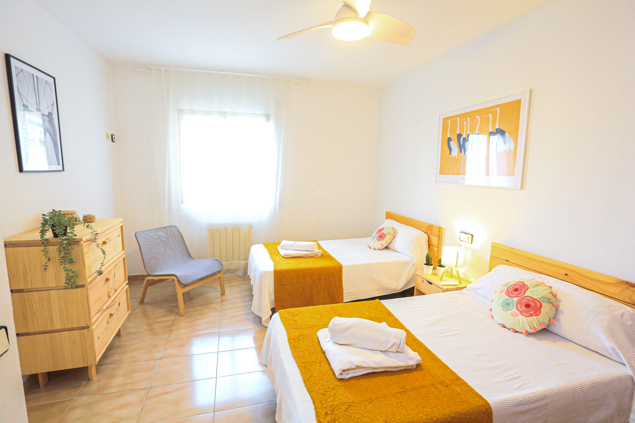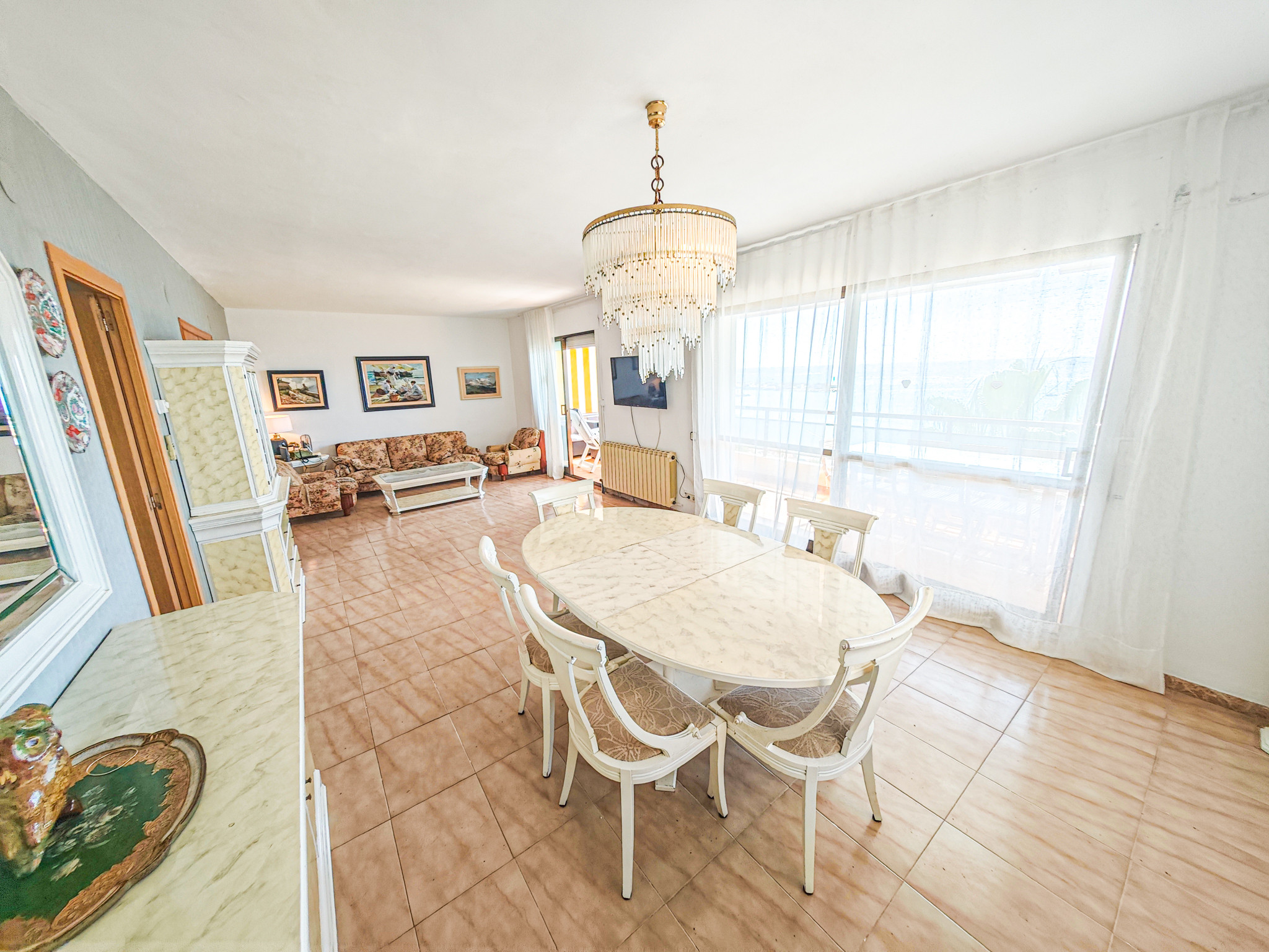 El apartameto cuenta con 4 dormitorios que pueden alojar hasta 8 personas, distribuidos con 1 cama doble, 6 camas individuales y 1 cama supletoria. Ideal para familias grandes que desean disfrutar juntos de sus vacaciones.