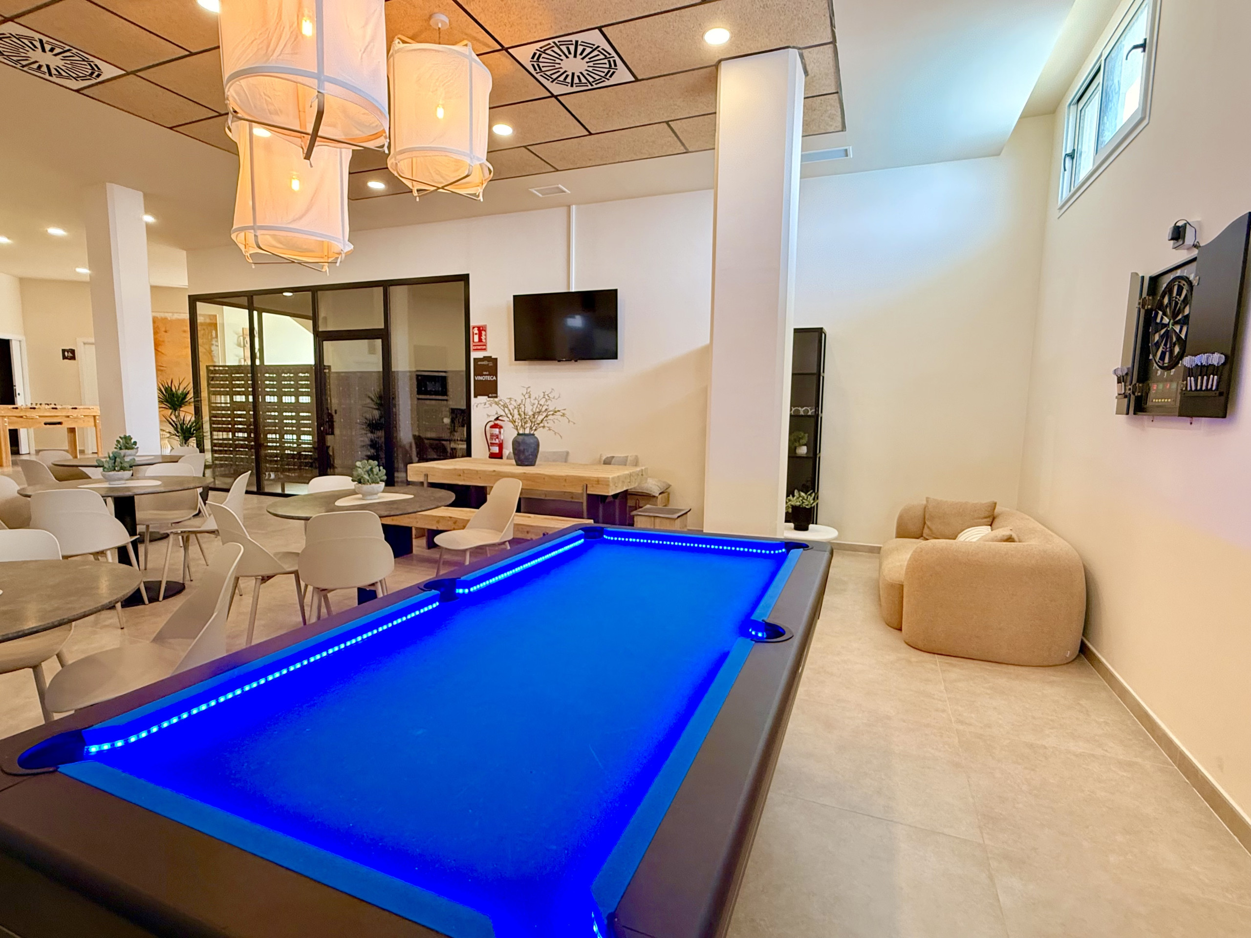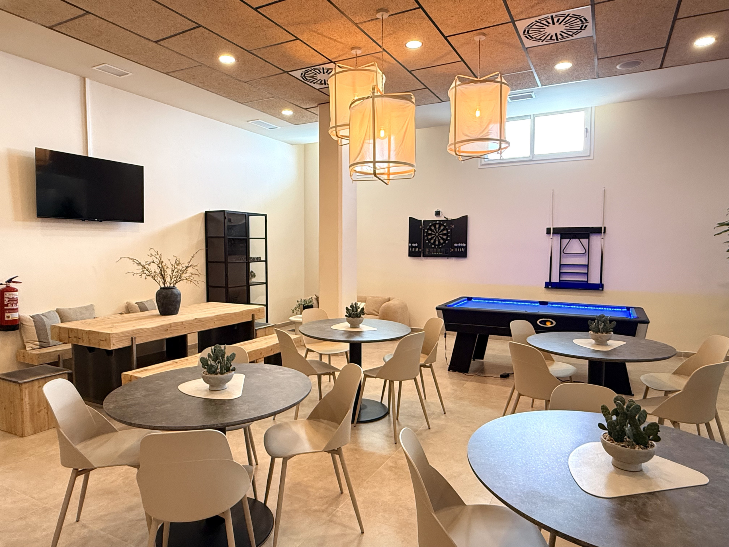 El amplio salón, bañado por luz natural, dispone de aire acondicionado, Smart TV, WiFi de alta velocidad y acceso directo a una generosa terraza privada.