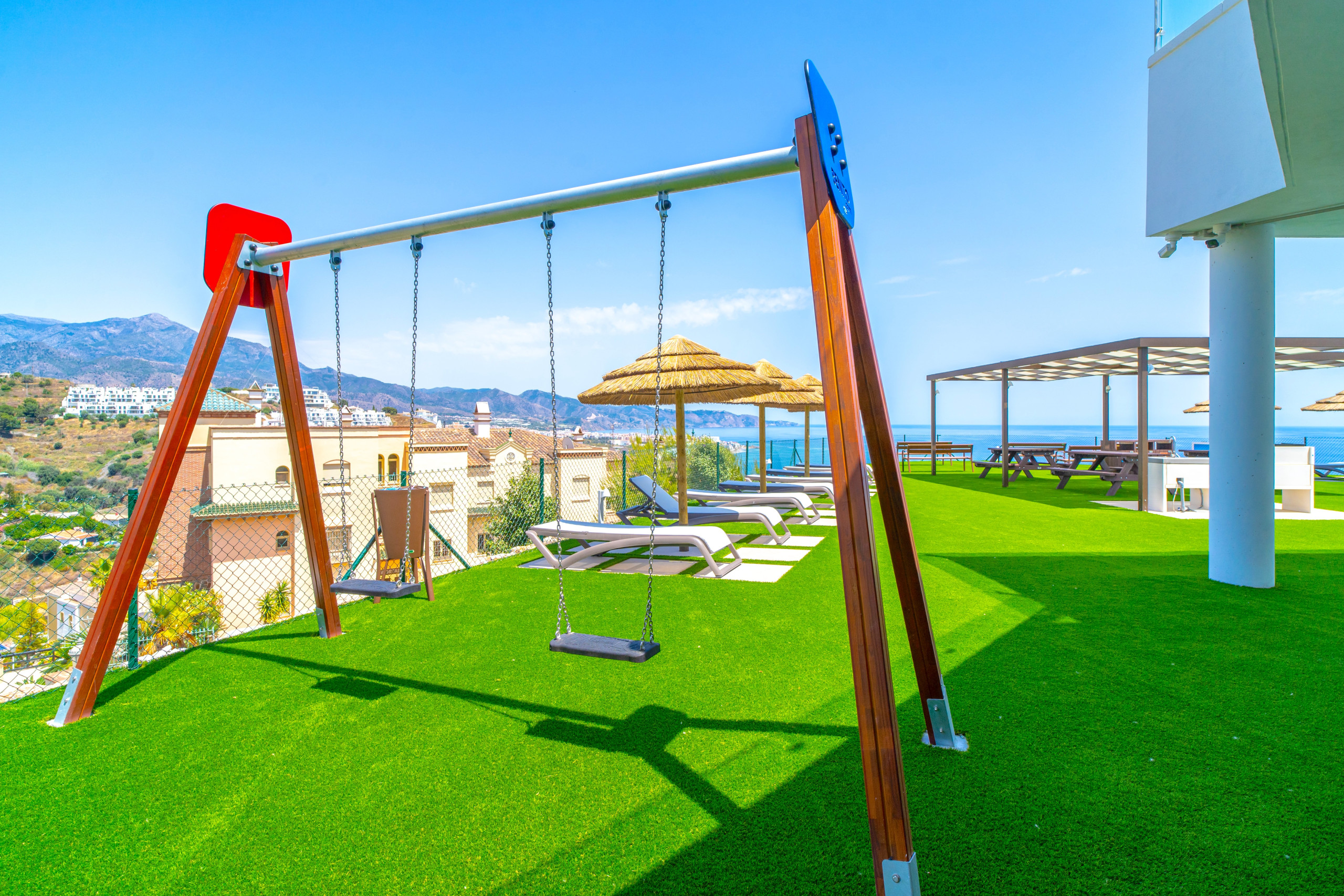 Fabuloso apartamento en la urbanización Tamango Hills entre Nerja y Torrox costa, donde disfrutará de espectaculares vistas panorámicas del mar y la playa desde su gran terraza. Este apartamento dispone de 2 dormitorios, uno con cama de matrimonio y el otro con 2 camas individuales, con una capacidad para 4 personas. También tiene 2 cuartos de baño, uno con bañera y el otro con una amplia ducha, y una cocina completamente equipada con barra que da al luminoso salón y zona de comedor. Desde ahí podrá acceder a la sensacional terraza con zona de comedor y tumbonas que, con total seguridad, usará mientras disfruta de las hipnotizantes vistas del mediterráneo que esta propiedad ofrece. También puede dirigirse a la gran piscina comunitaria de la urbanización y no se preocupe por el parking, ya que esta propiedad cuenta con plaza de garaje cubierta. En general, este apartamento tiene todo lo necesario para disfrutar de la Costa del Sol al máximo, ya sea en pareja o con familia y amigos.